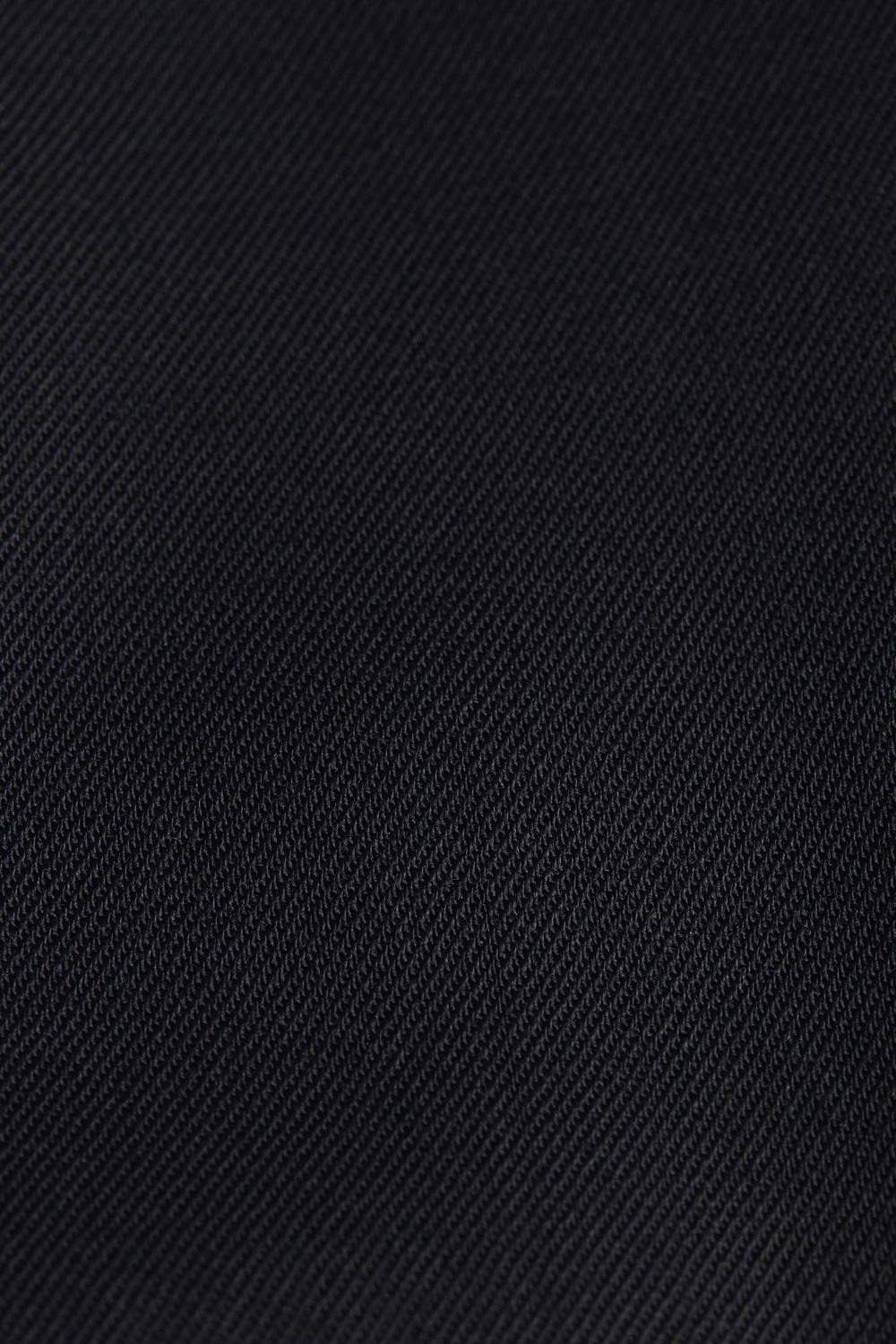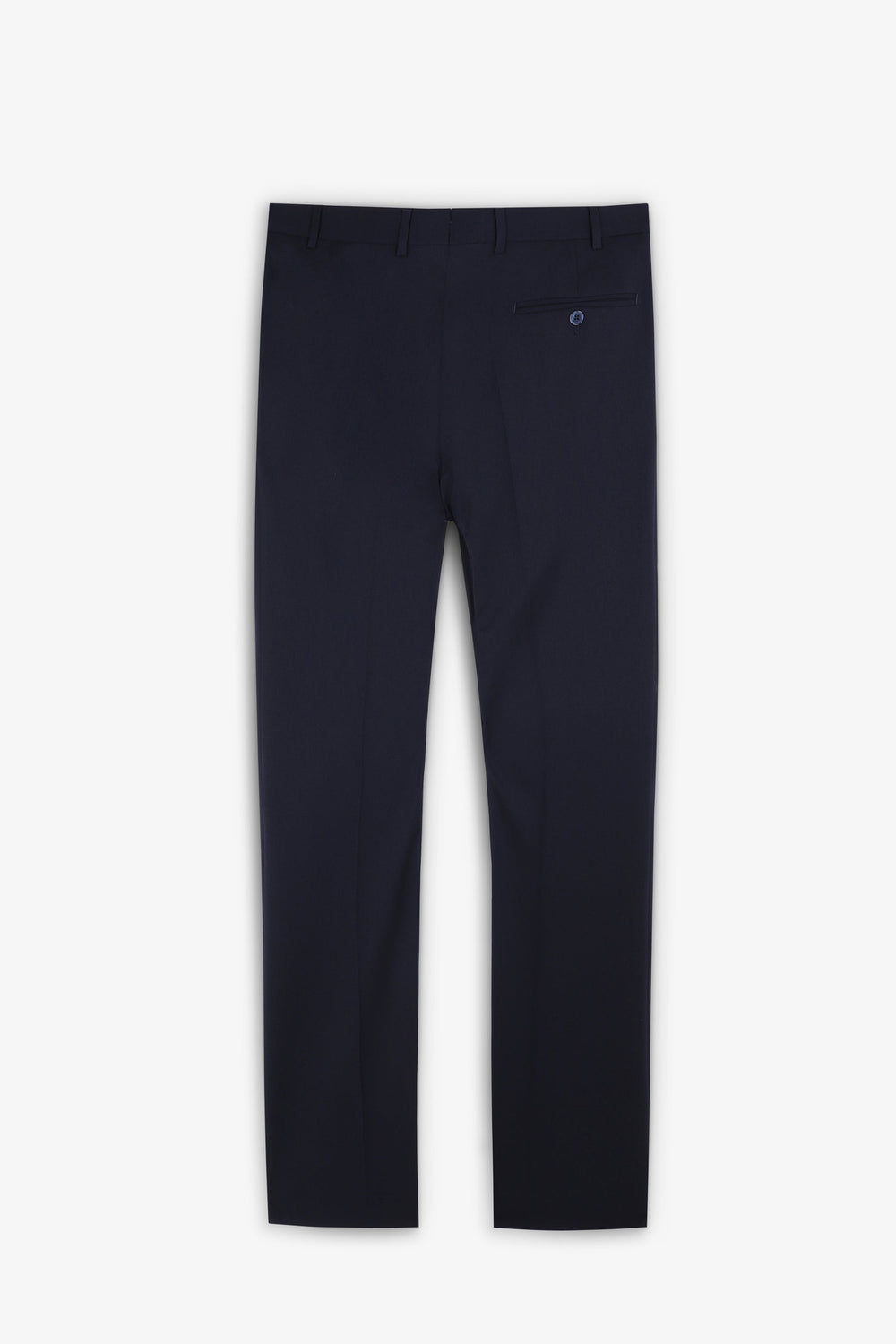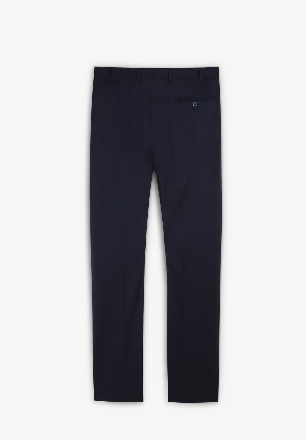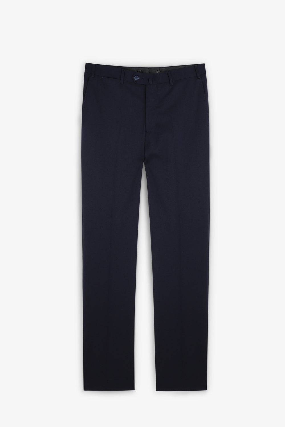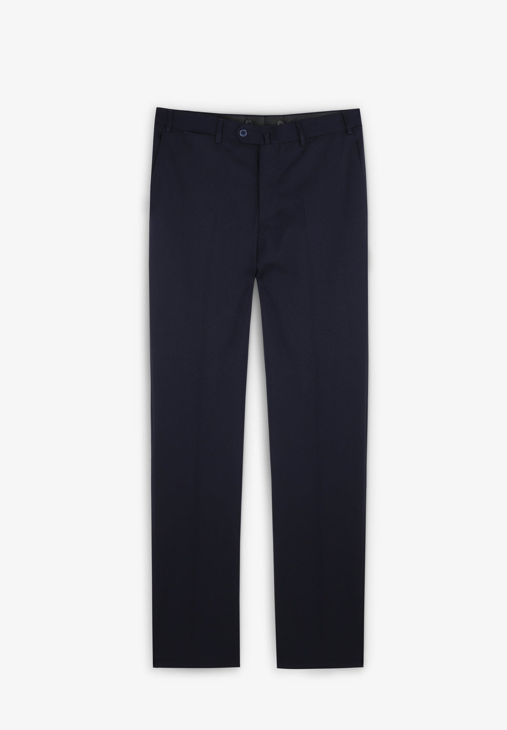- Straight trousers with an extended button-up fastening at the waist and simple unturned hem