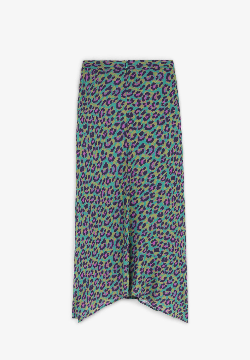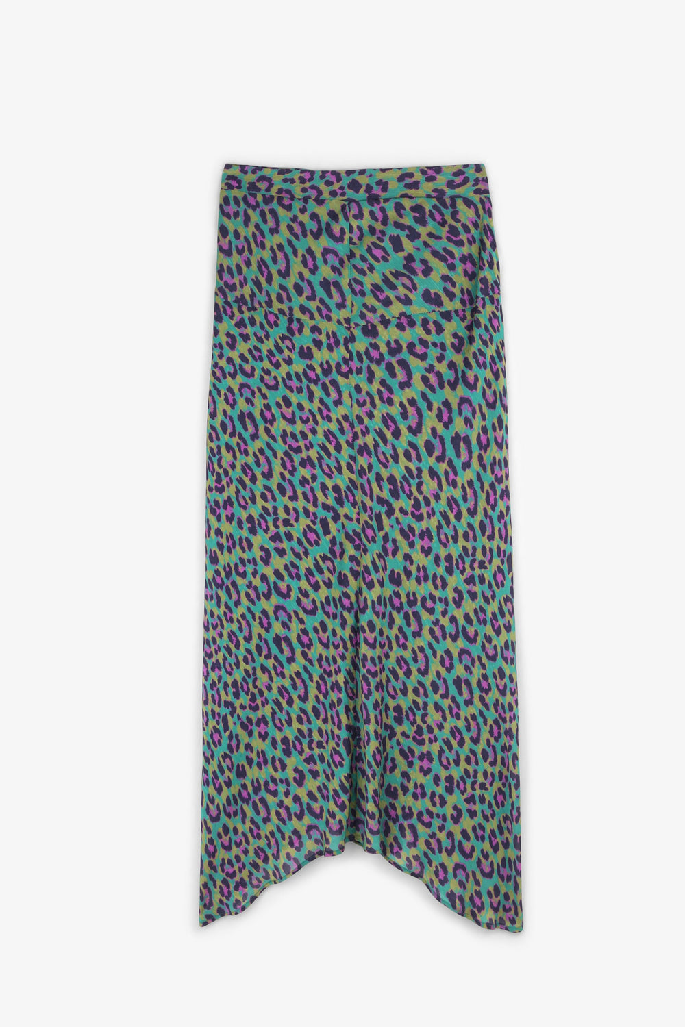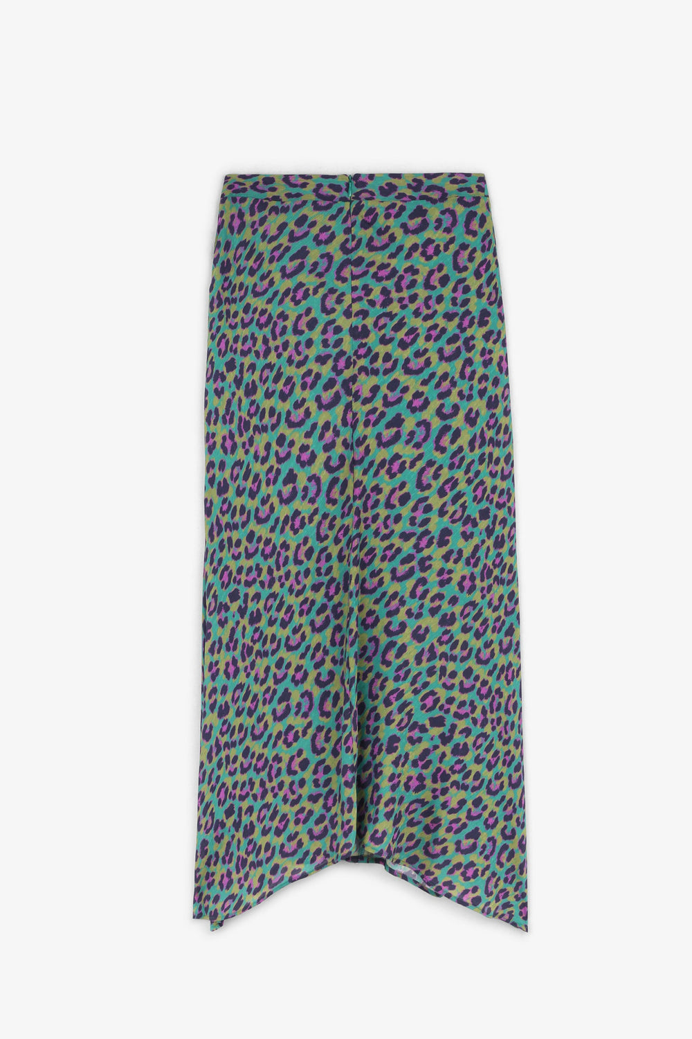 Flowing skirt with front cut in animal print fabric.