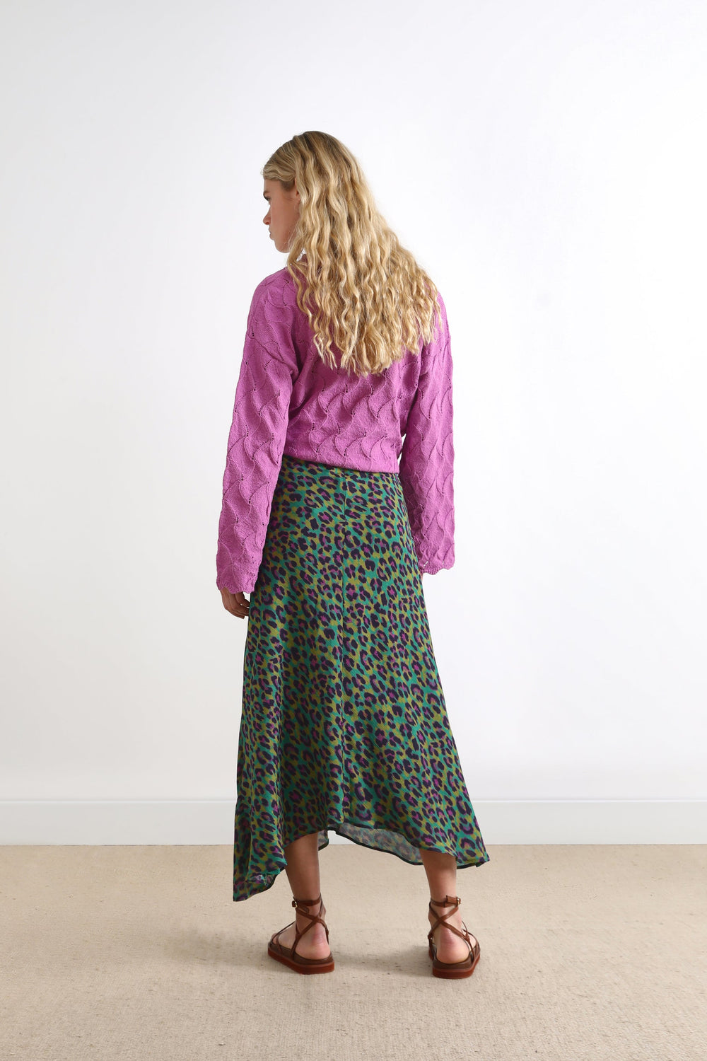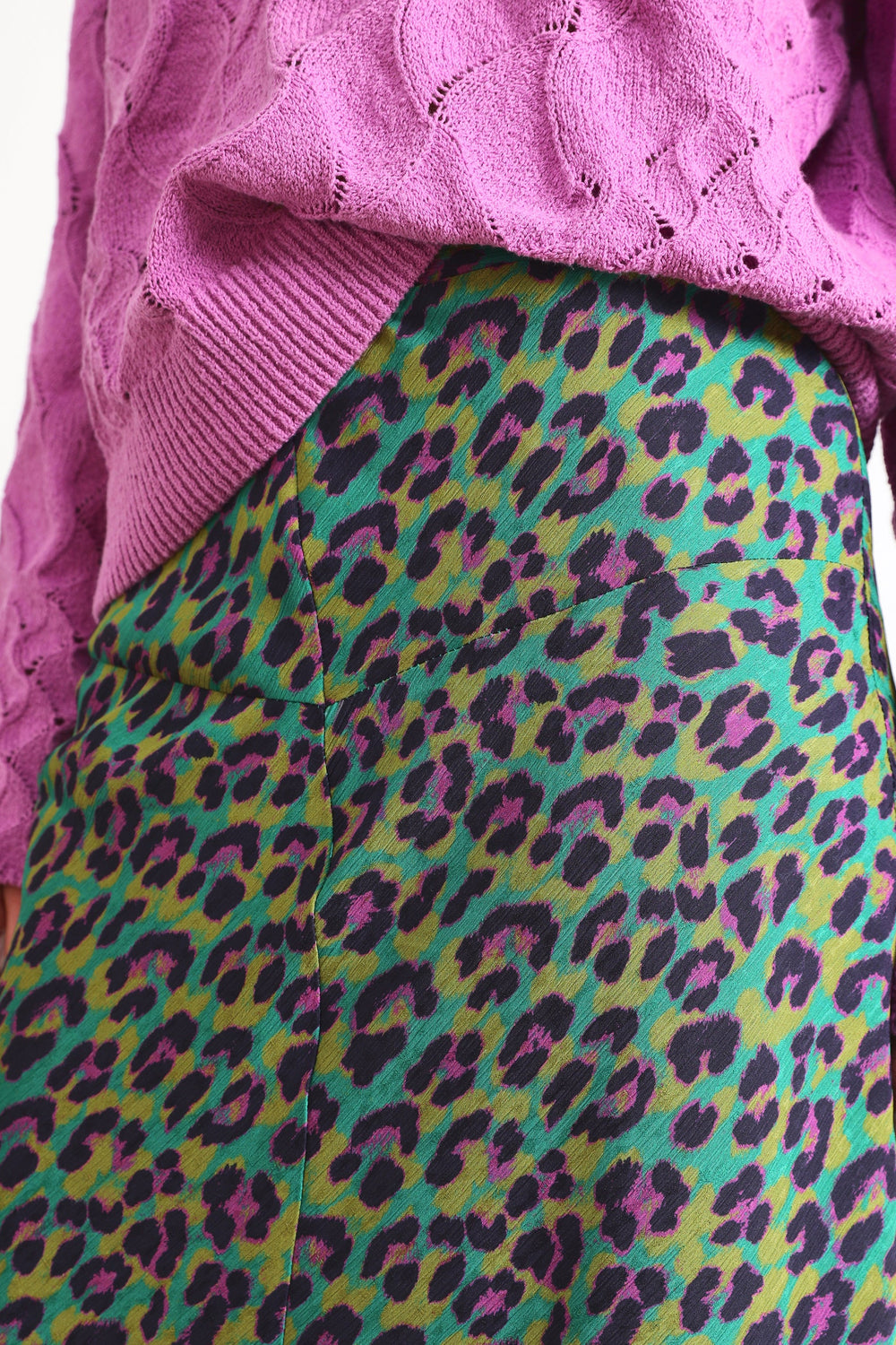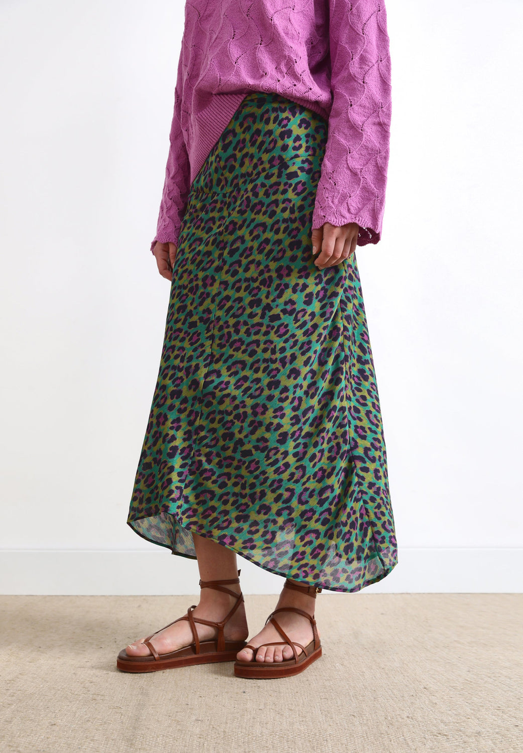 Flowing skirt with front cut in animal print fabric.