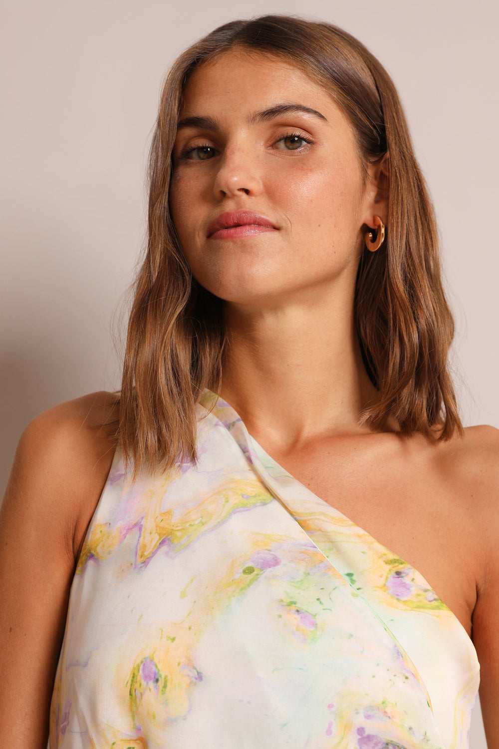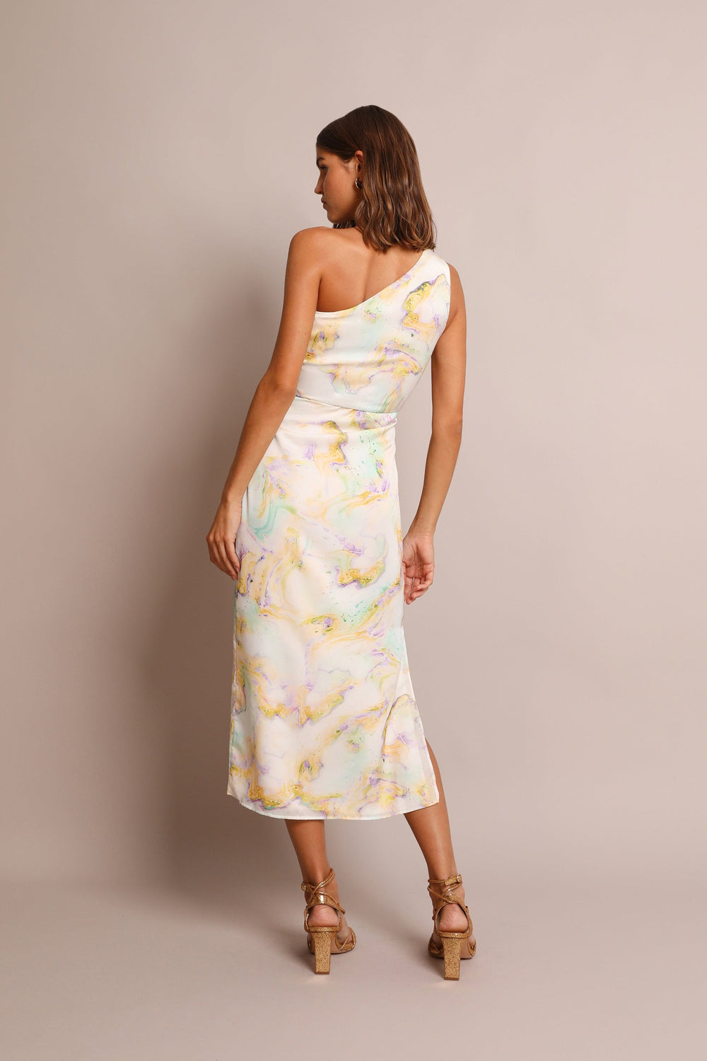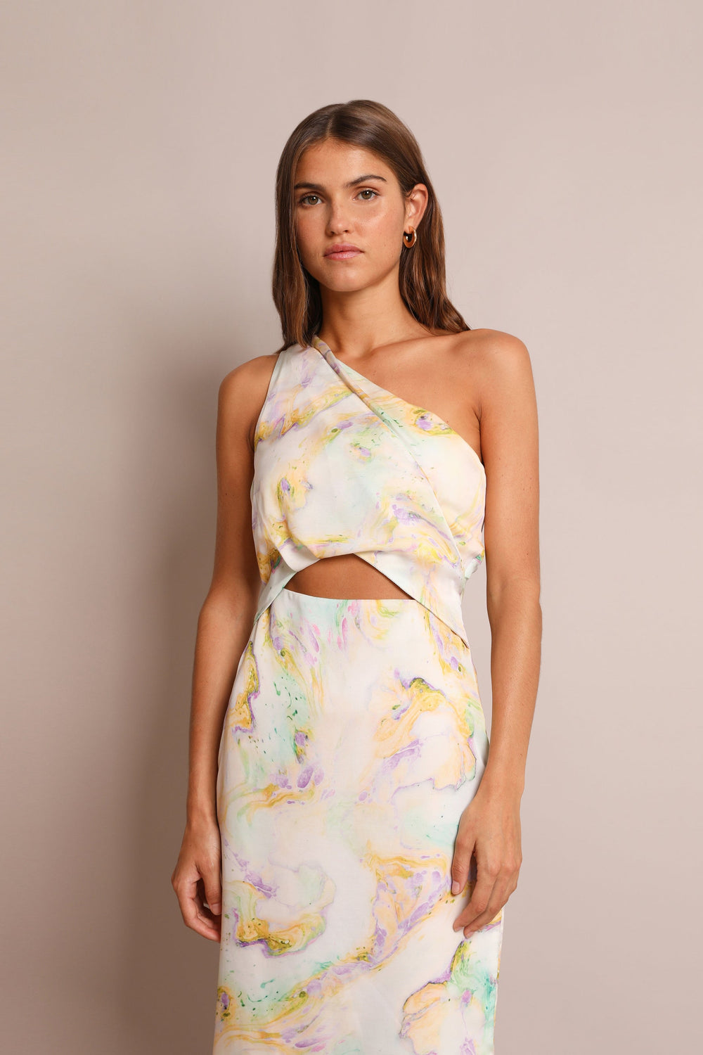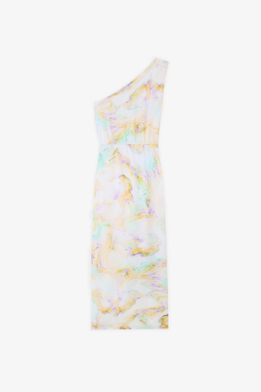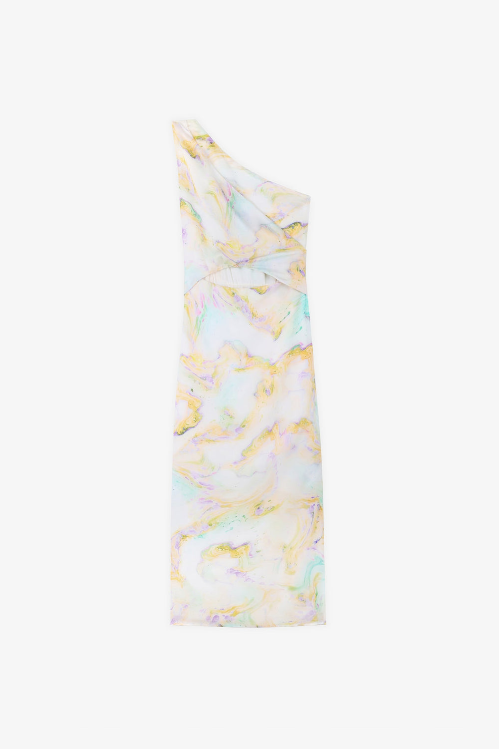Asymmetric dress. Made of flowing fabric, mid-length, asymmetric neckline, cut out waist.