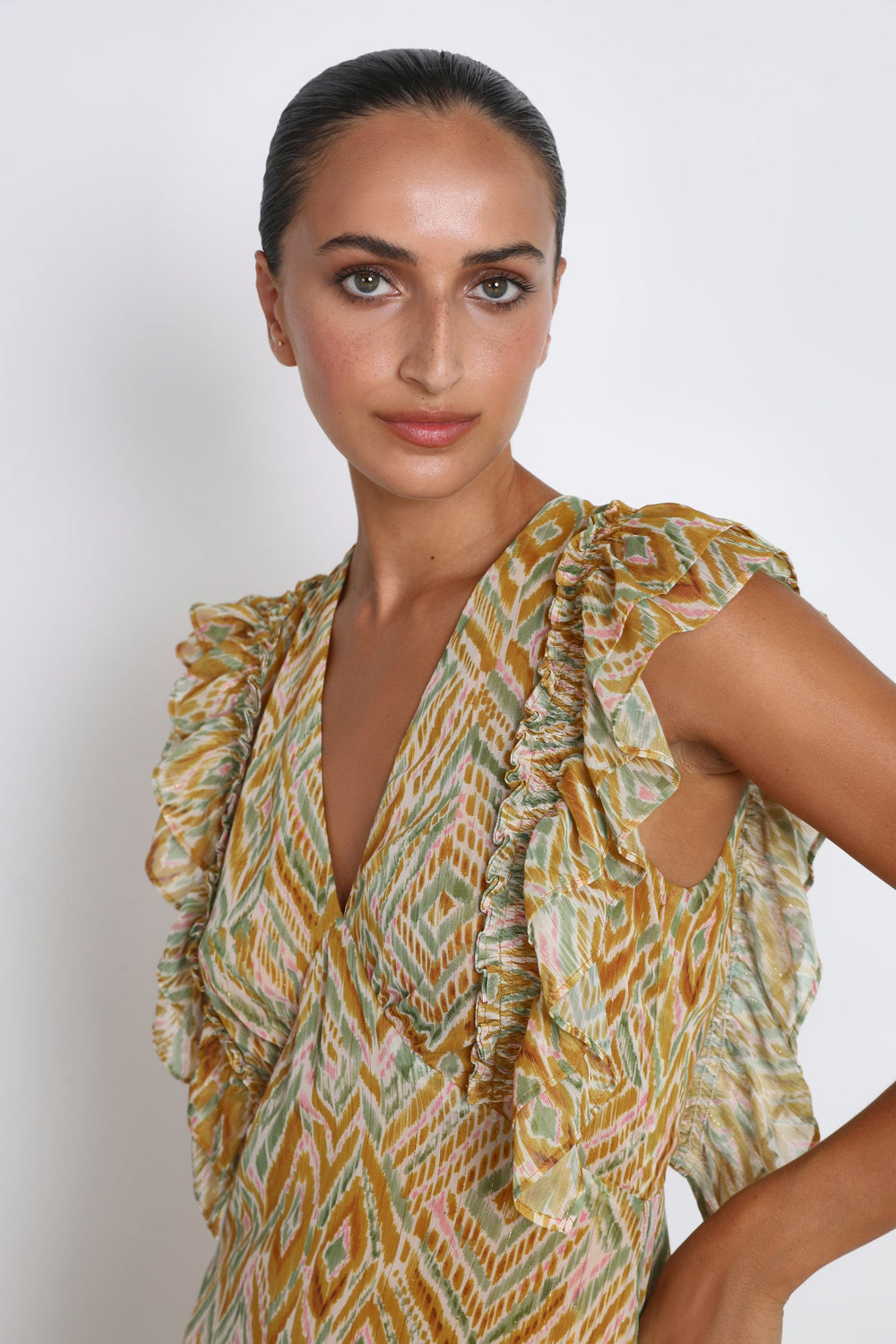 - Sleeveless with ruffled armholes