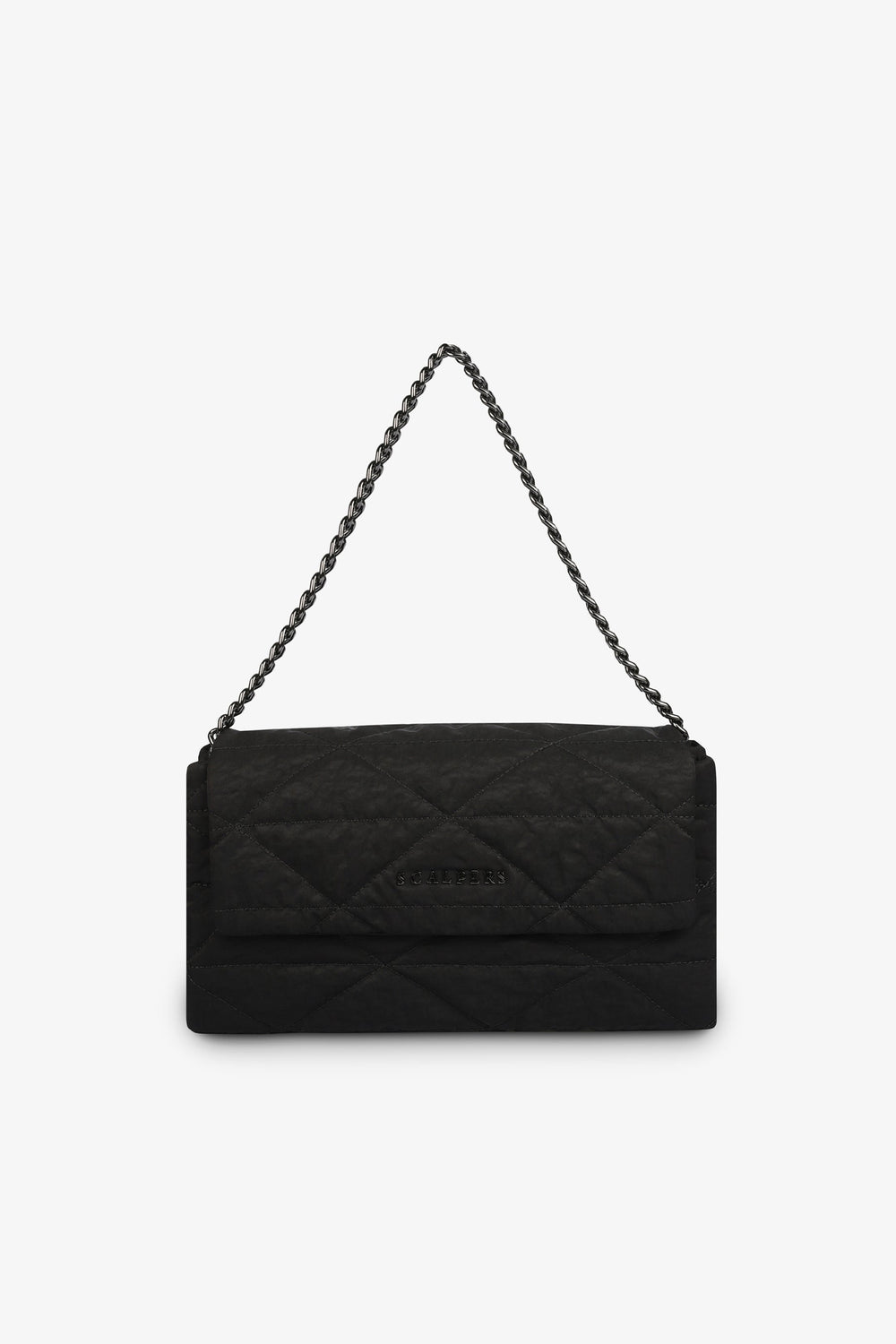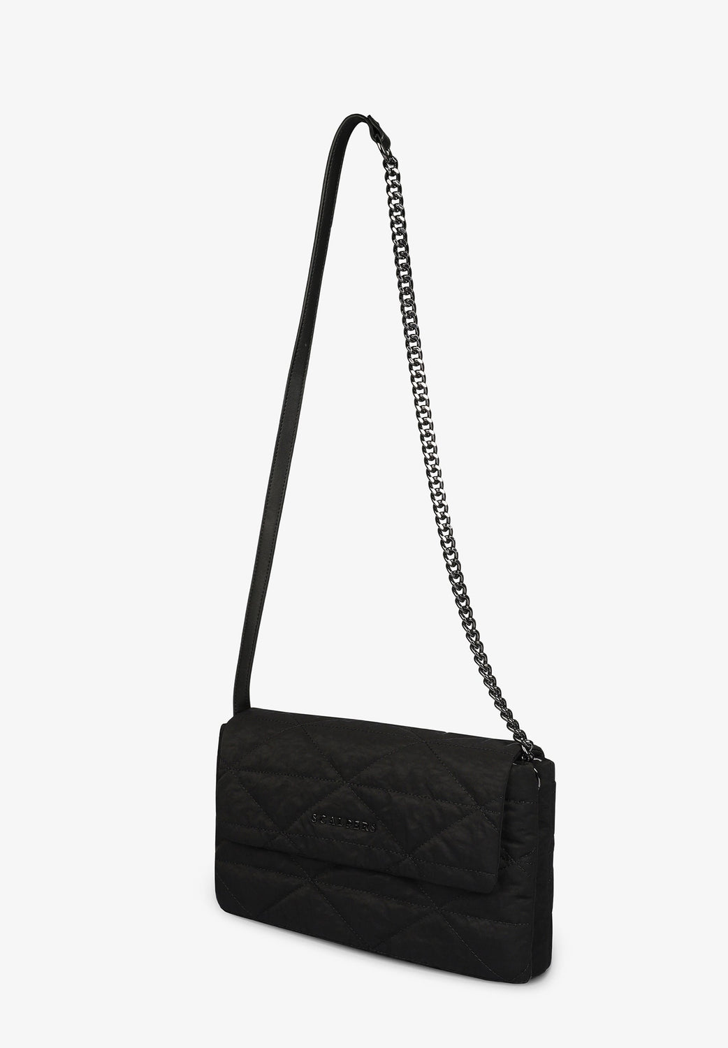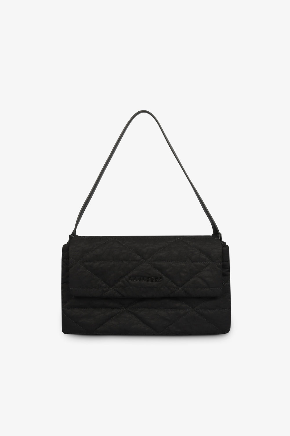 Shoulder bag with soft touch and metallic logo detail.