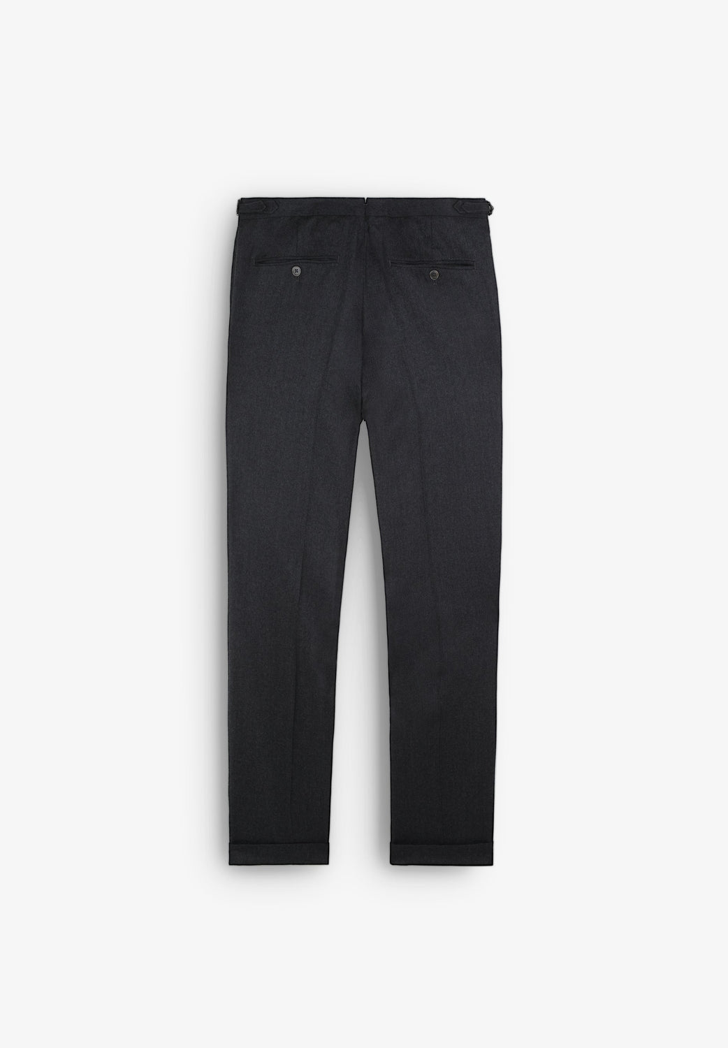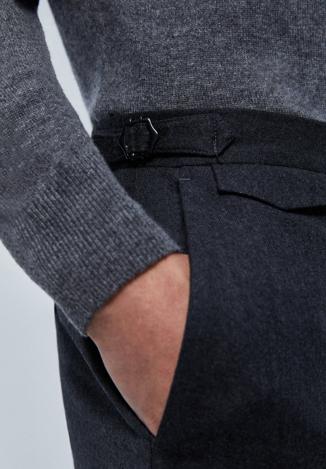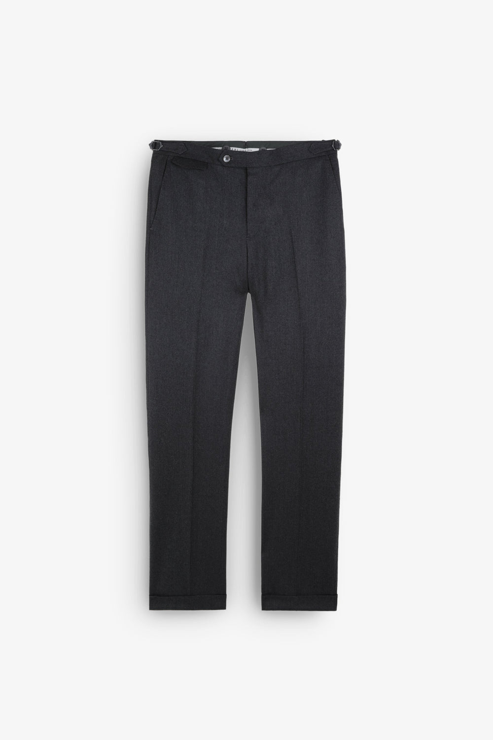 - Straight trousers with an extended button-up fastening at the waist and buttons. Side belt and button for braces. Turn-up hem