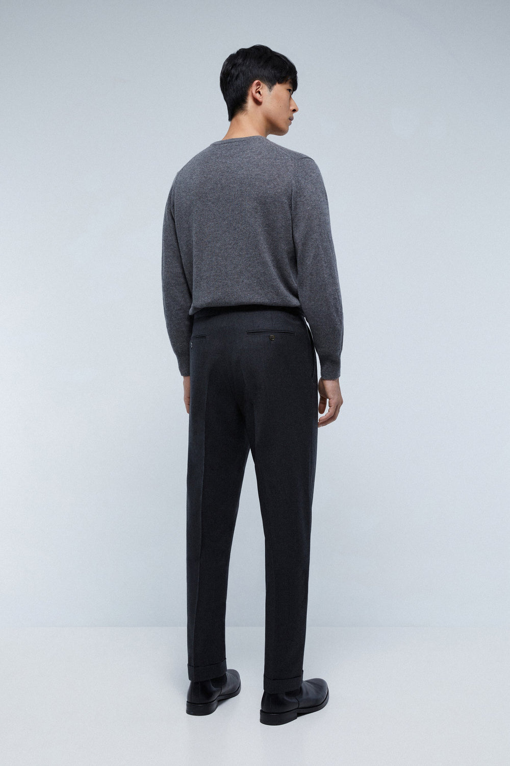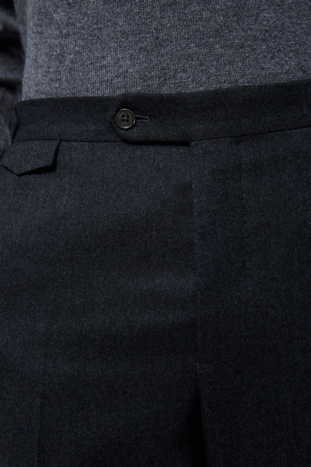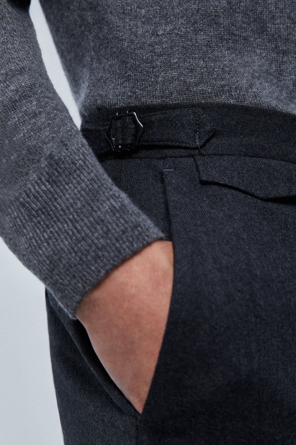 - Straight trousers with an extended button-up fastening at the waist and buttons. Side belt and button for braces. Turn-up hem