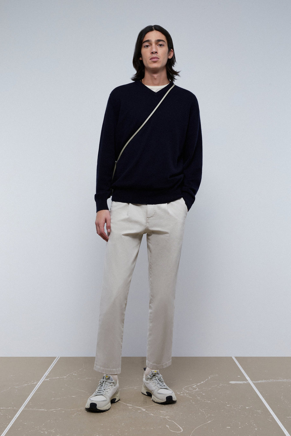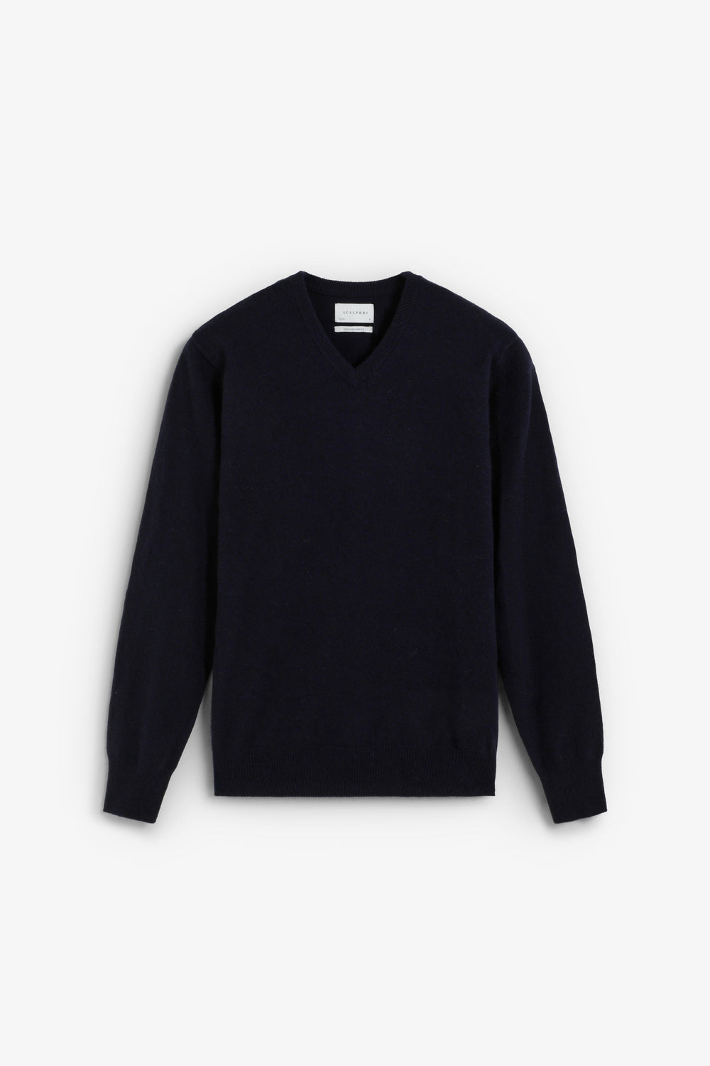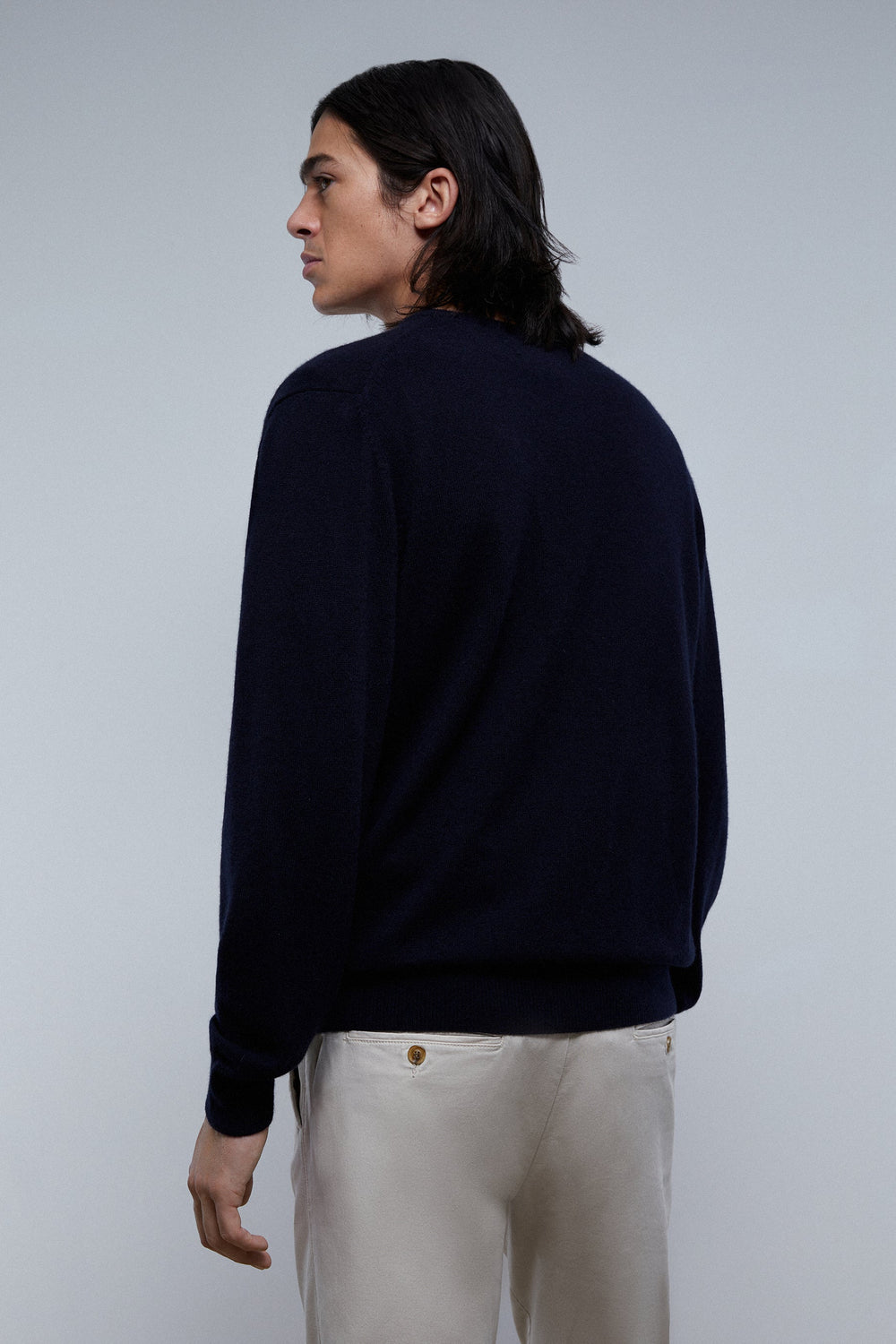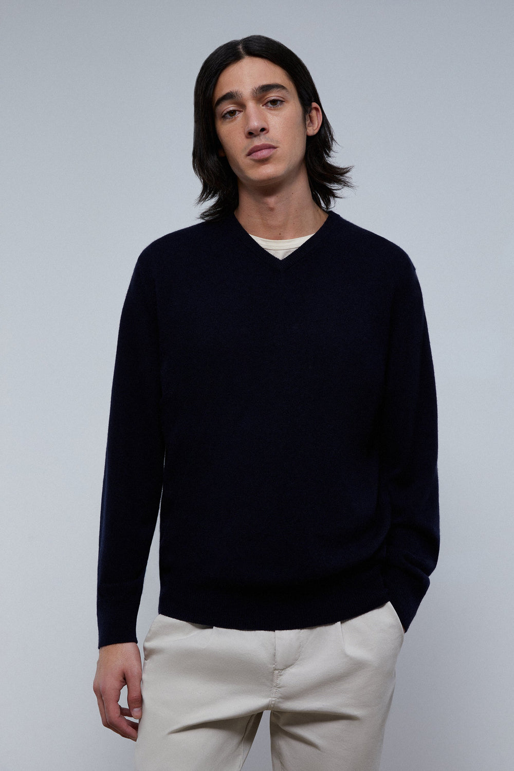 Jersey confeccionado en cachemira 100%. Corte Regular Fit. Cuello de pico. Manga larga.
