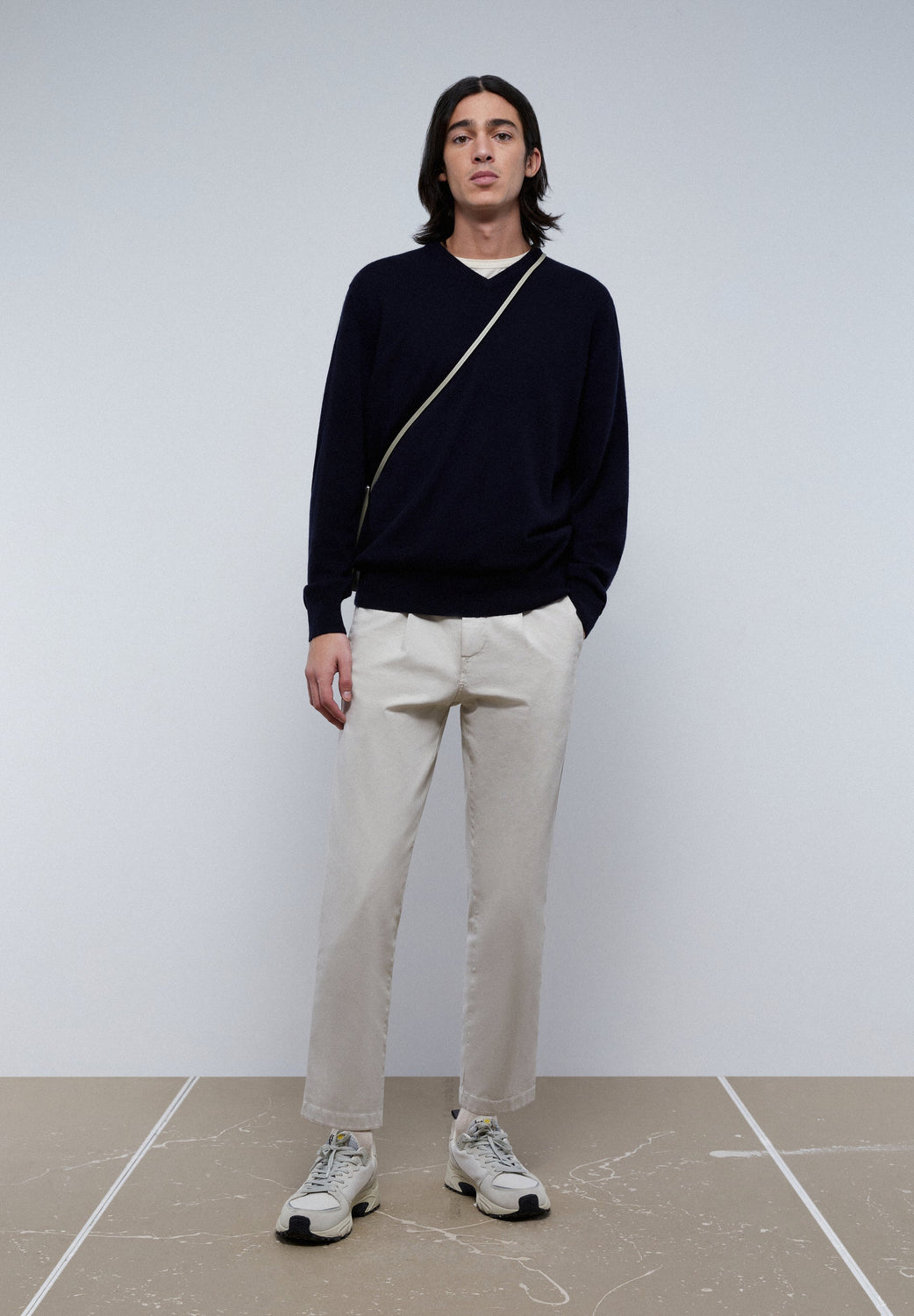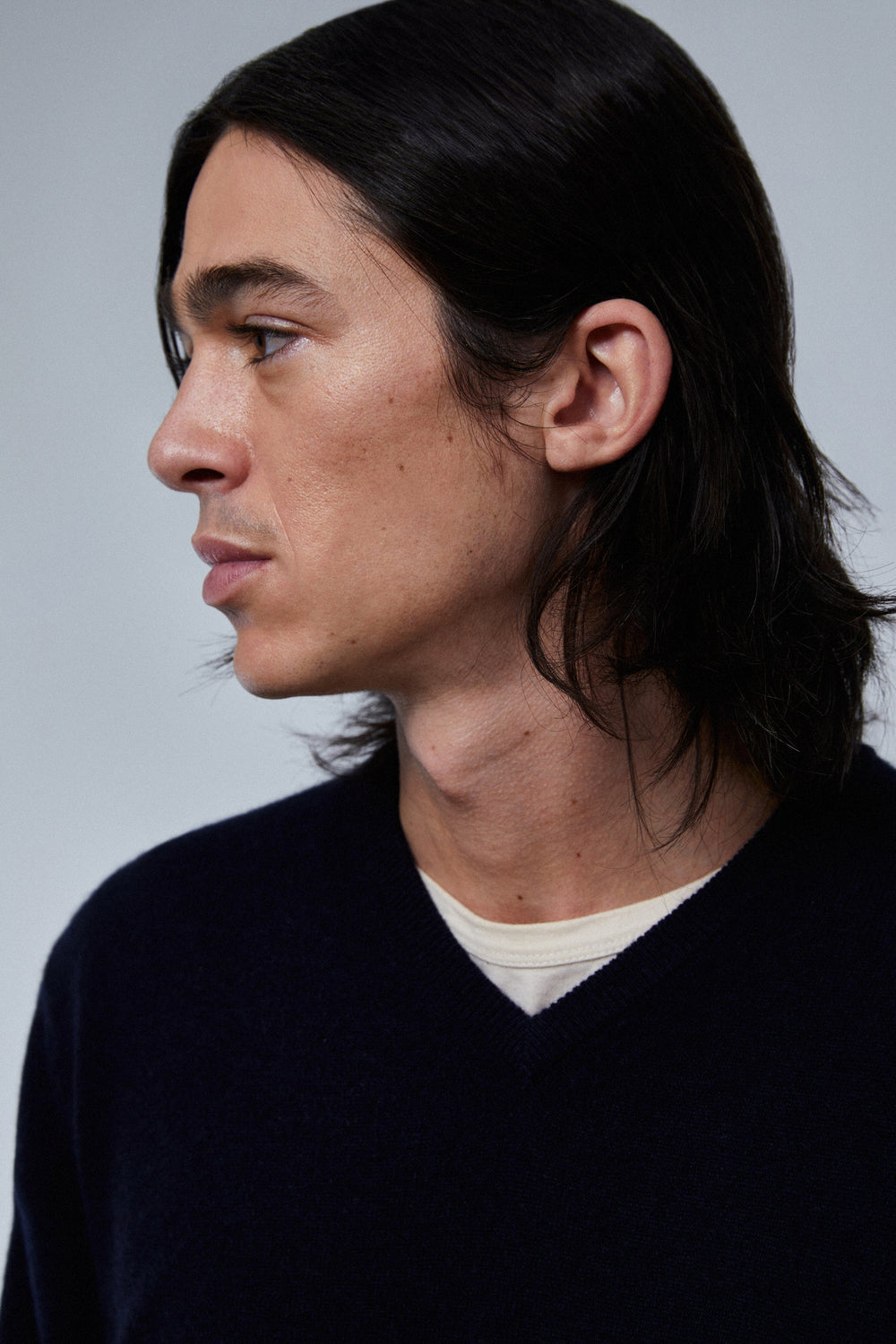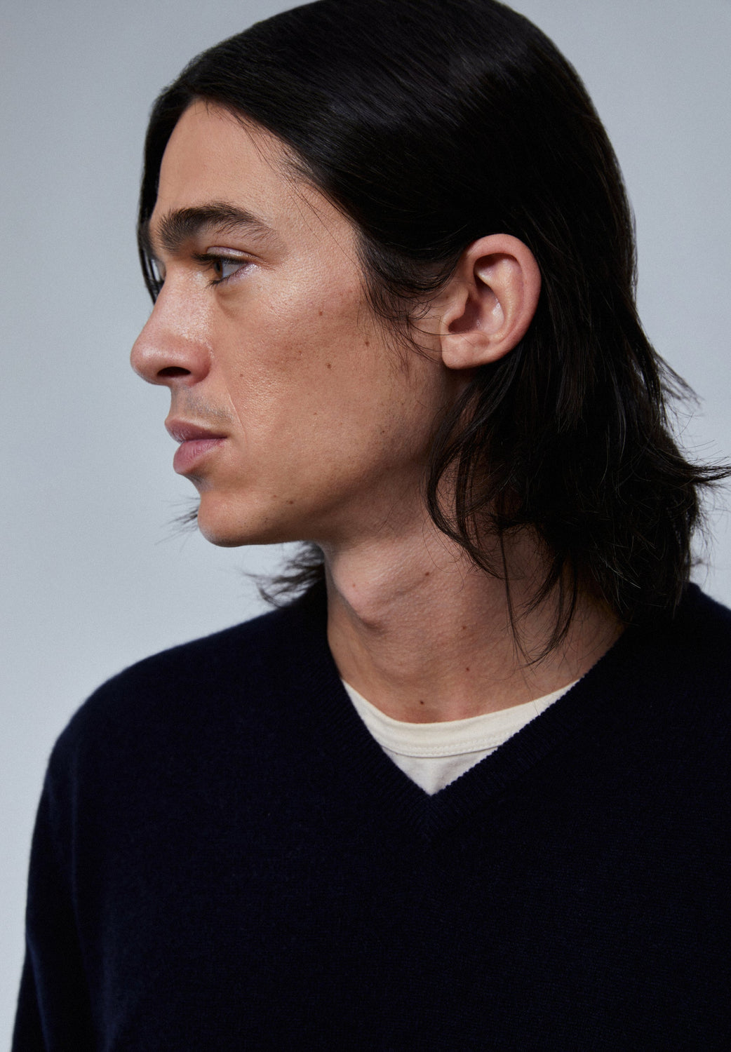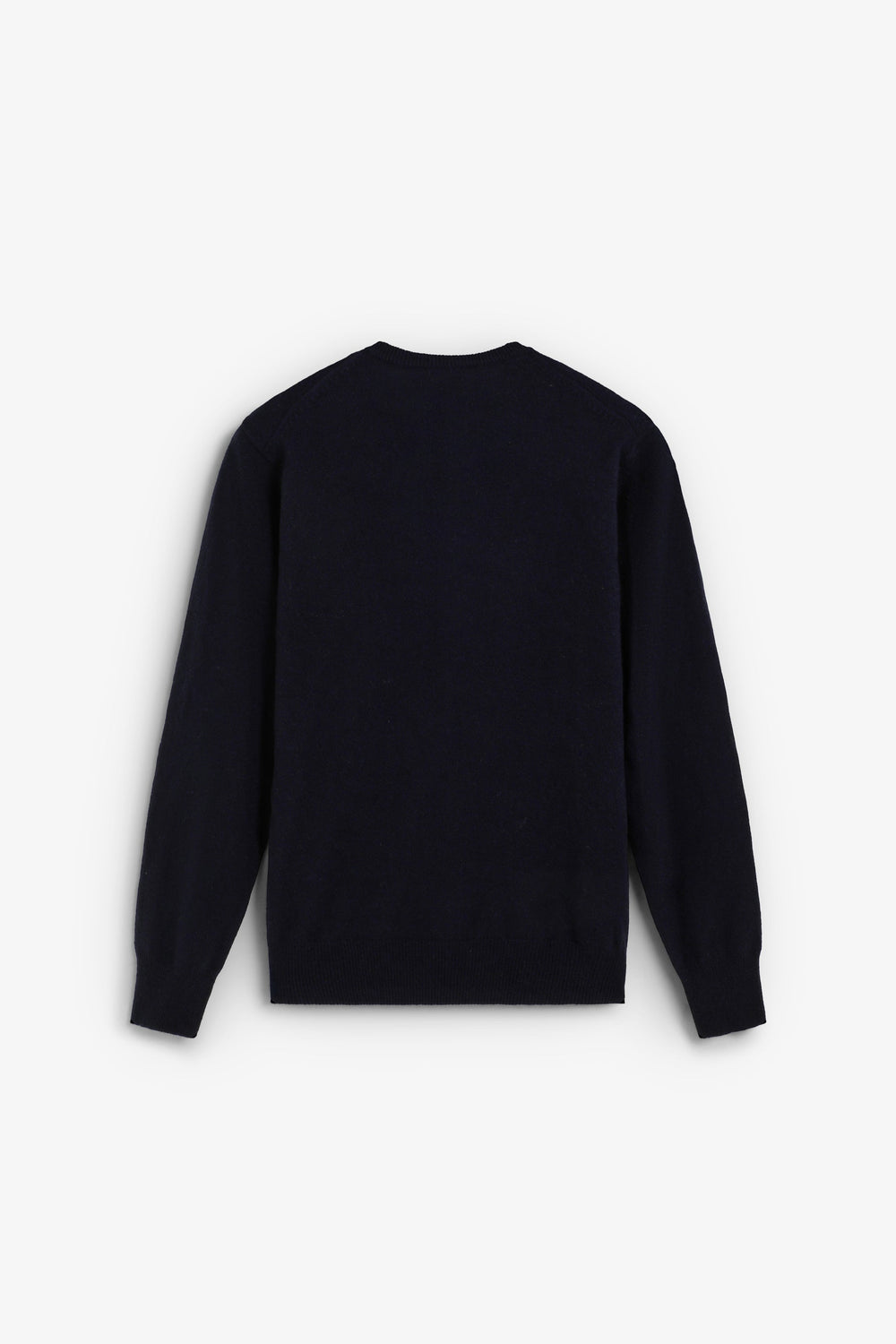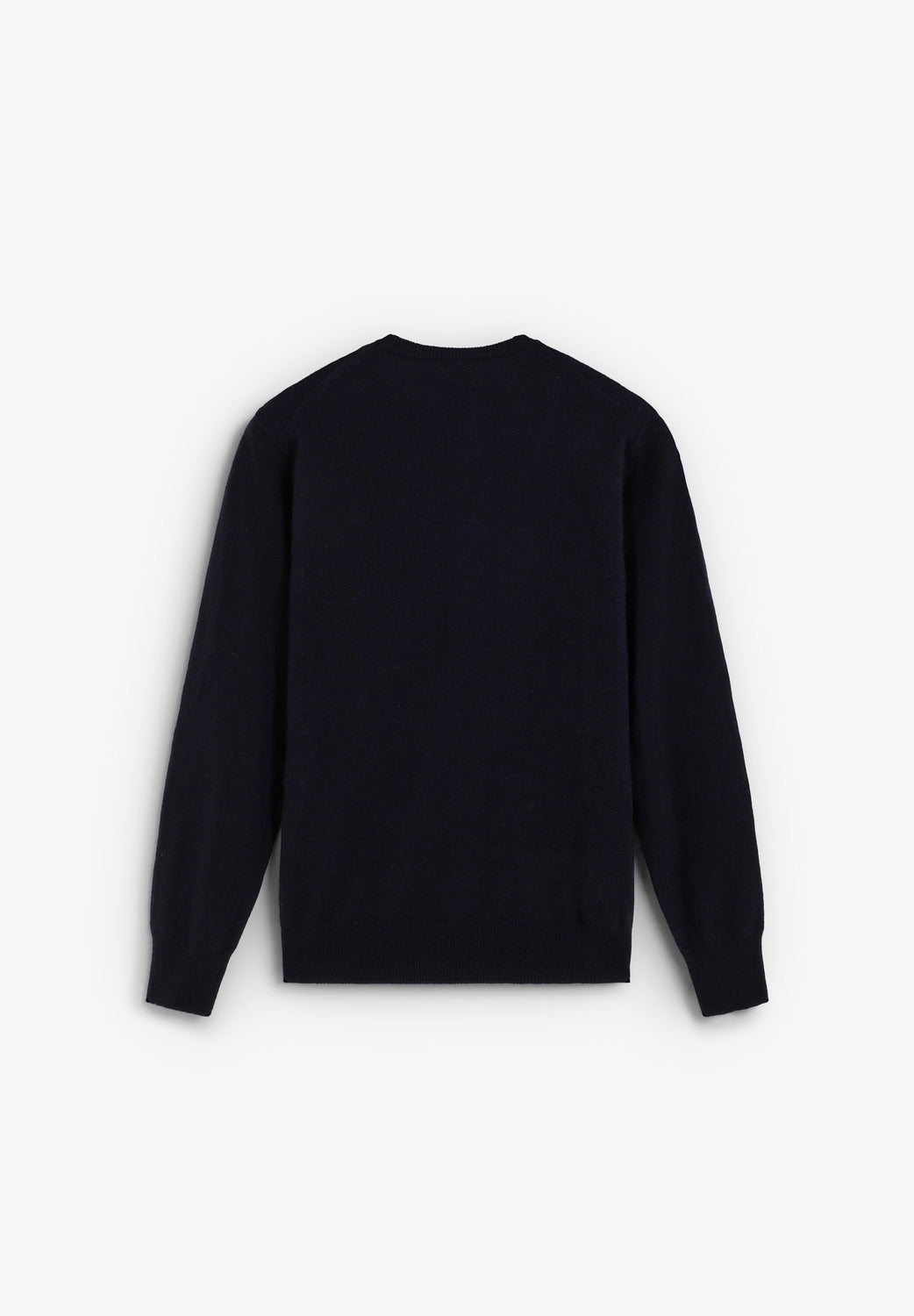 Jersey confeccionado en cachemira 100%. Corte Regular Fit. Cuello de pico. Manga larga.