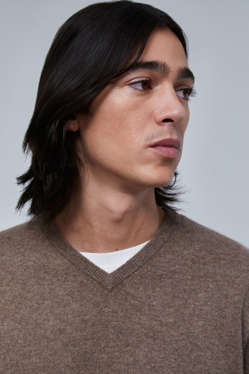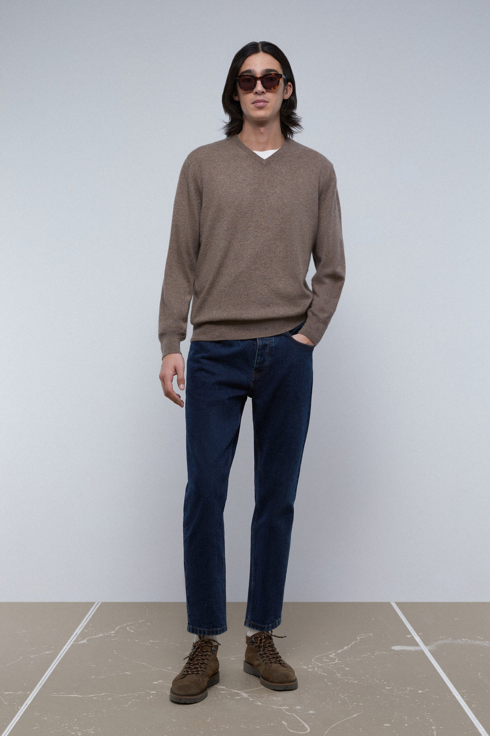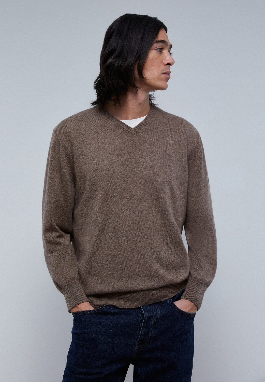 Jersey confeccionado en cachemira 100%. Corte Regular Fit. Cuello de pico. Manga larga.