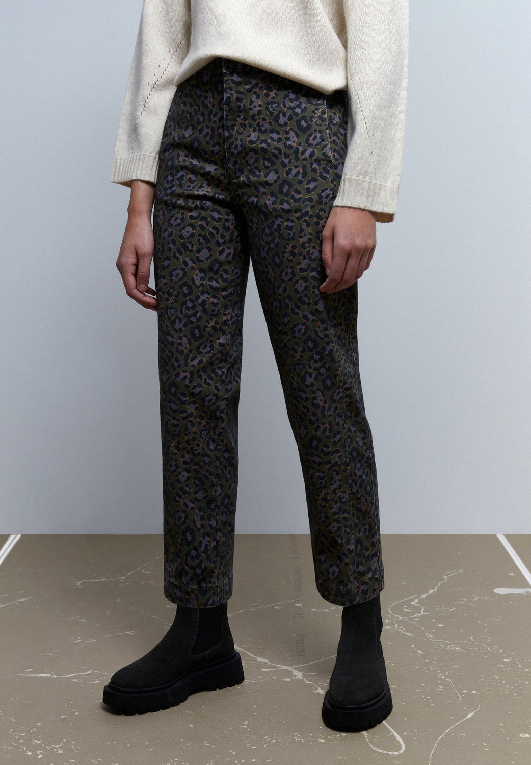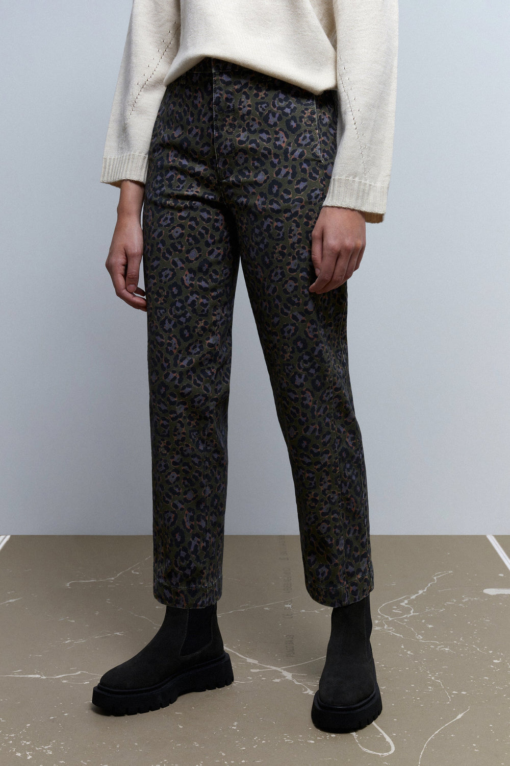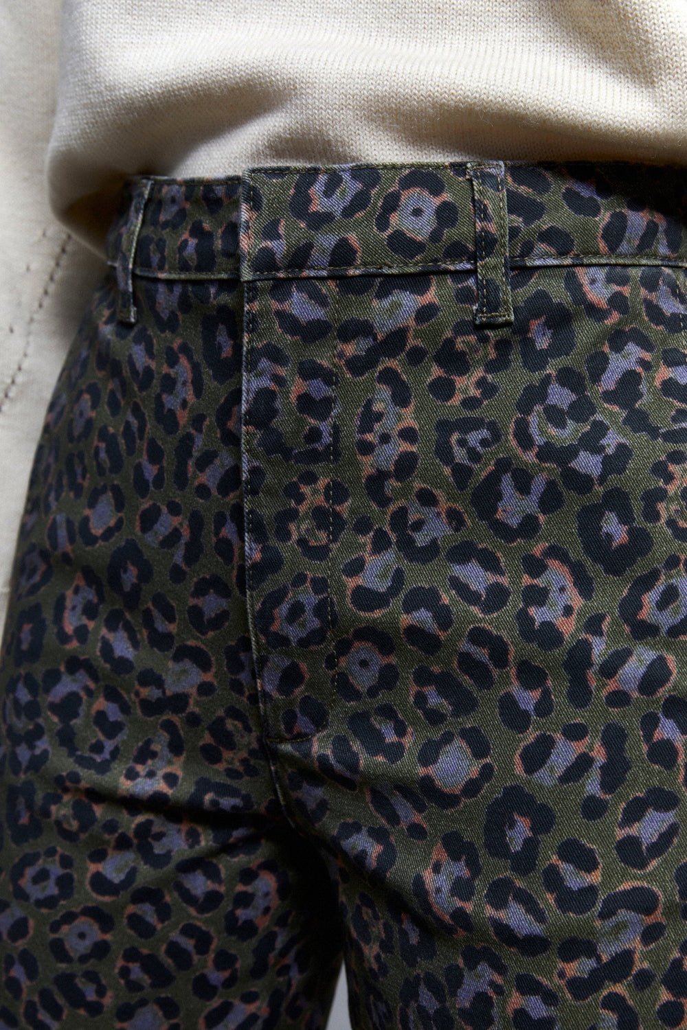 Animal print chino trousers.