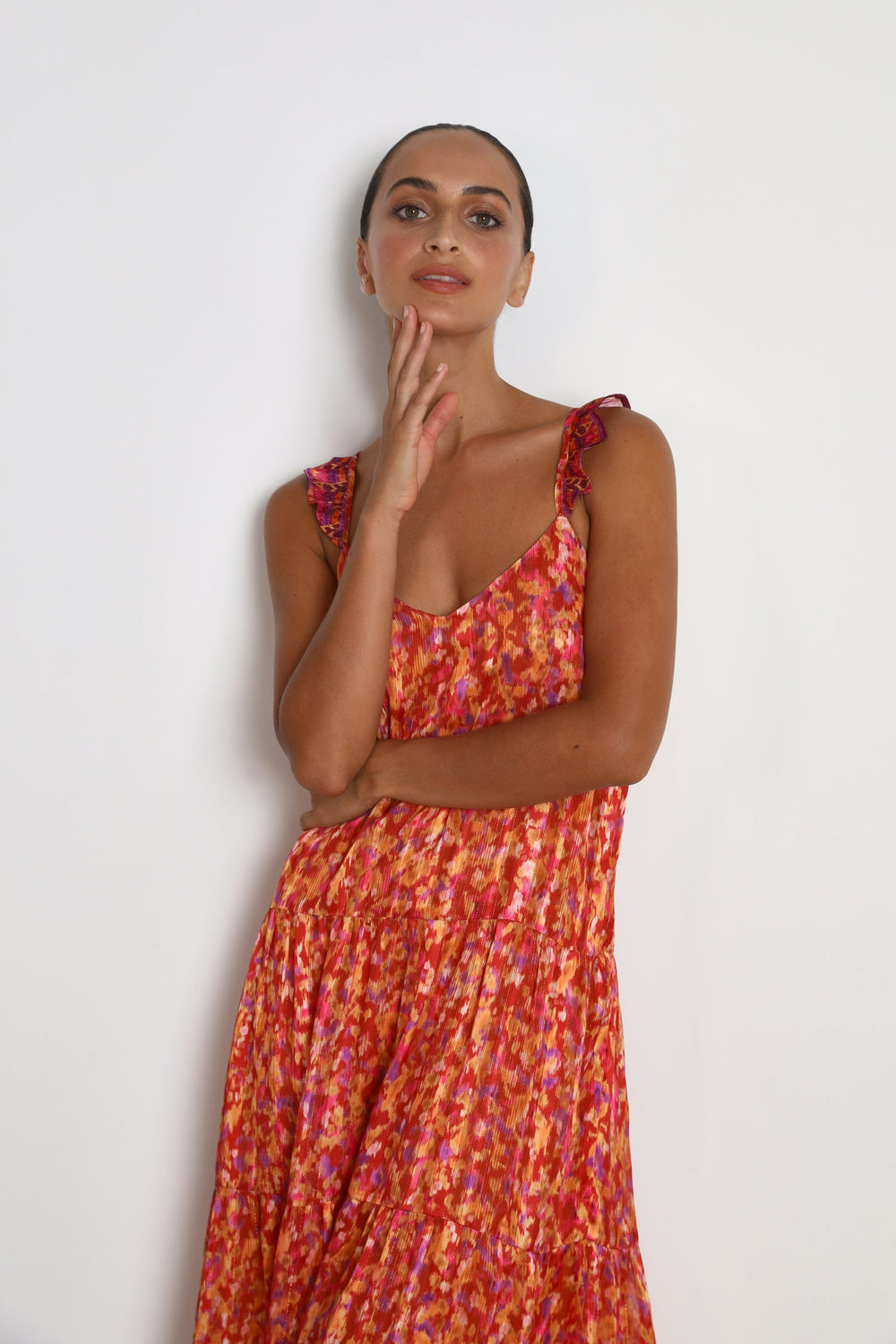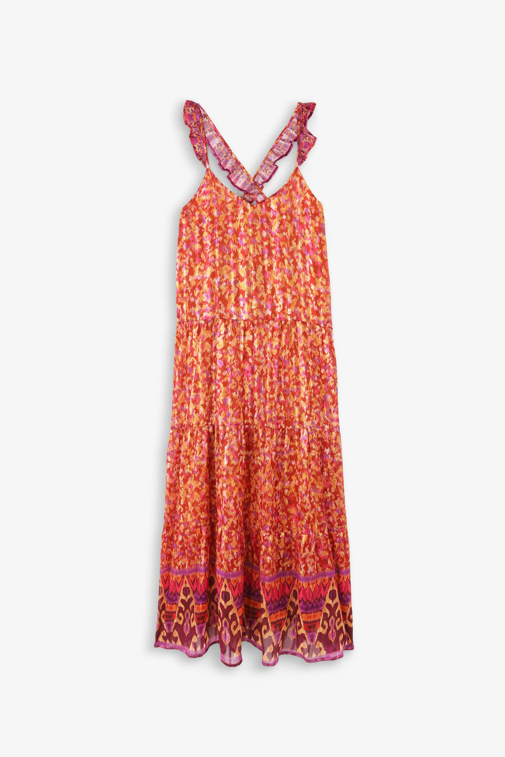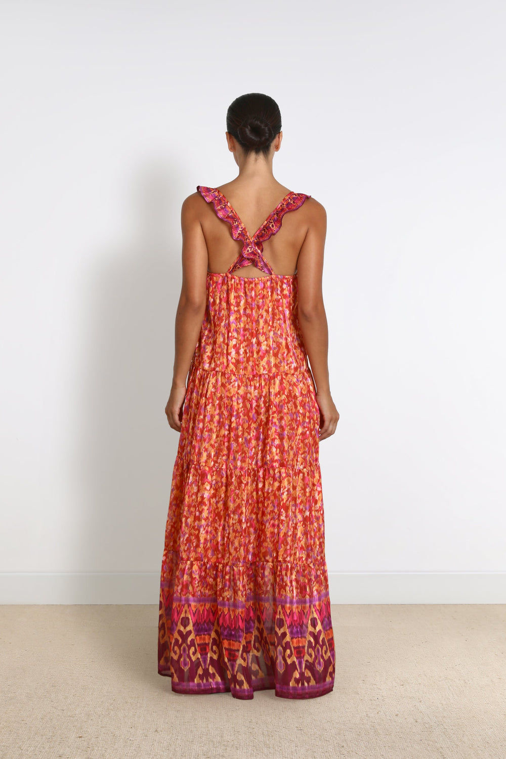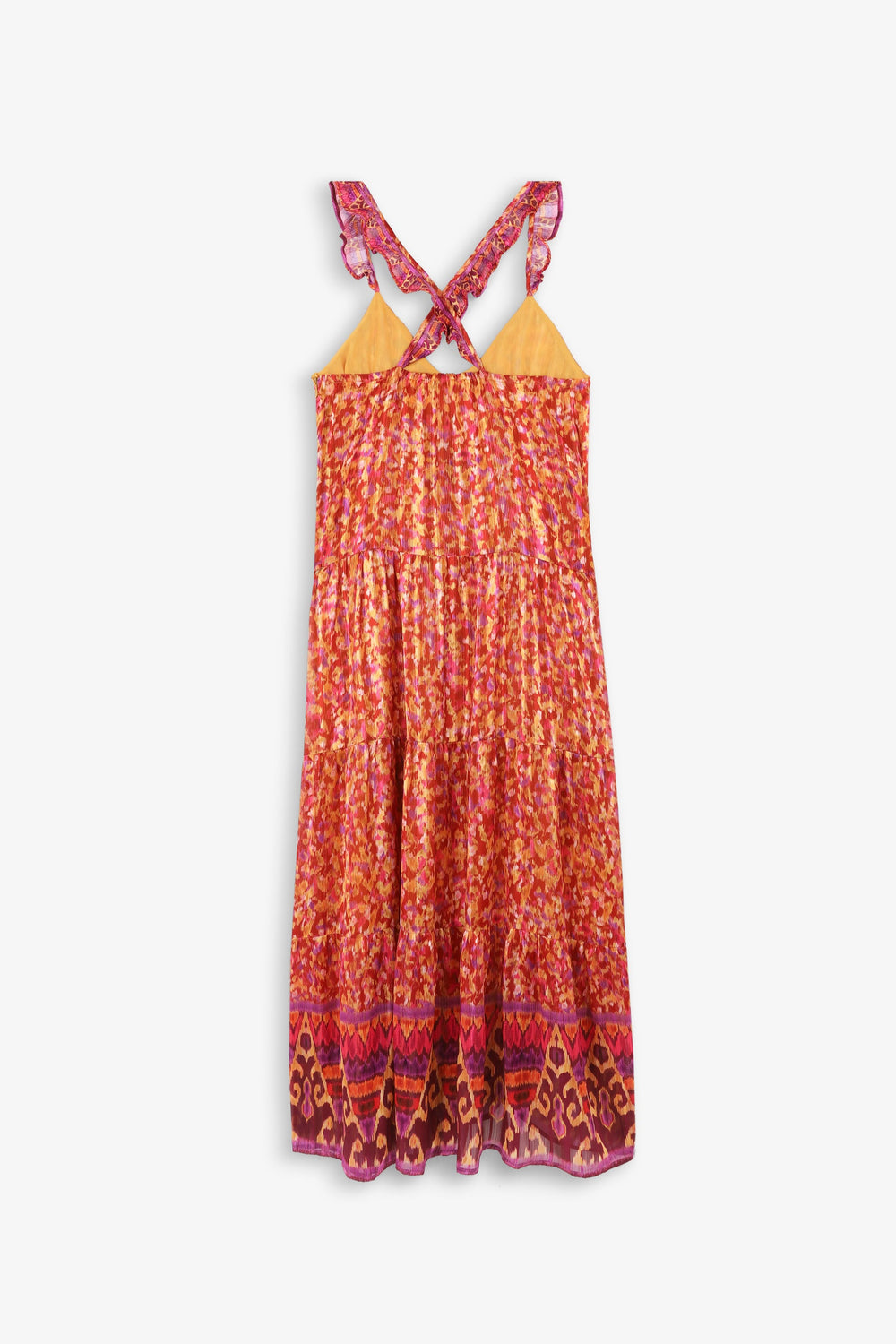 - Ruffled straps that cross at the back