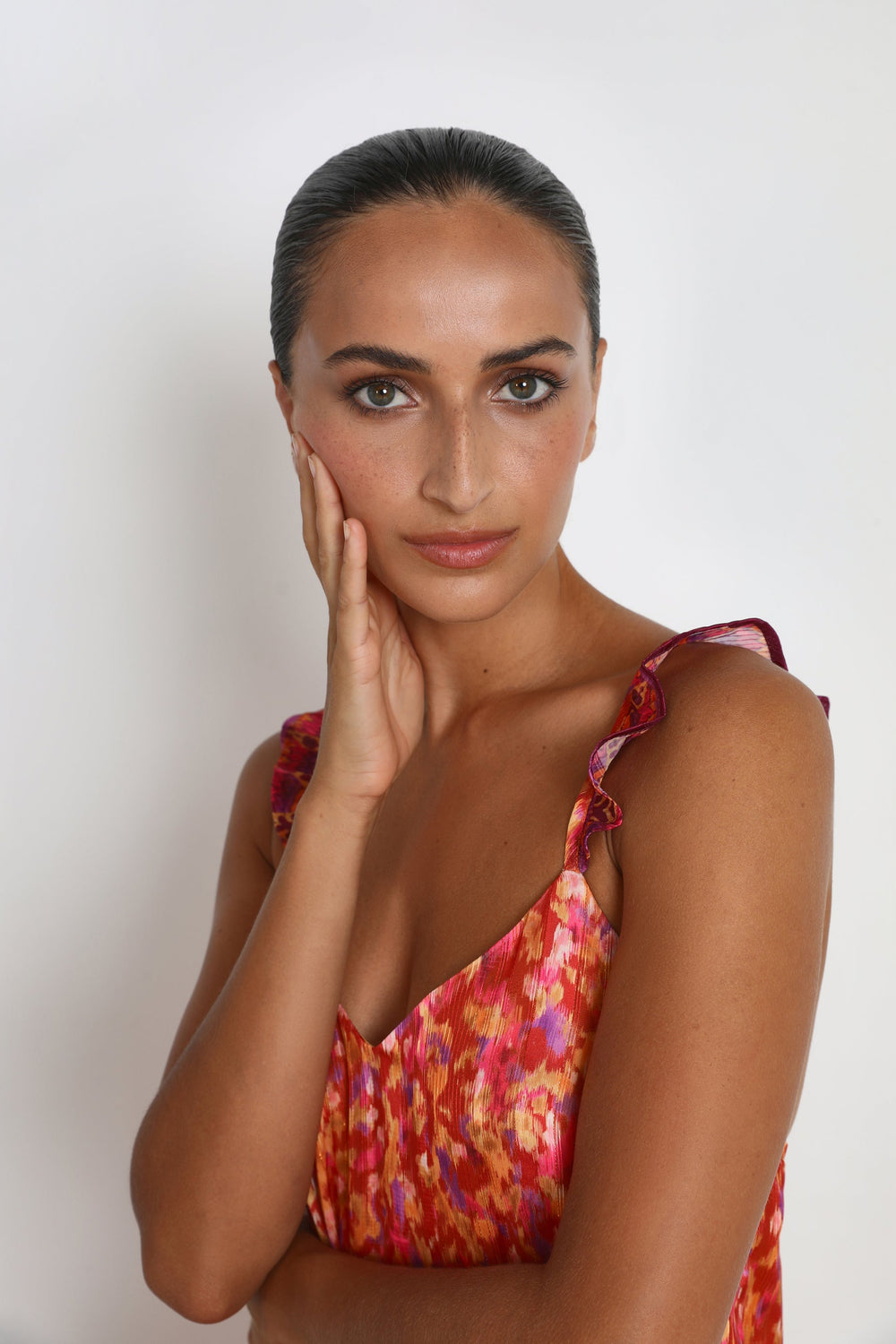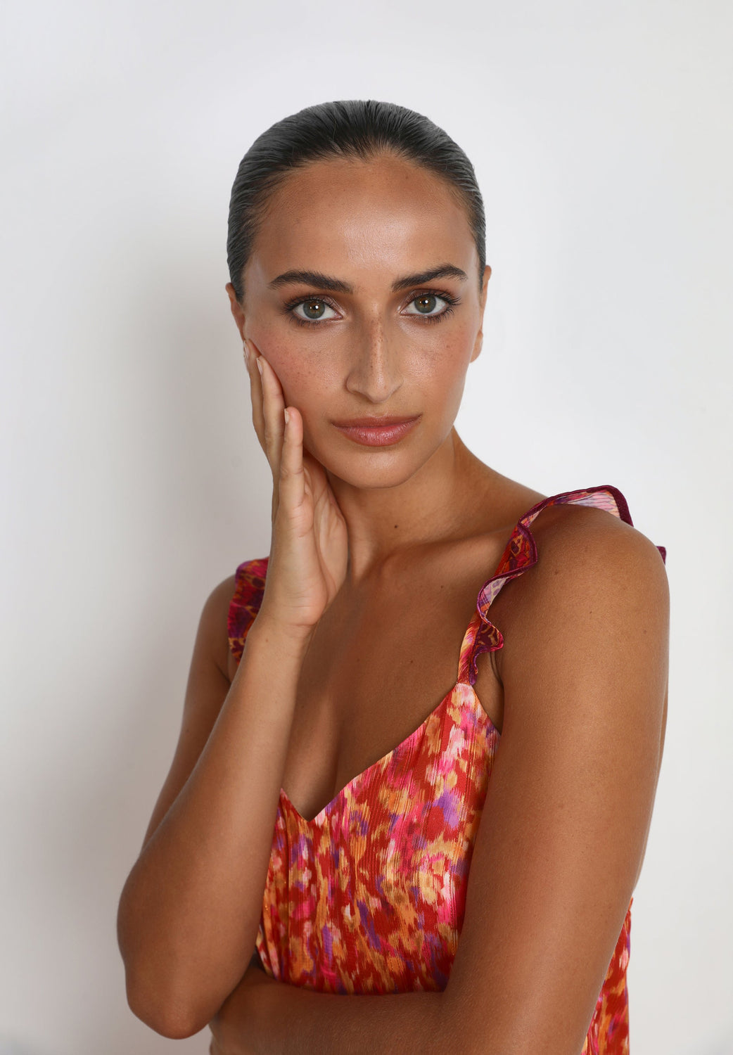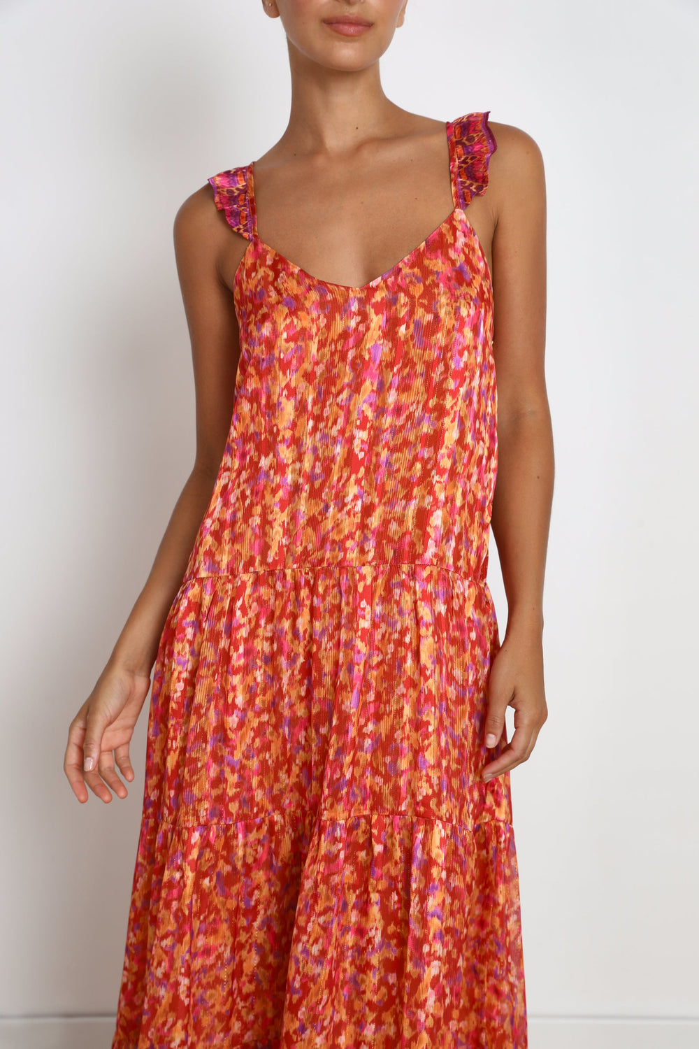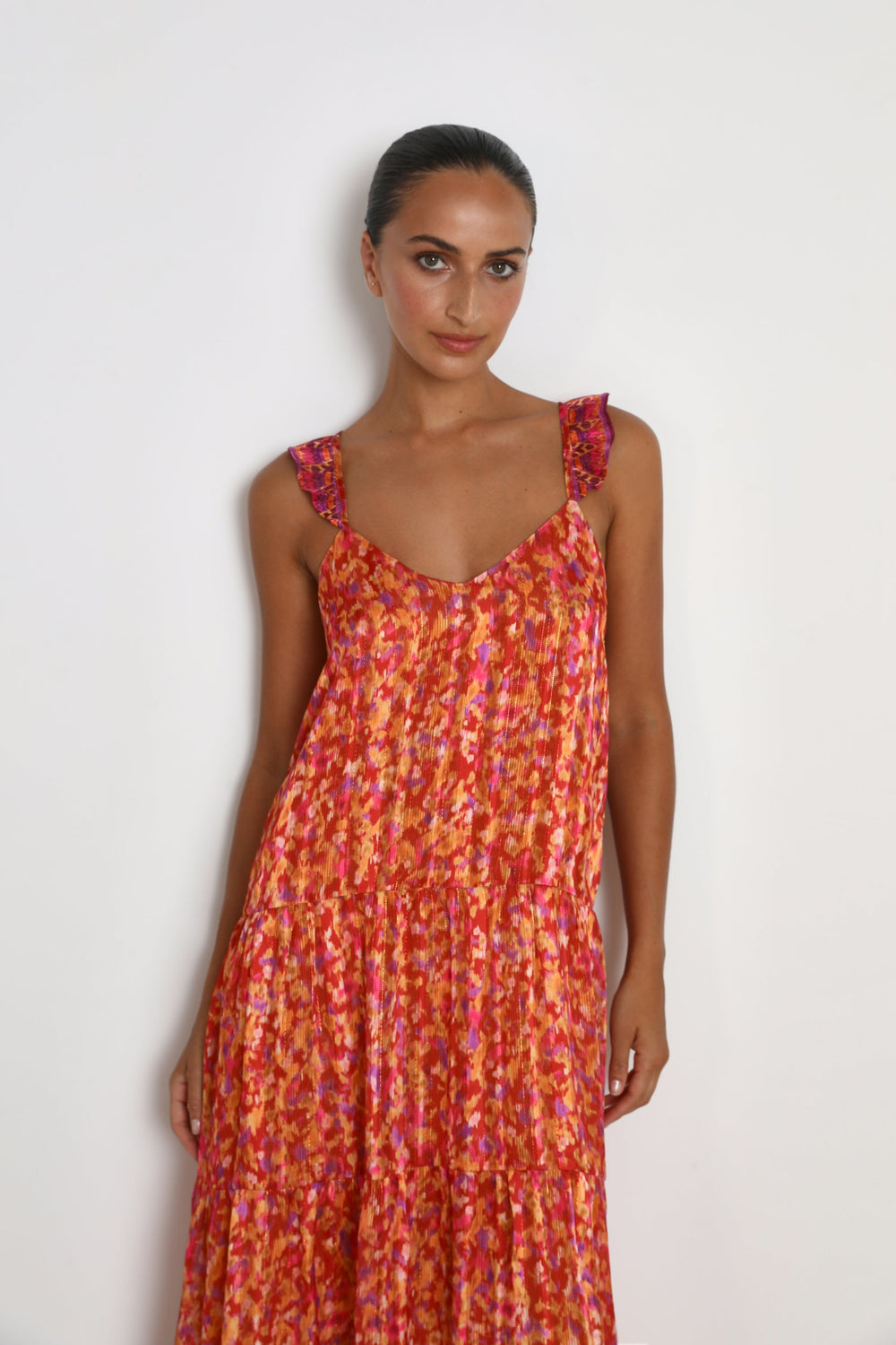 - Ruffled straps that cross at the back