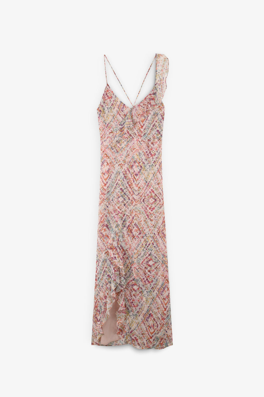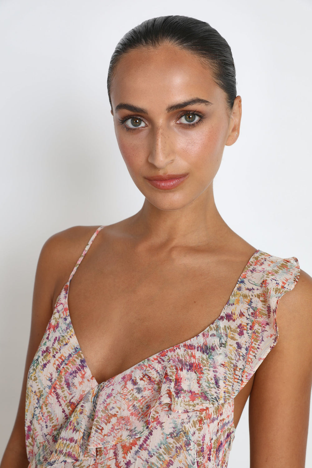 - Thin straps with ruffle detail.