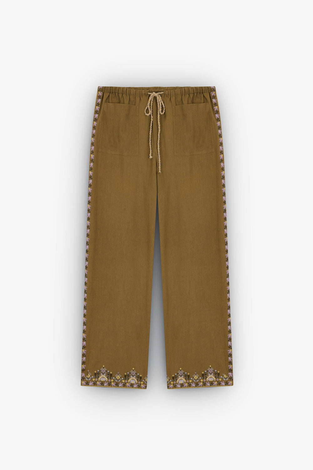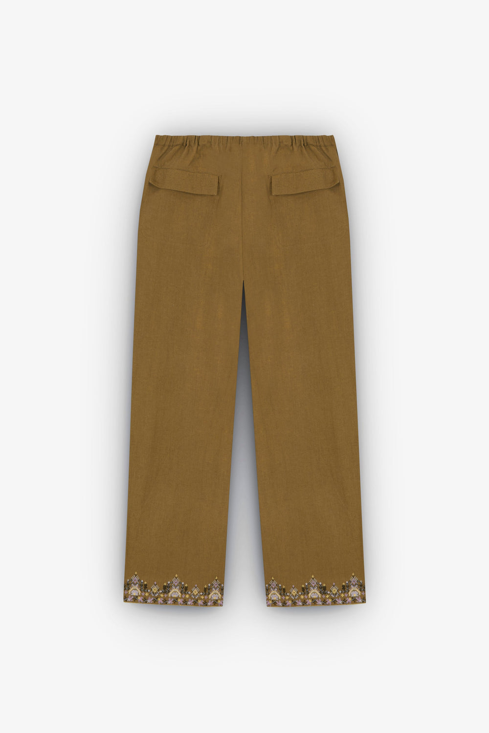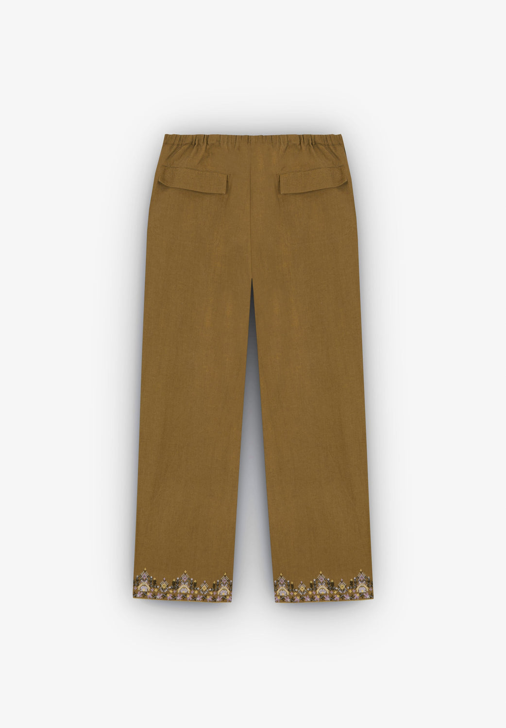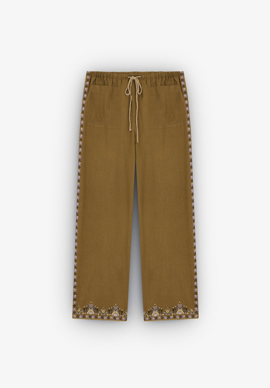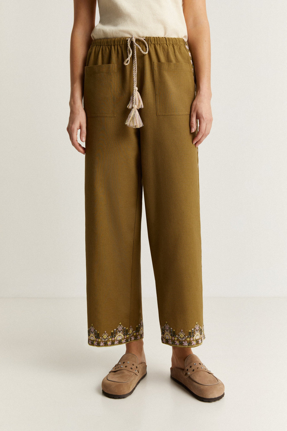 Trousers with ethnic embroidery detail.