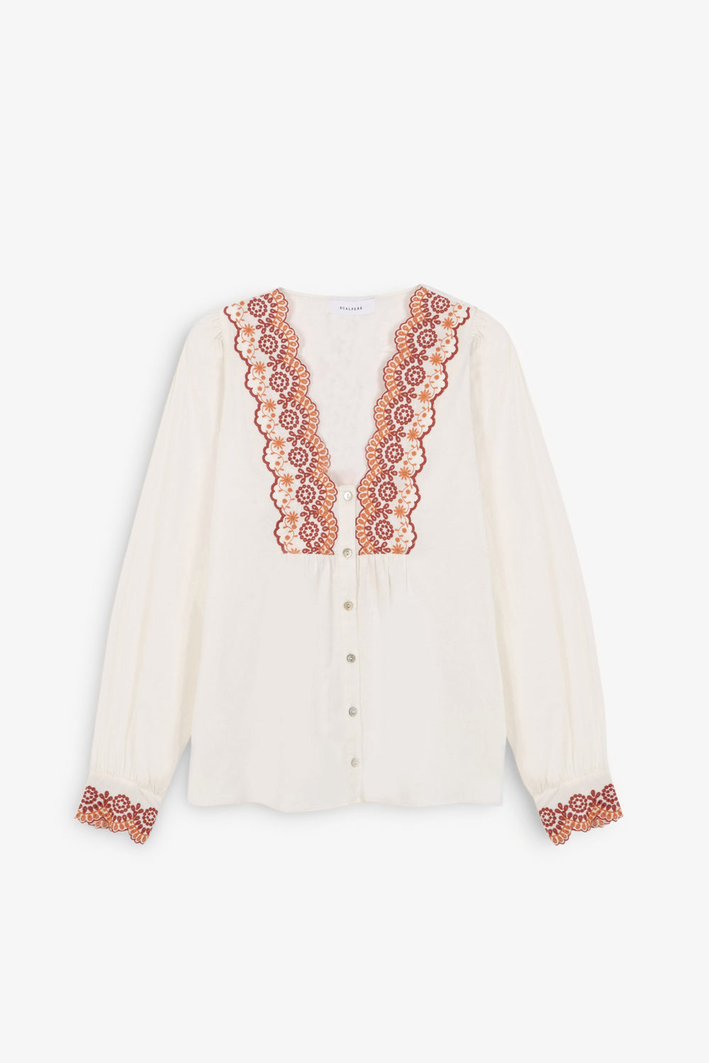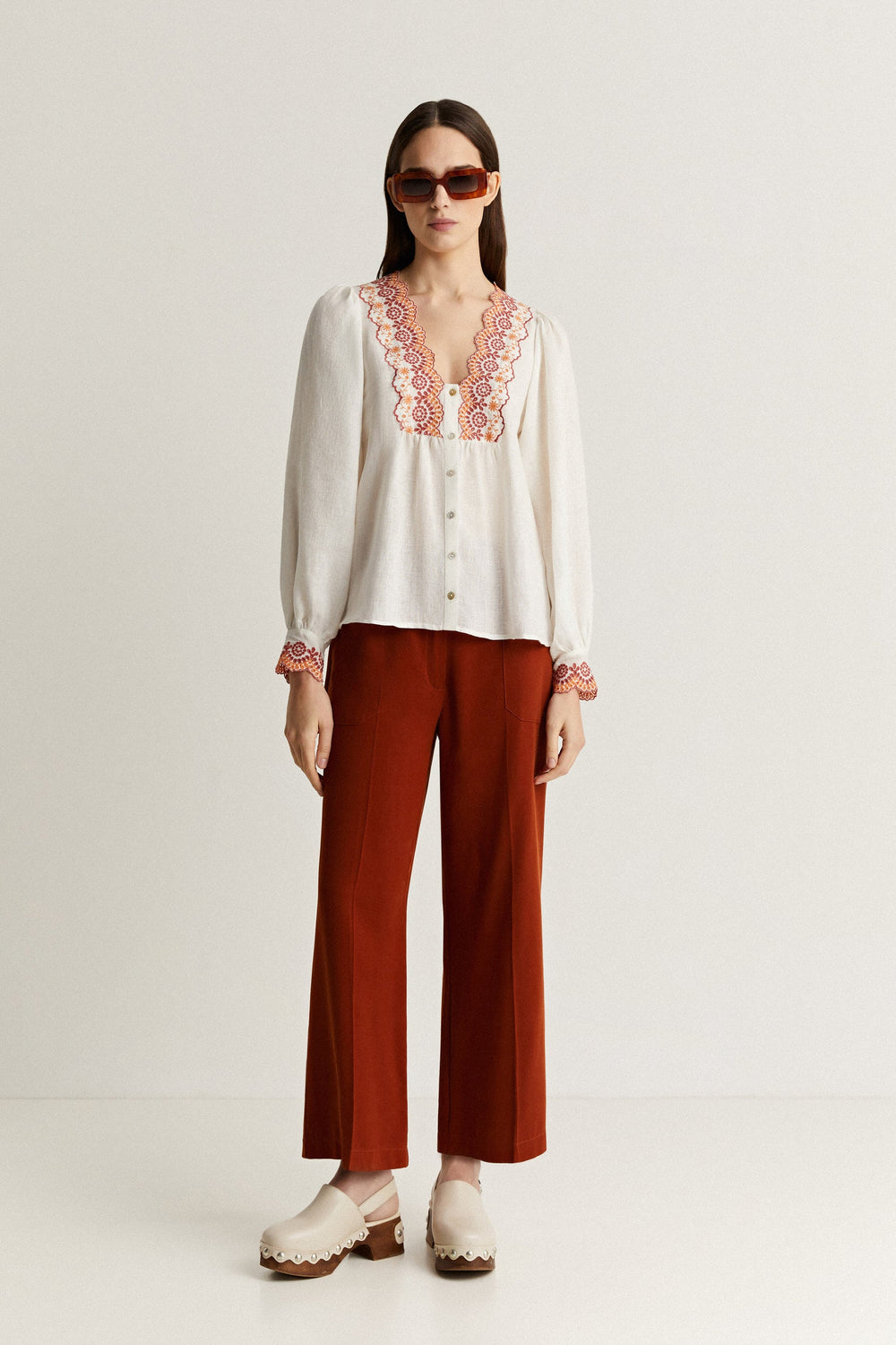 Blouse with contrast embroidered detail on the chest.