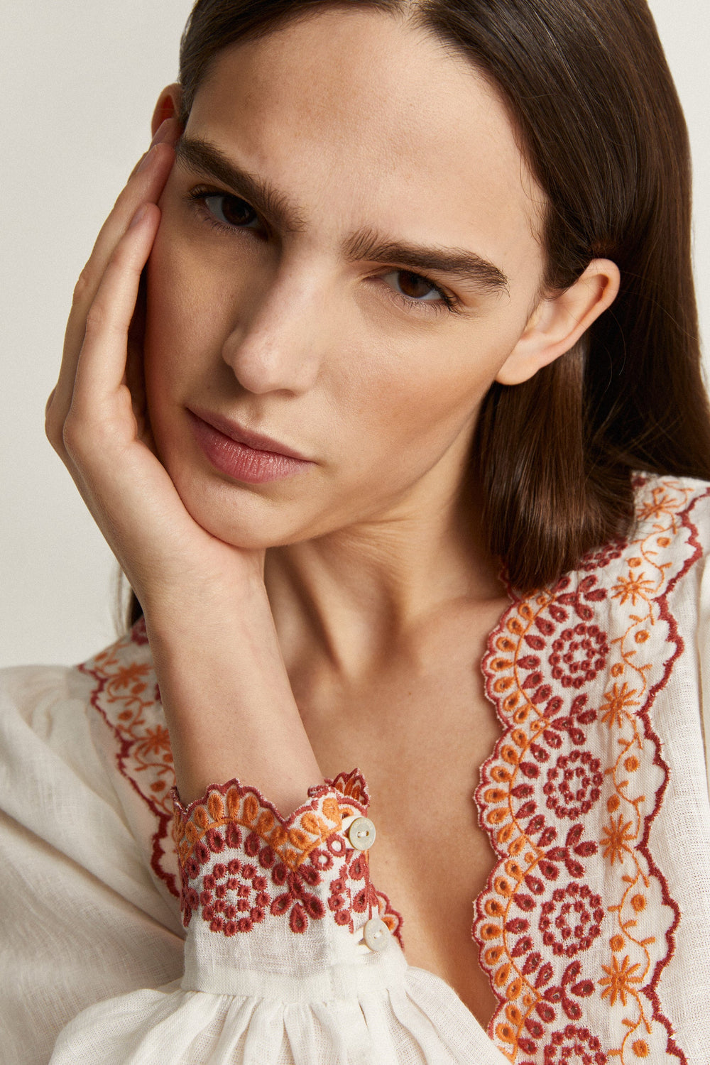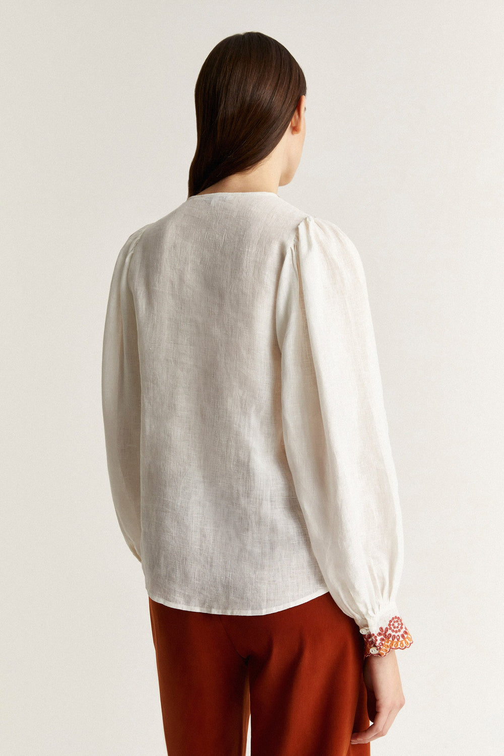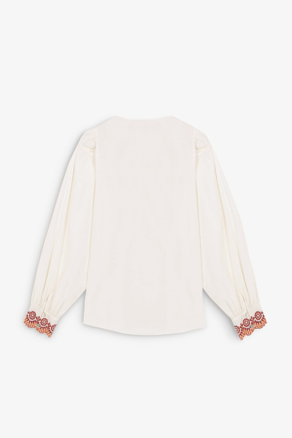 • Long sleeves with embroidered details on cuffs and buttons