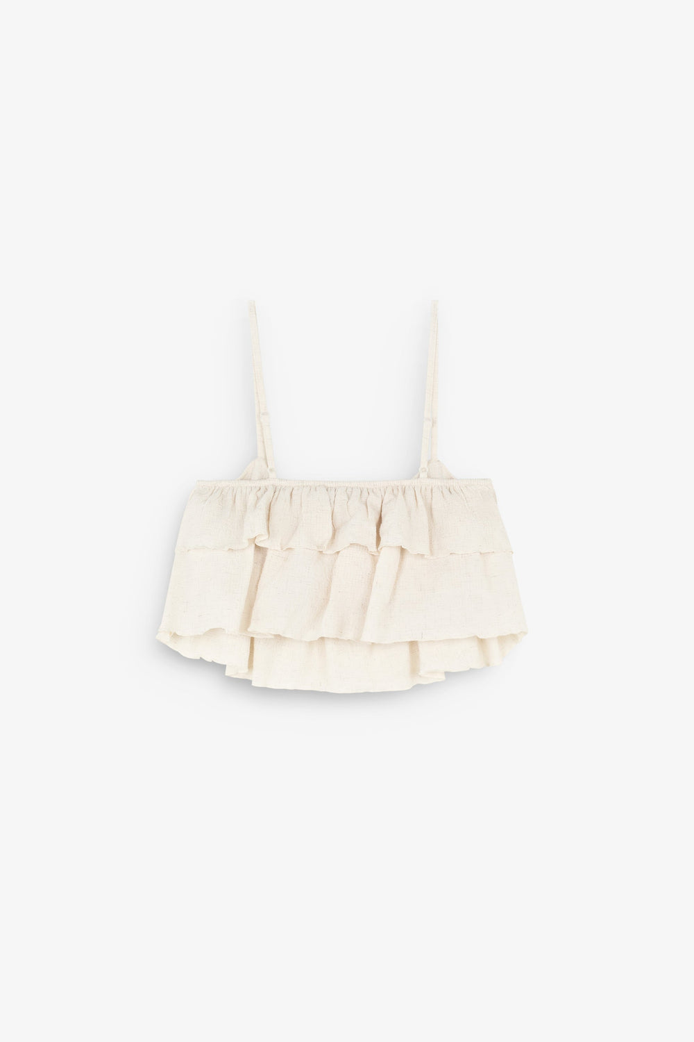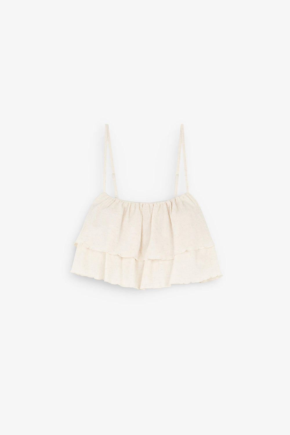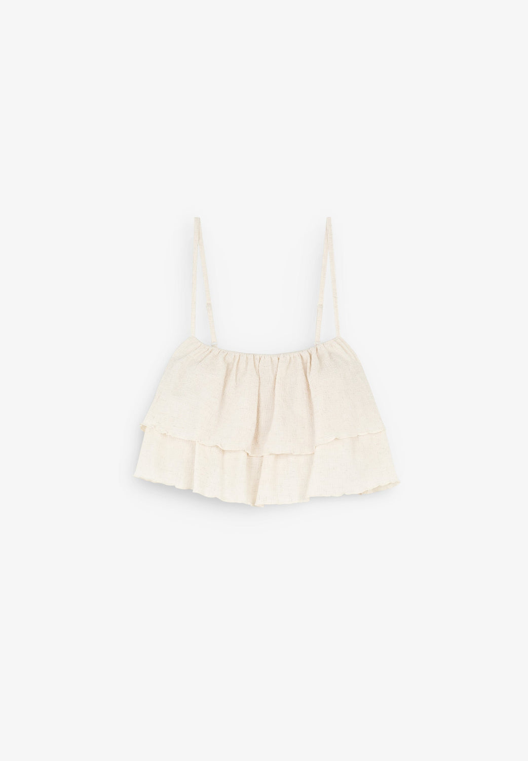 Top in textured fabric with ruffle details.