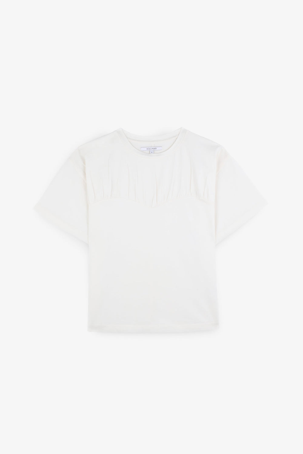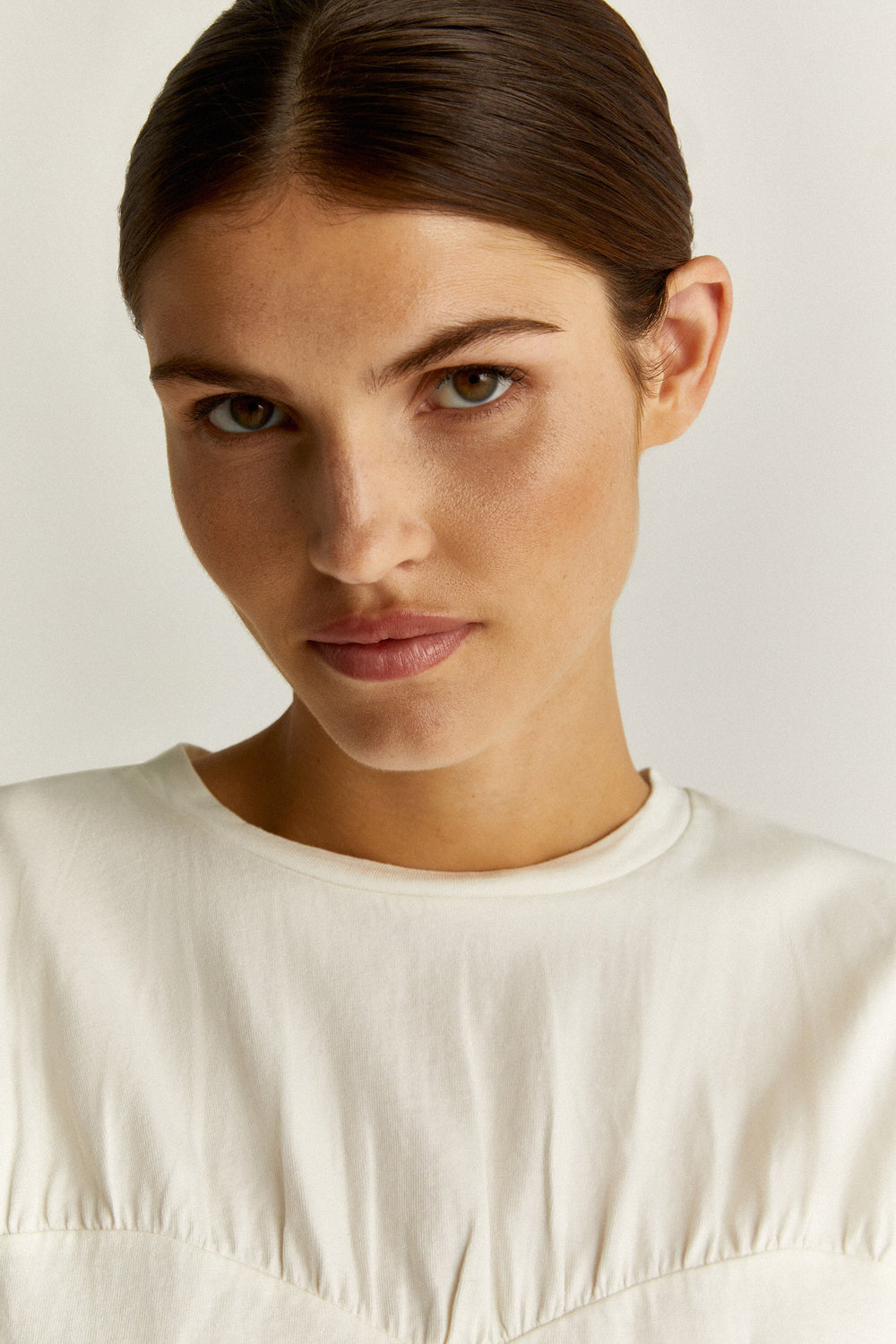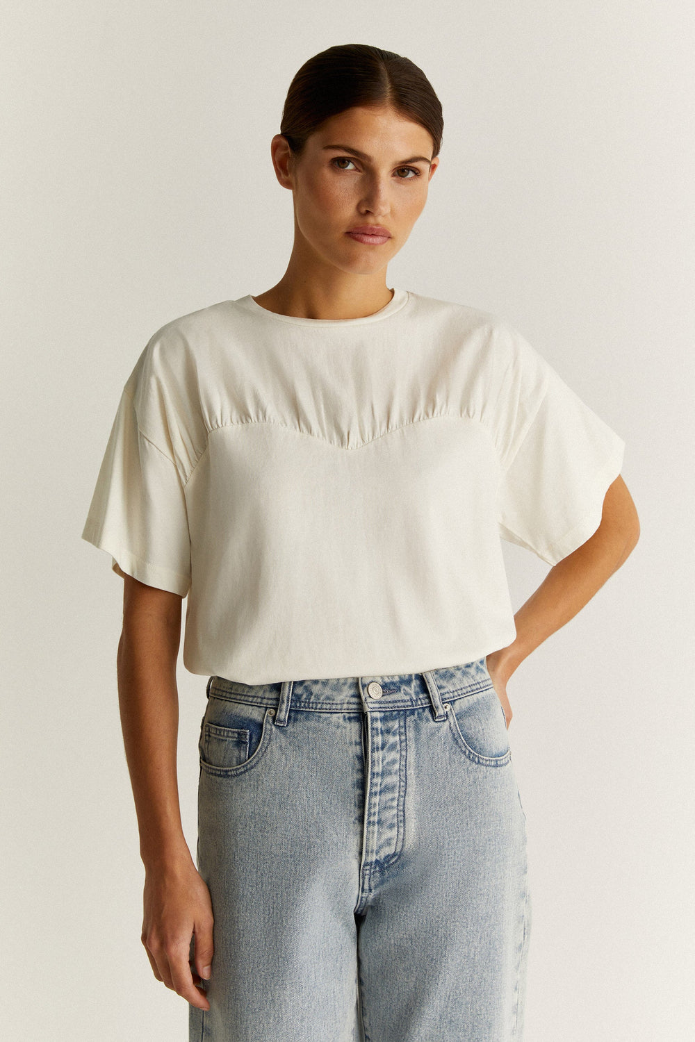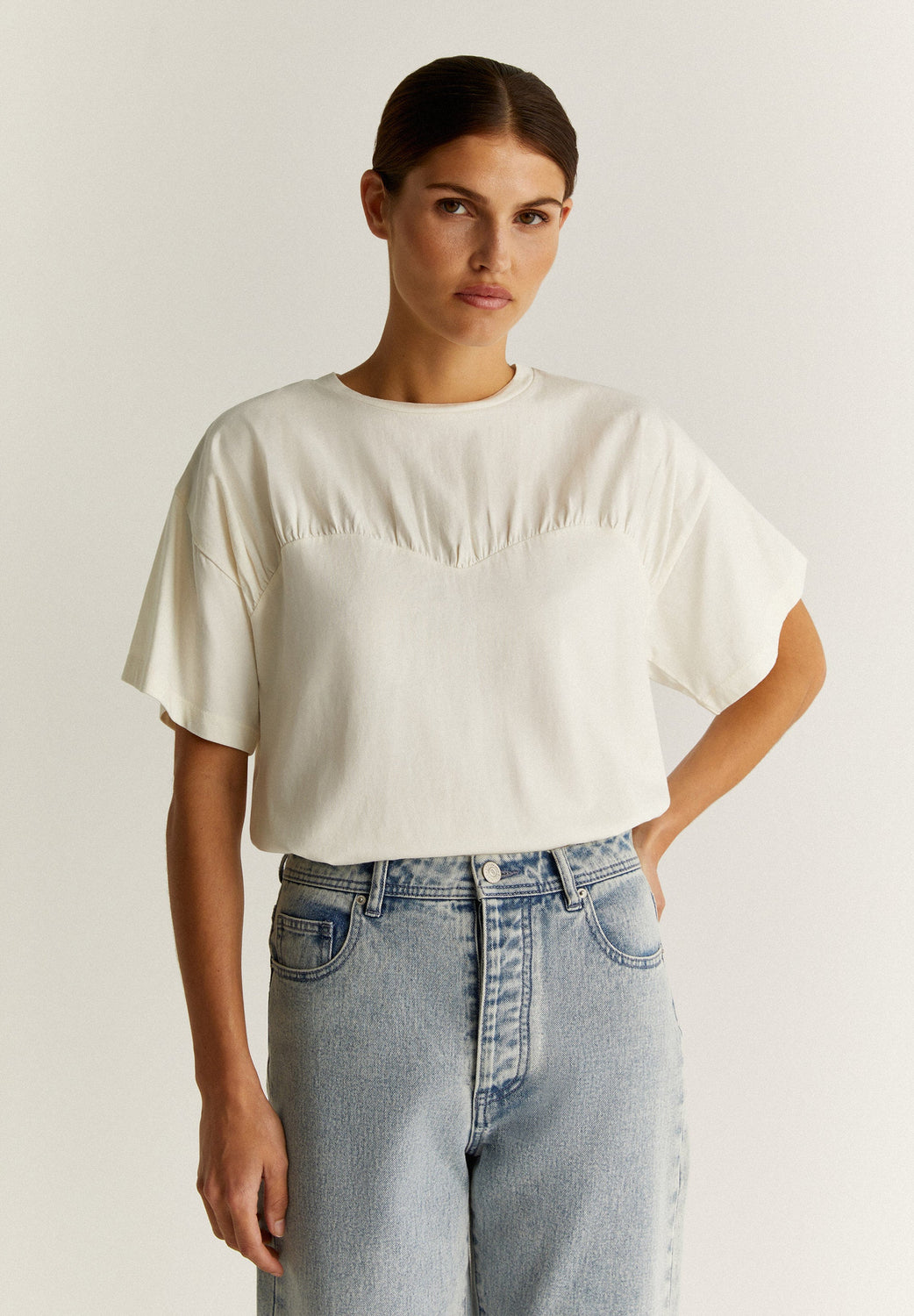 Plain-coloured T-shirt with gathered detail on the upper chest.