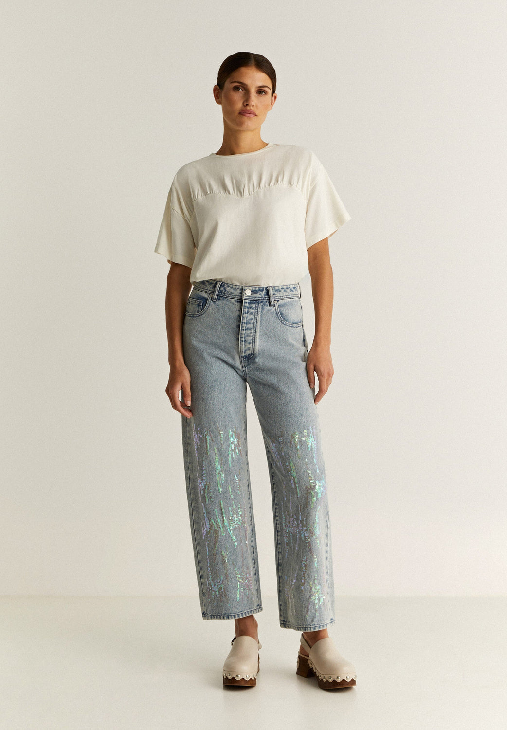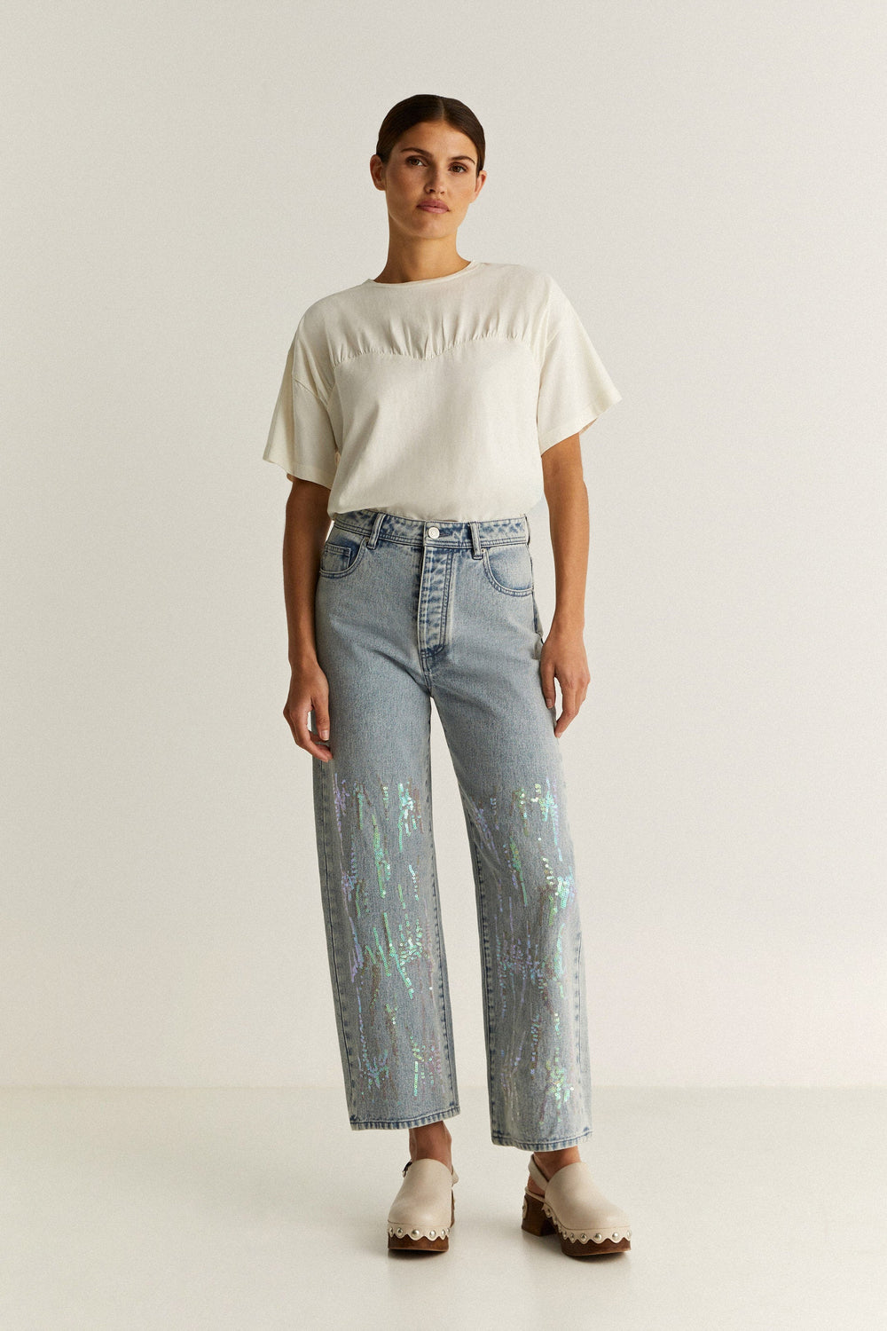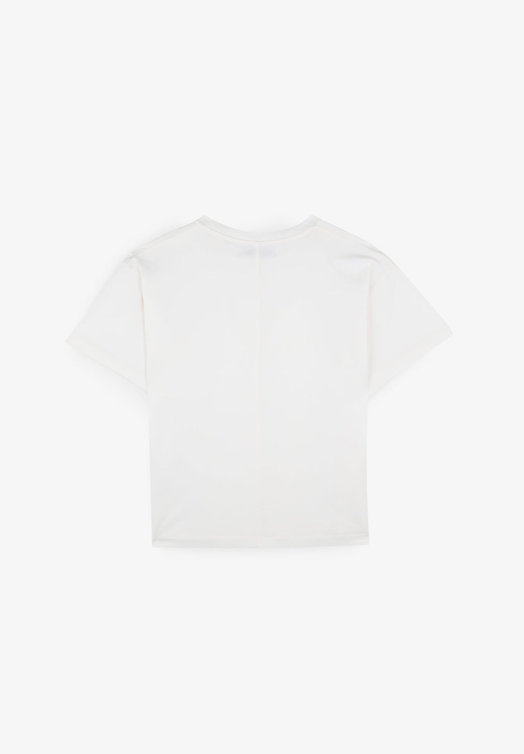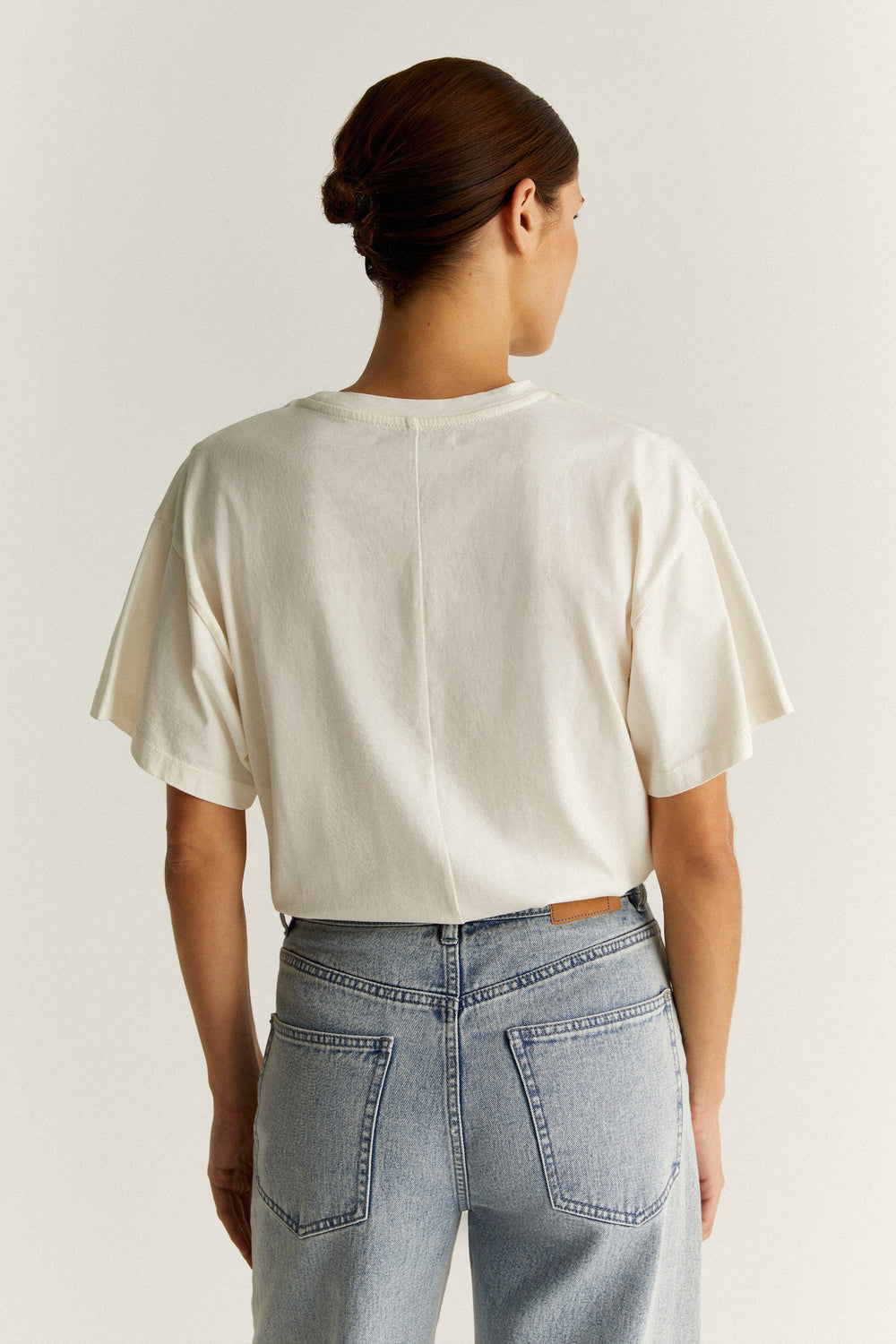Plain-coloured T-shirt with gathered detail on the upper chest.