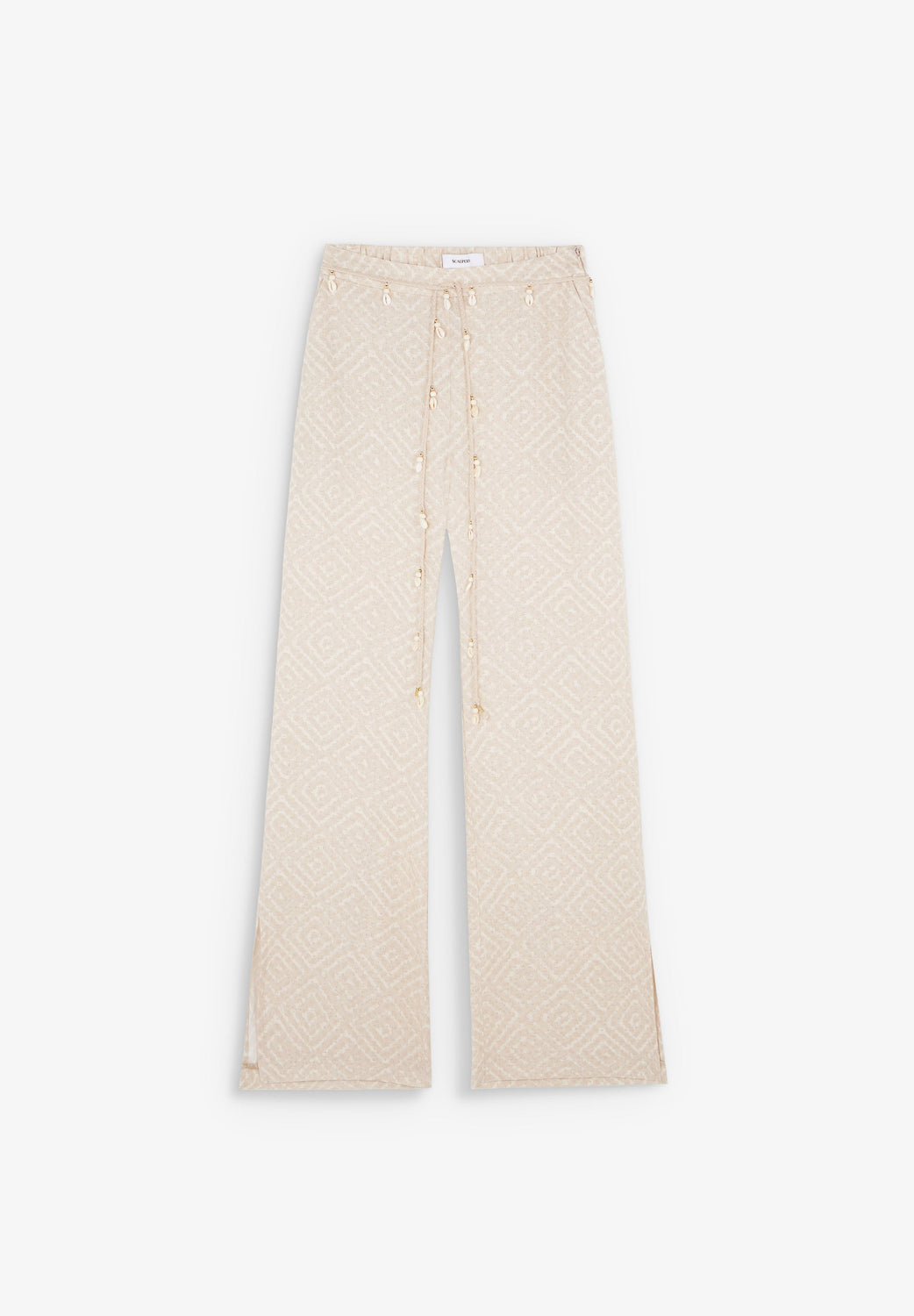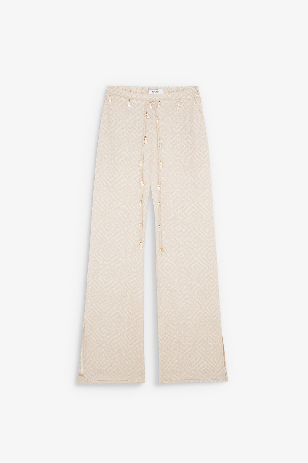 Printed trousers and belt with beads.