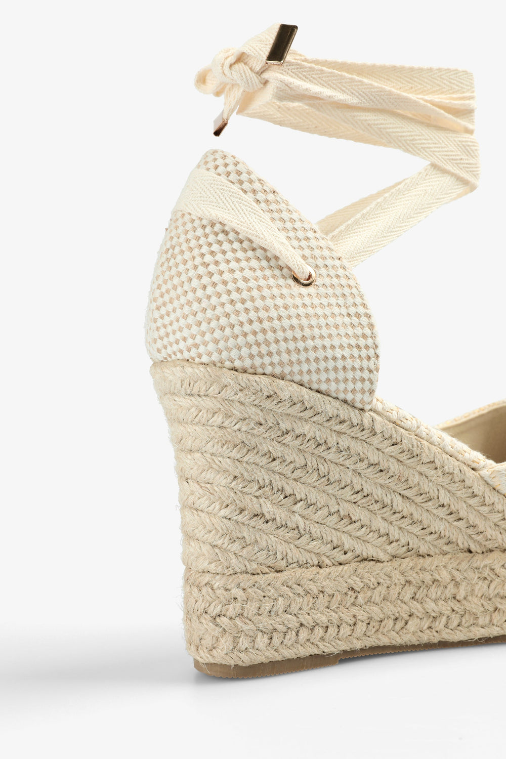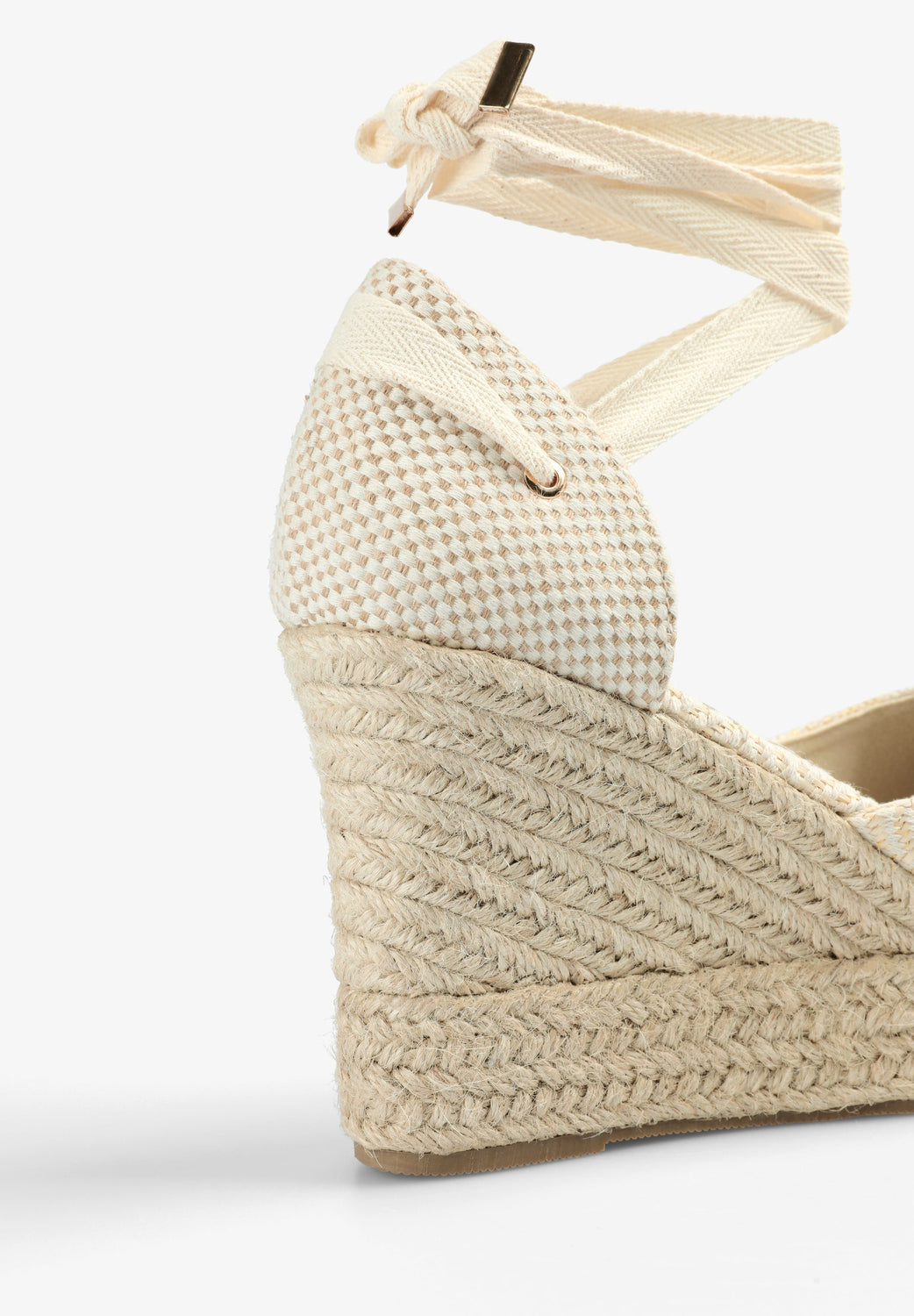 Jute wedge espadrilles. Made of a linen and cotton blend with metallic thread detailing Tie fastening at the ankle. Rubber sole.