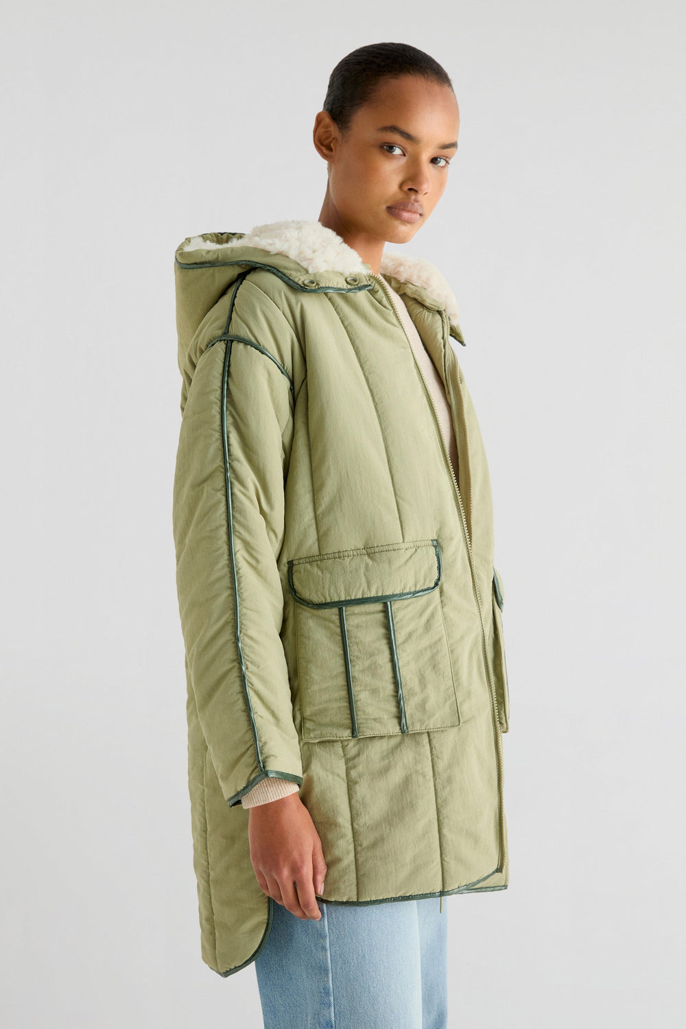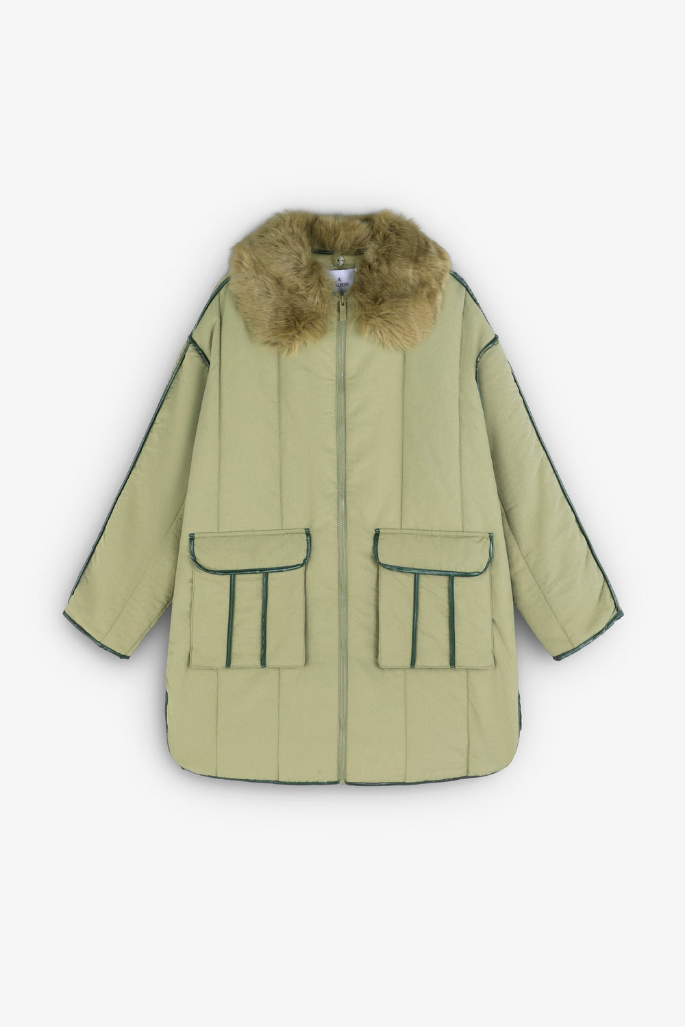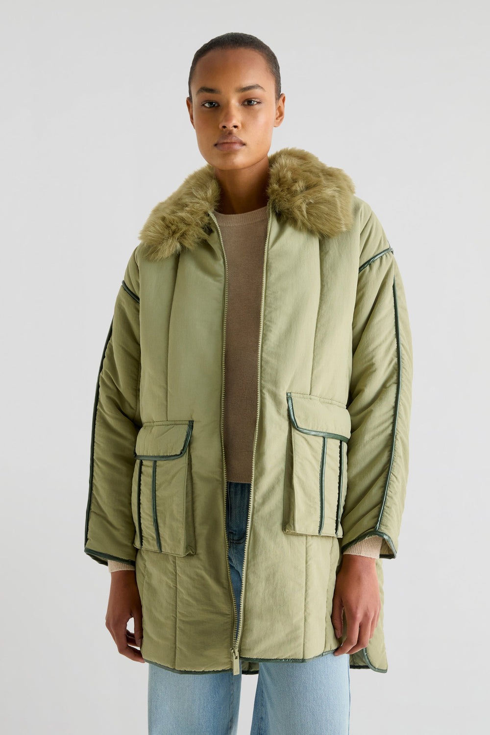 Puffer coat made of technical fabric. Regular fit, collar with detachable hood and with detachable fur and zip fastening. Long sleeves and shearling interior. Rounded hem and side vents, and piping detail at the seams.