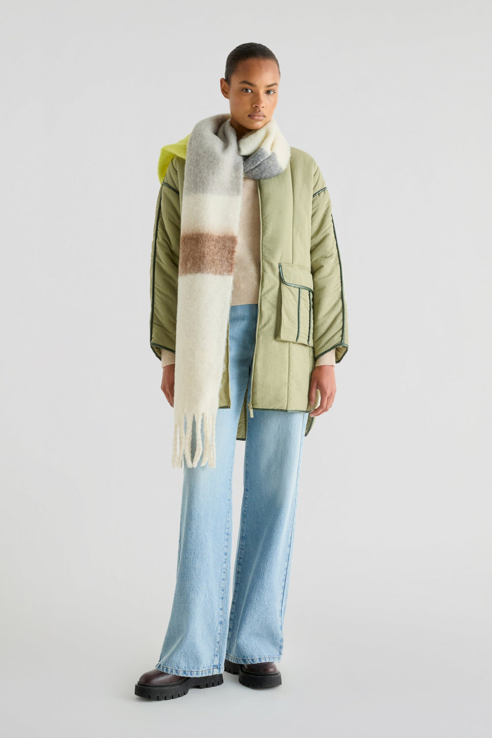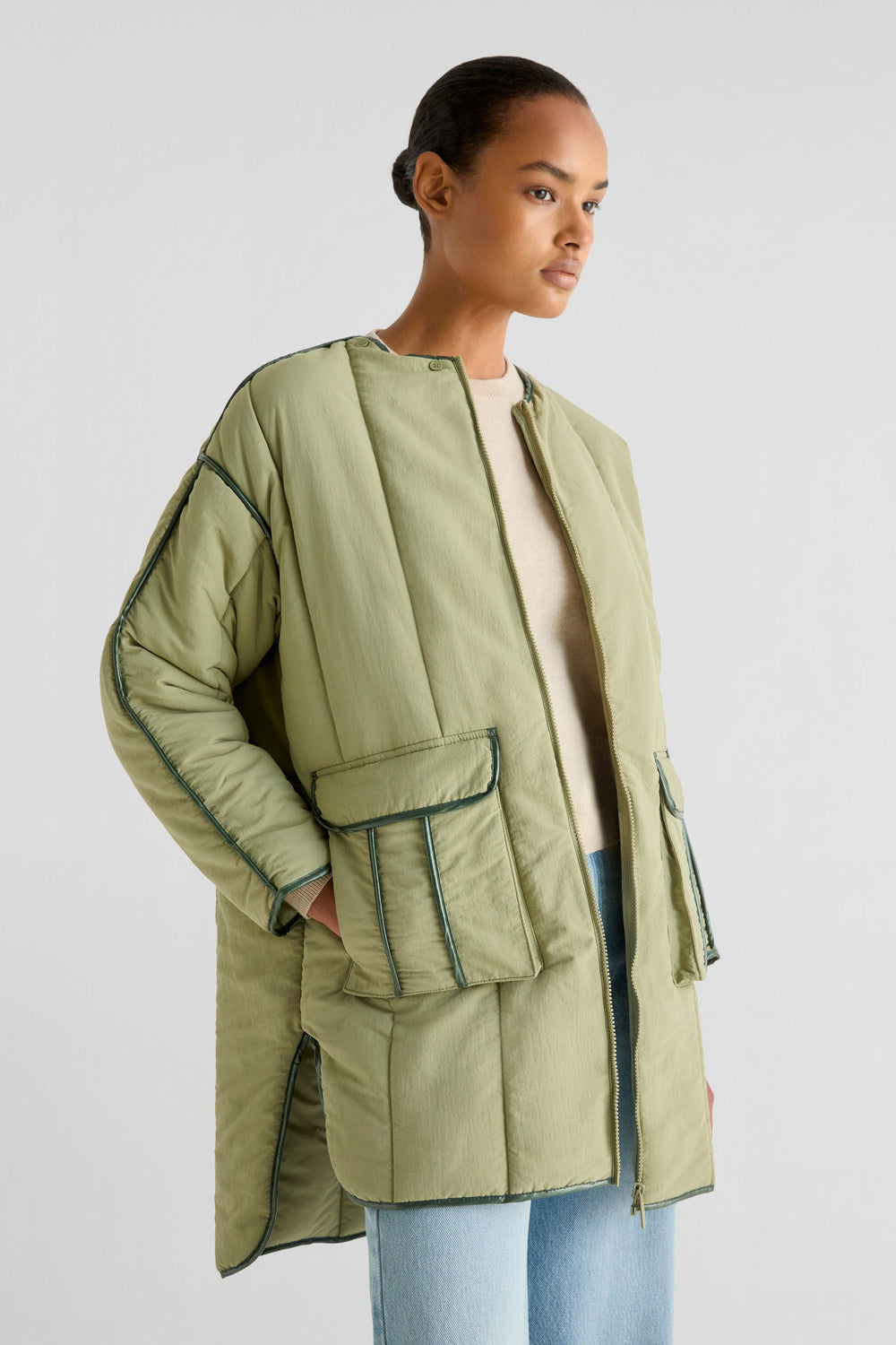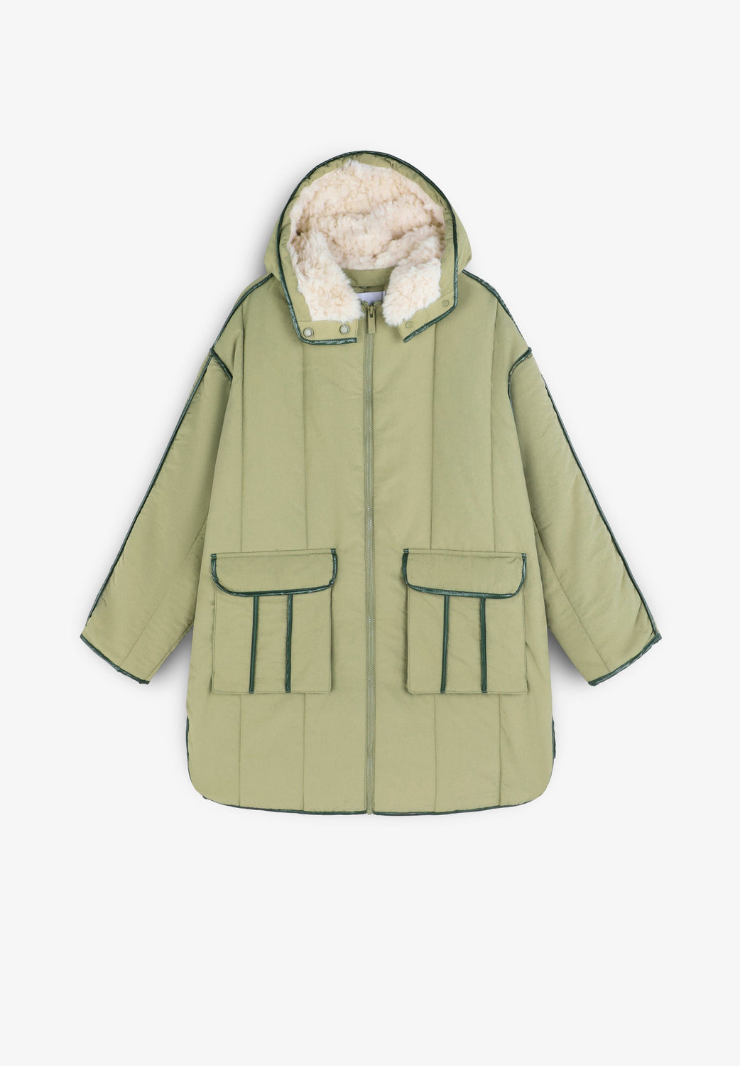 Puffer coat made of technical fabric. Regular fit, collar with detachable hood and with detachable fur and zip fastening. Long sleeves and shearling interior. Rounded hem and side vents, and piping detail at the seams.