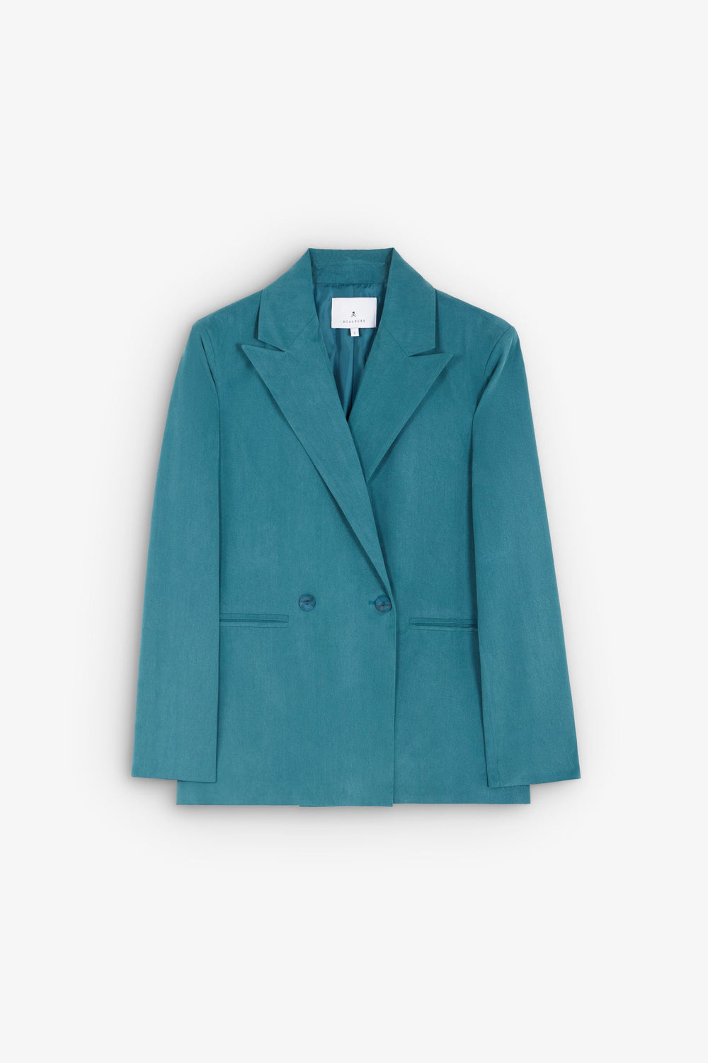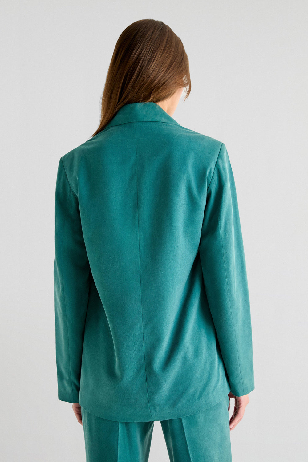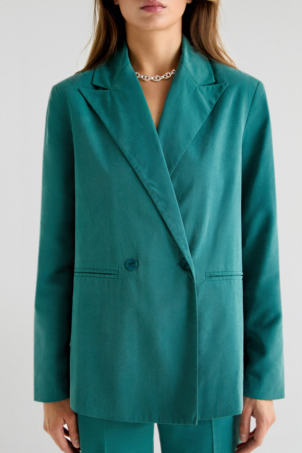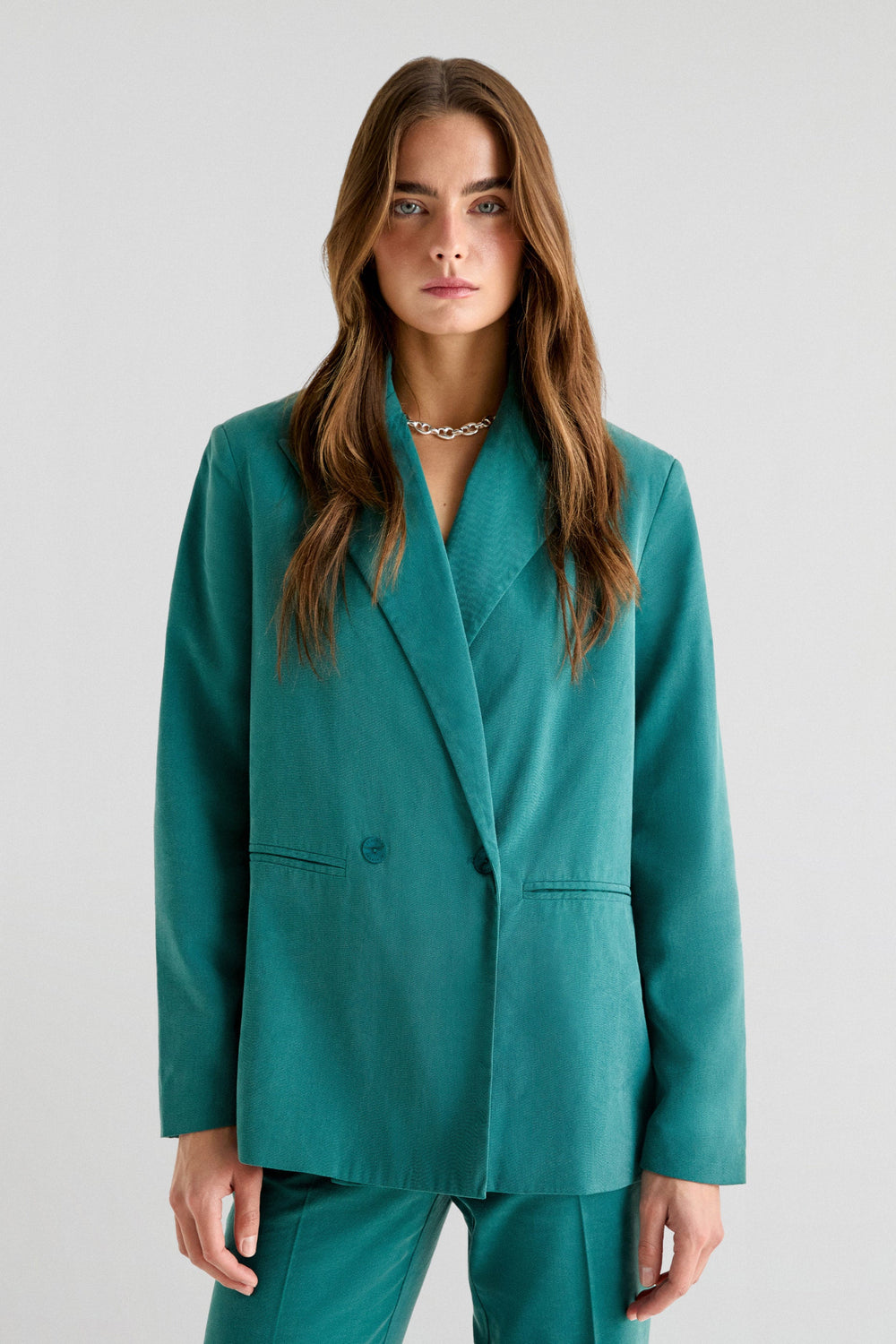 Blazer made of soft fabric. Regular fit, notched lapel collar and double-breasted fastening. Long sleeves and jetted pocket.