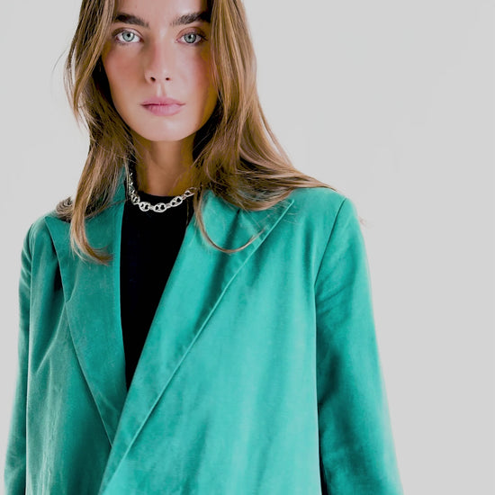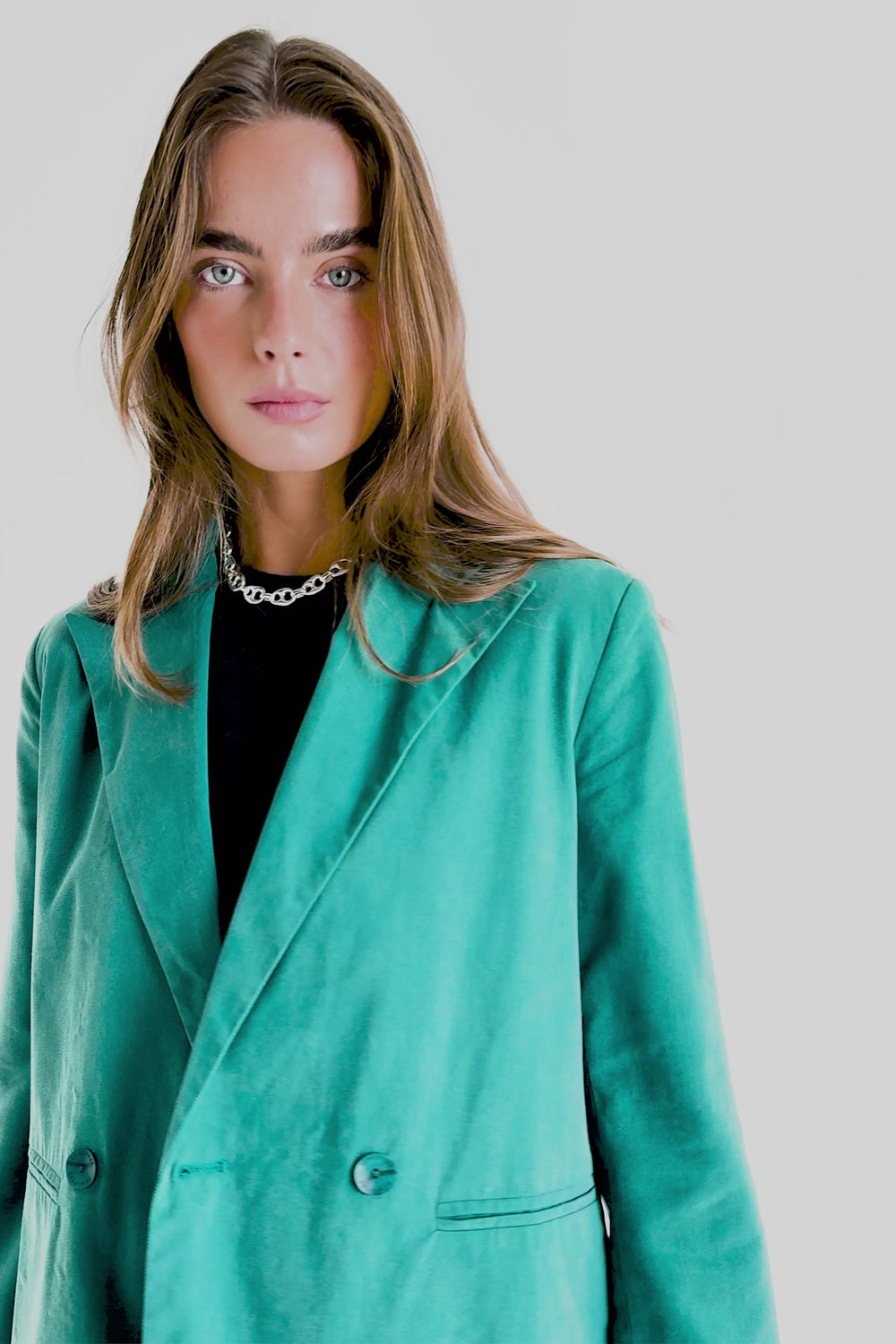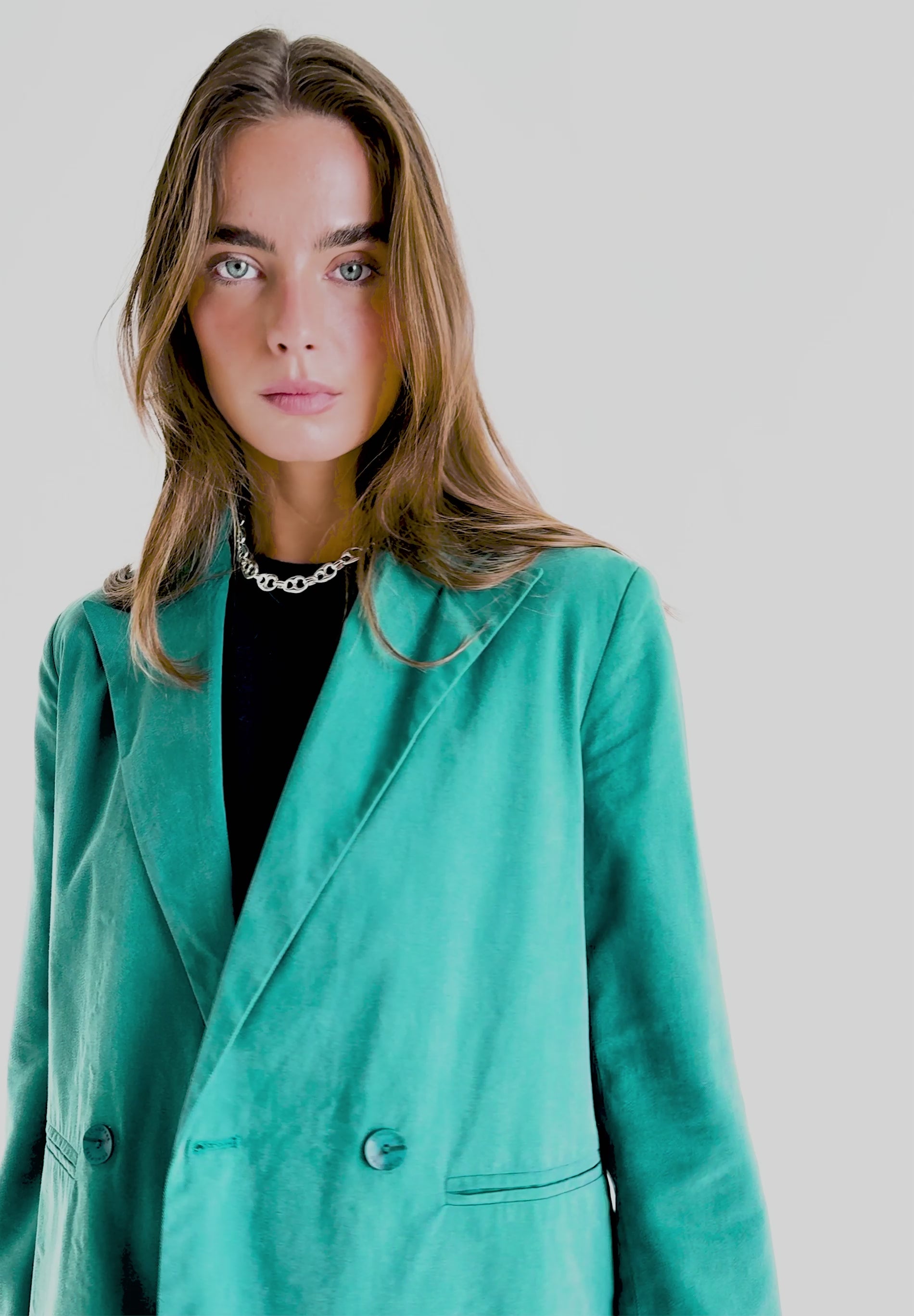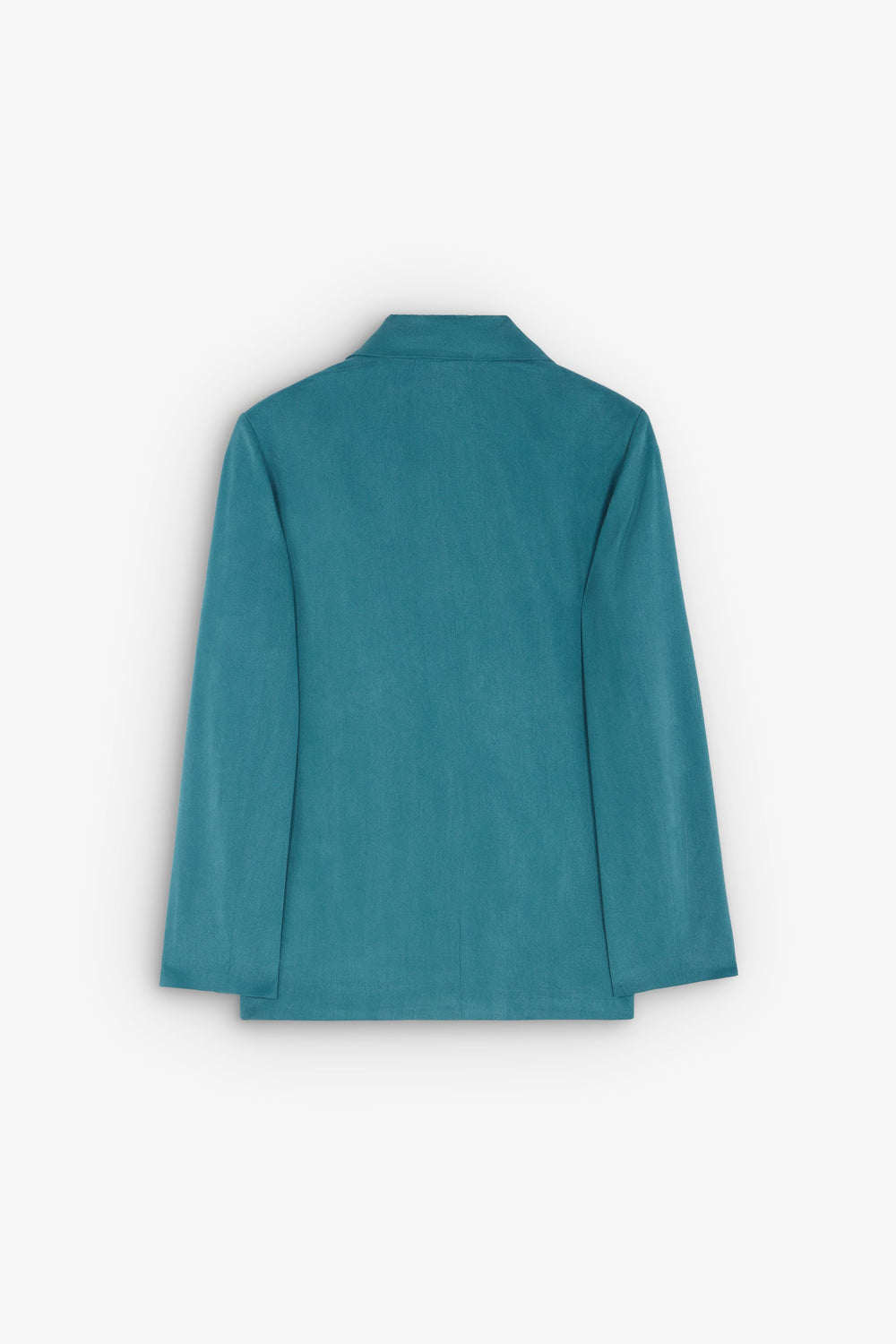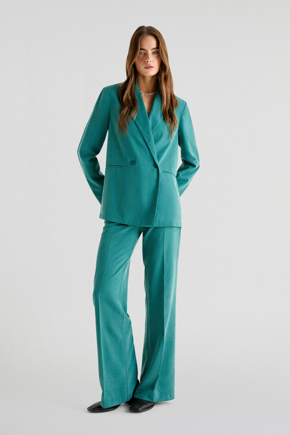 Blazer made of soft fabric. Regular fit, notched lapel collar and double-breasted fastening. Long sleeves and jetted pocket.