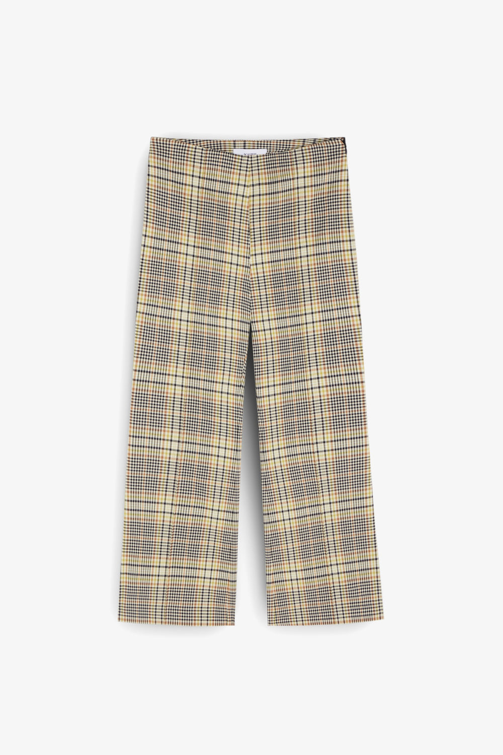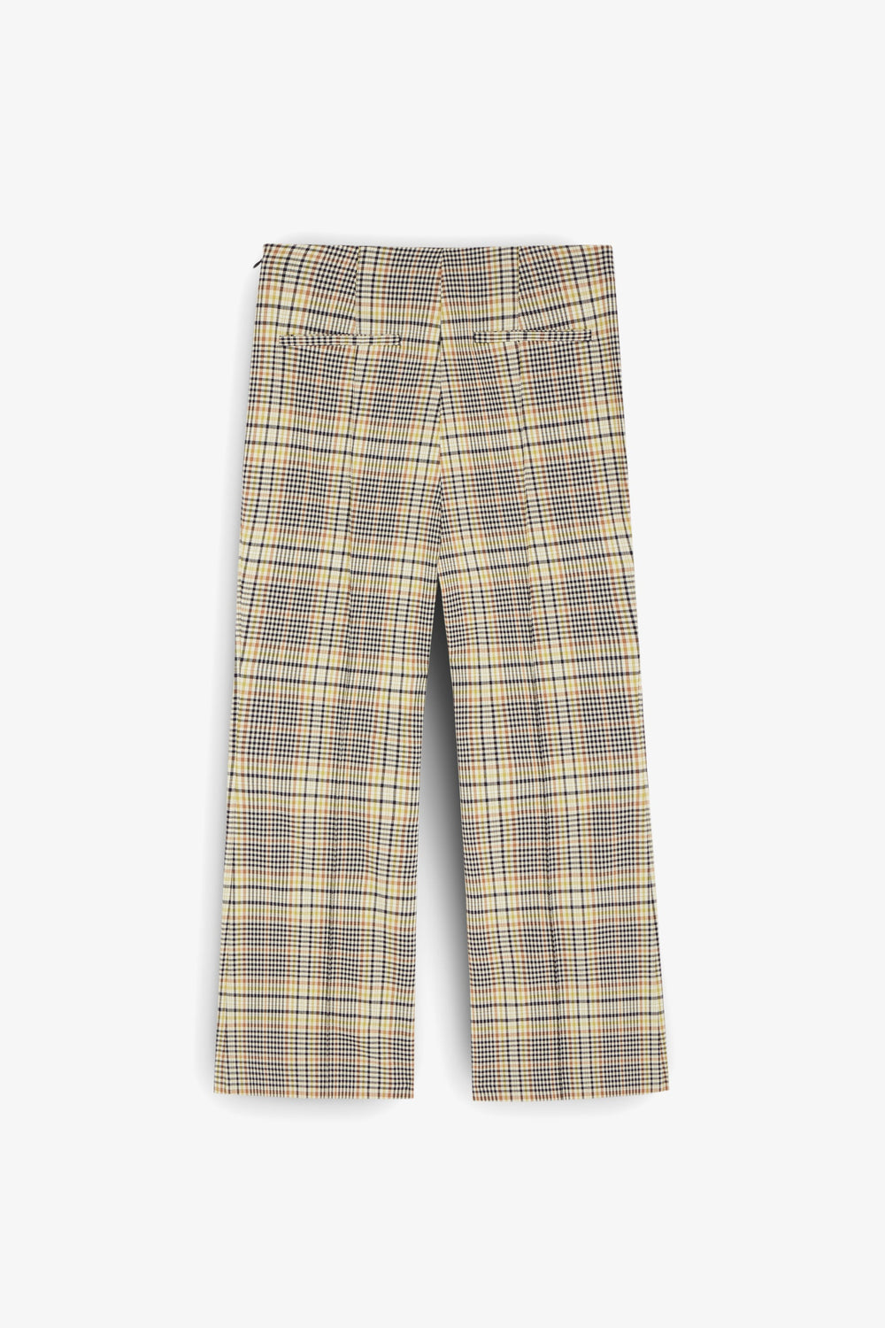 Check print trousers. Ankle flare fit. Side zip fastening.