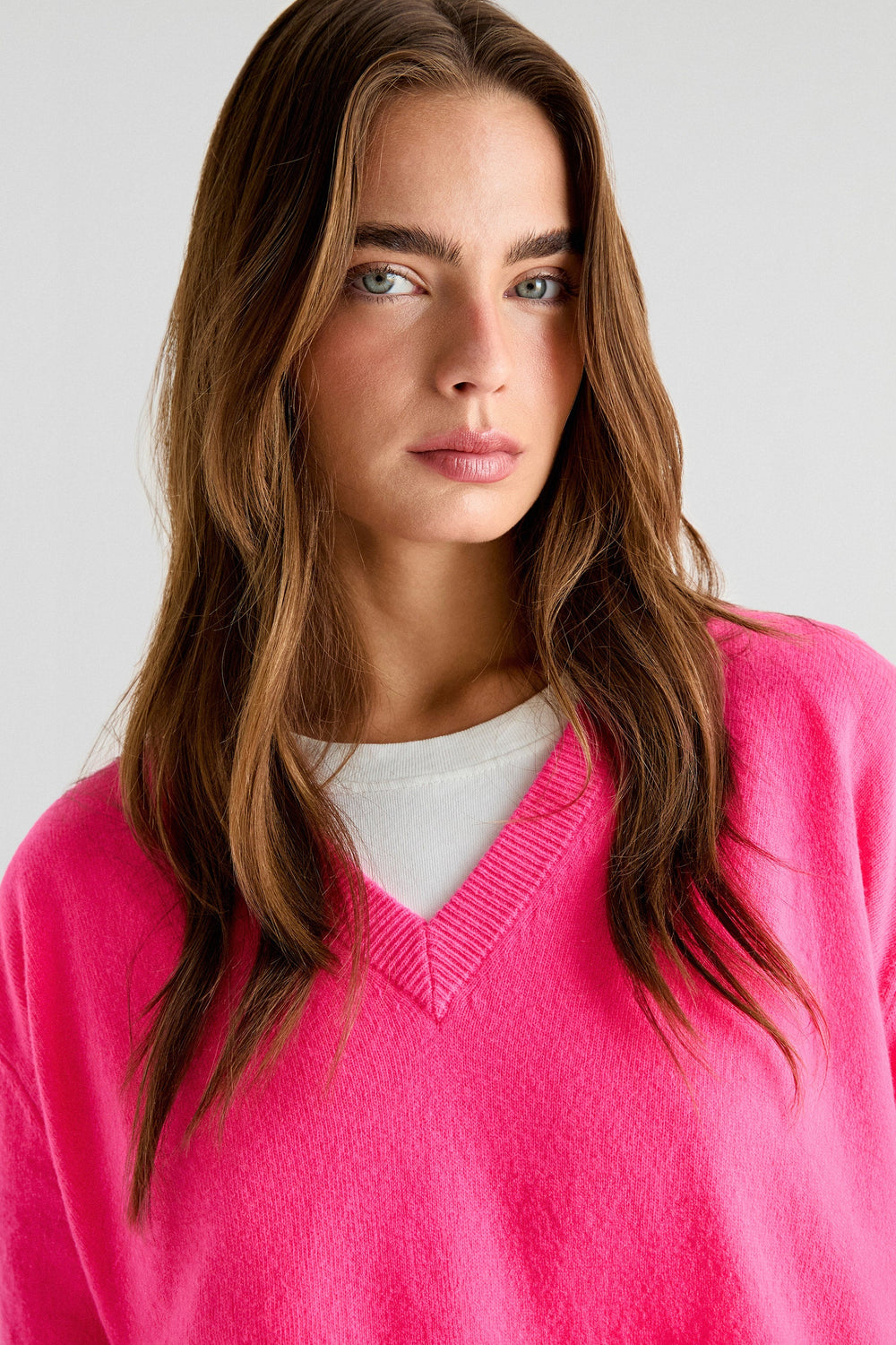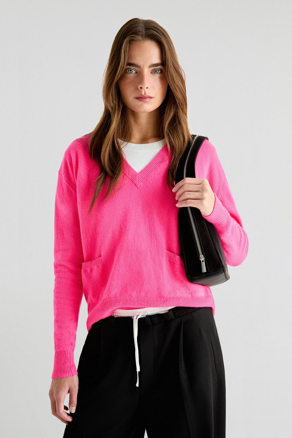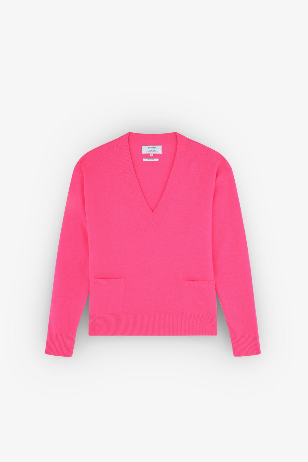 Sweater made of a wool blend. Regular fit, V-neck and long sleeves. Front pockets.