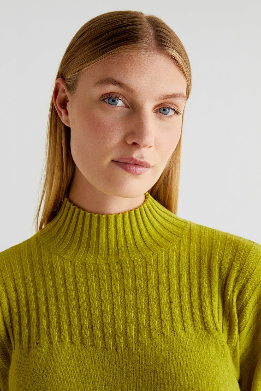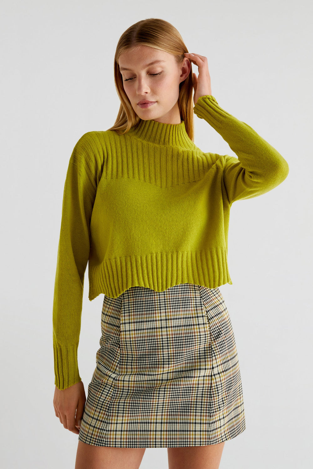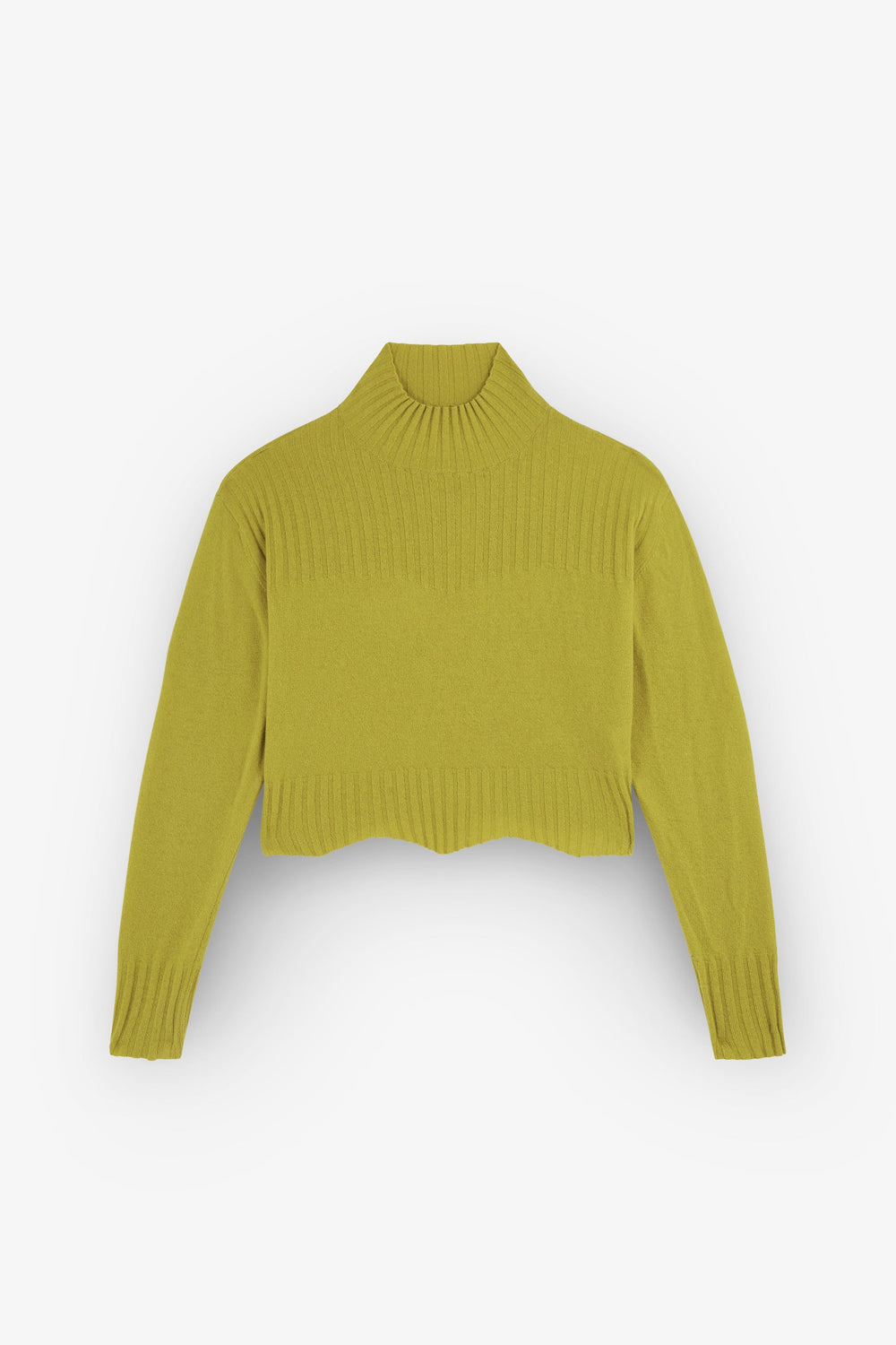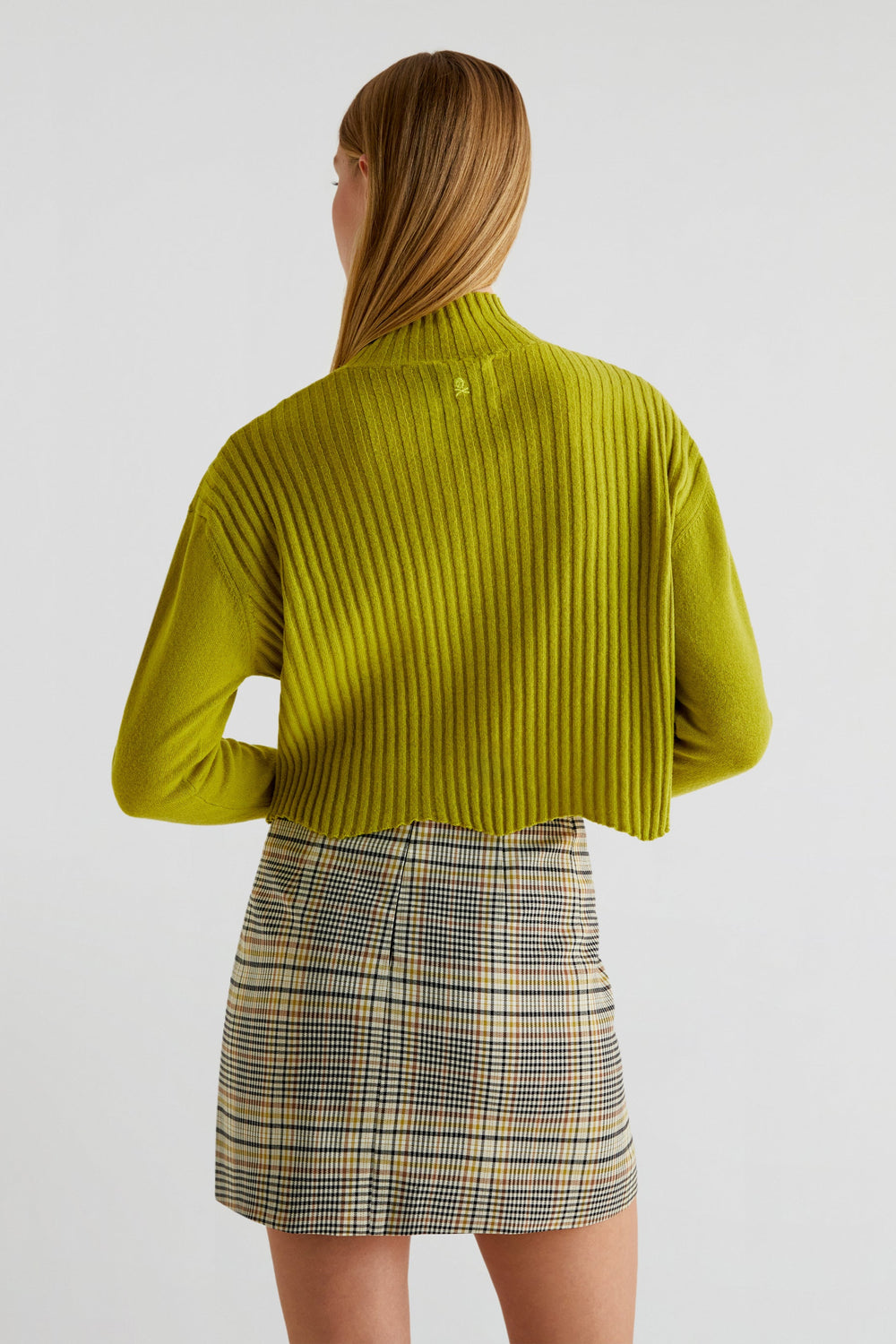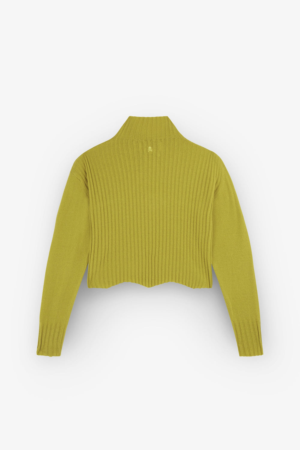 Sweater made of a wool blend. Slightly cropped regular fit, high collar and long sleeves. Hem with wavy detail and back skull.