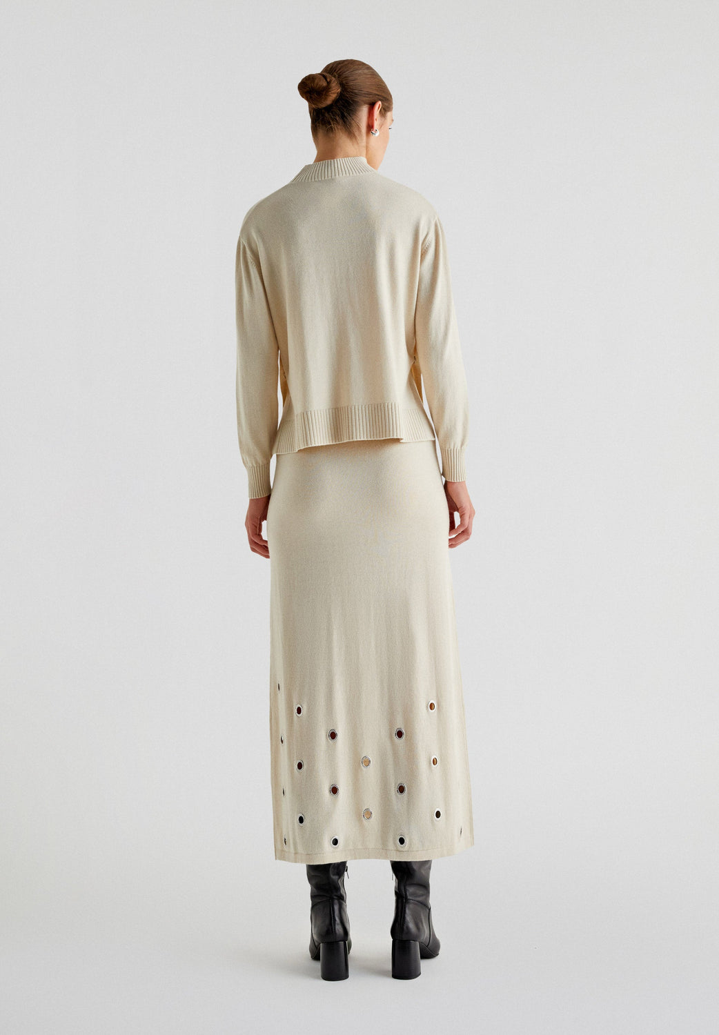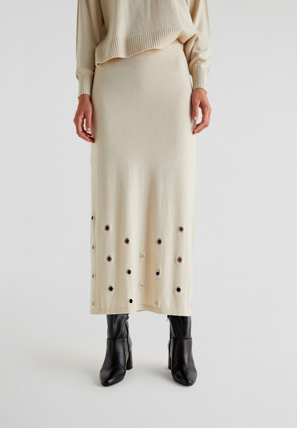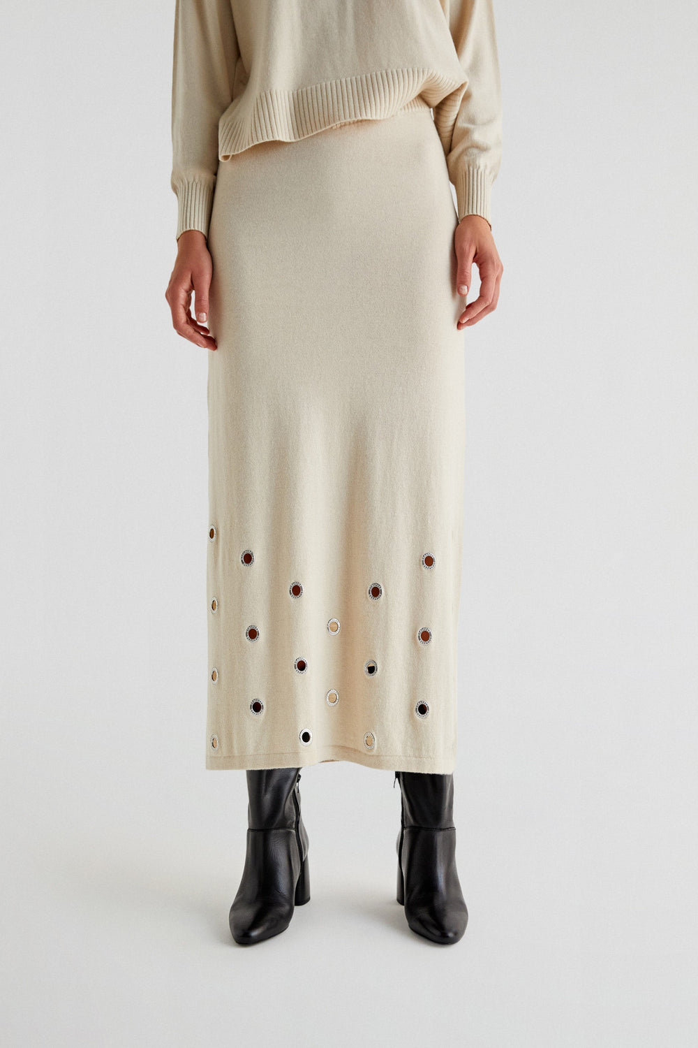 Knit midi skirt made of cotton blend fabric. Slim fit and eyelet details on the hem.
