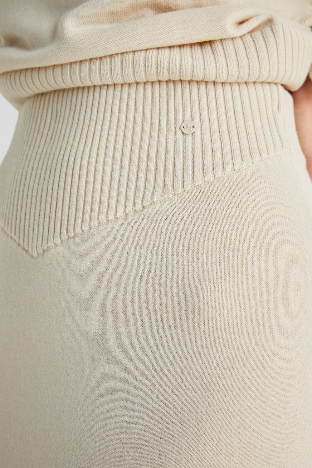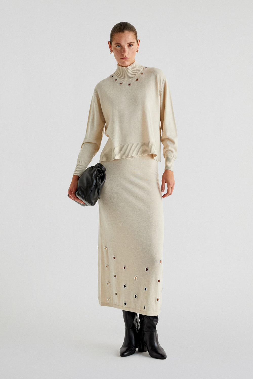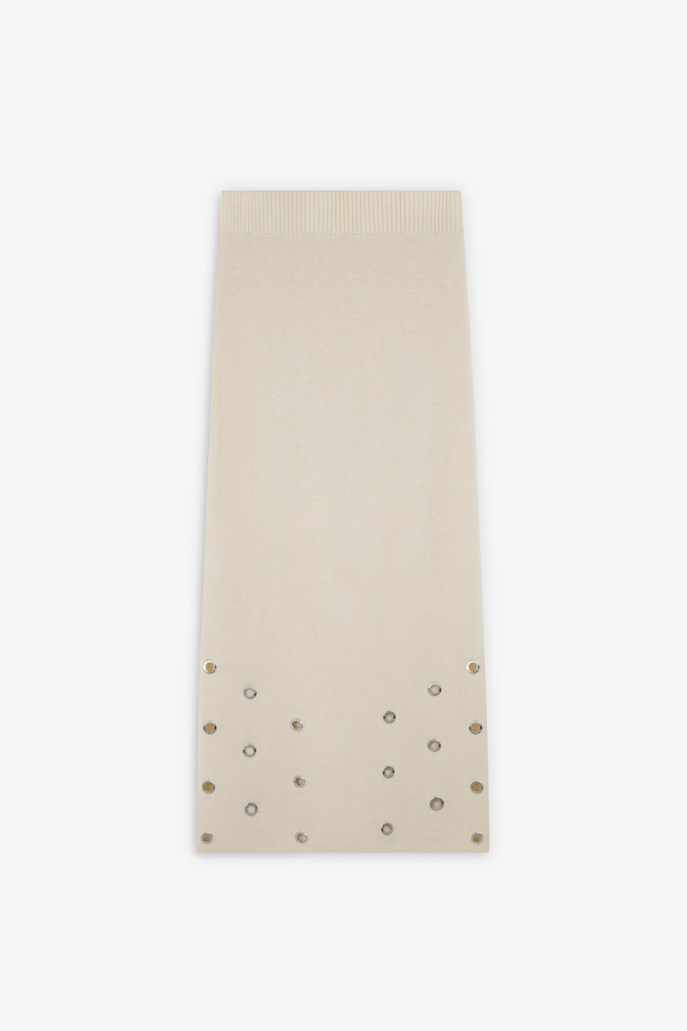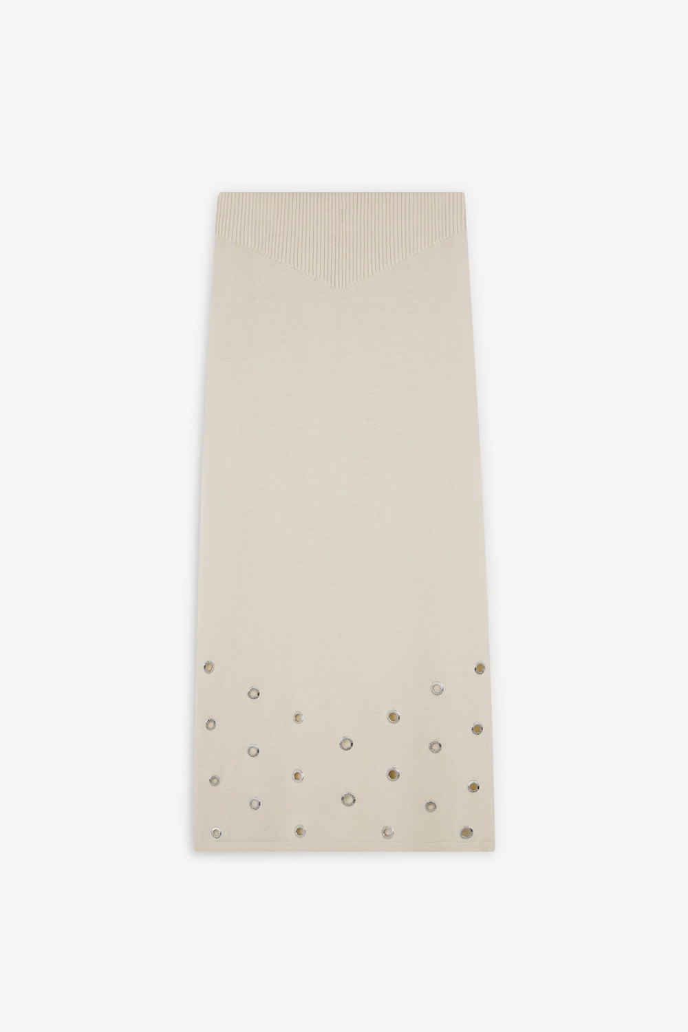 Knit midi skirt made of cotton blend fabric. Slim fit and eyelet details on the hem.