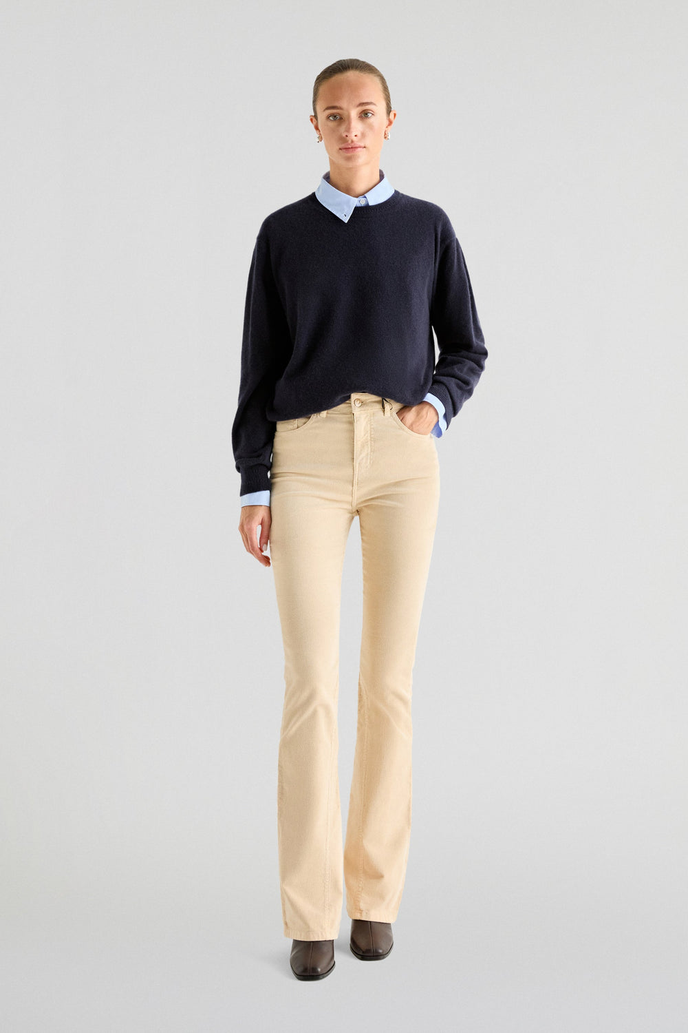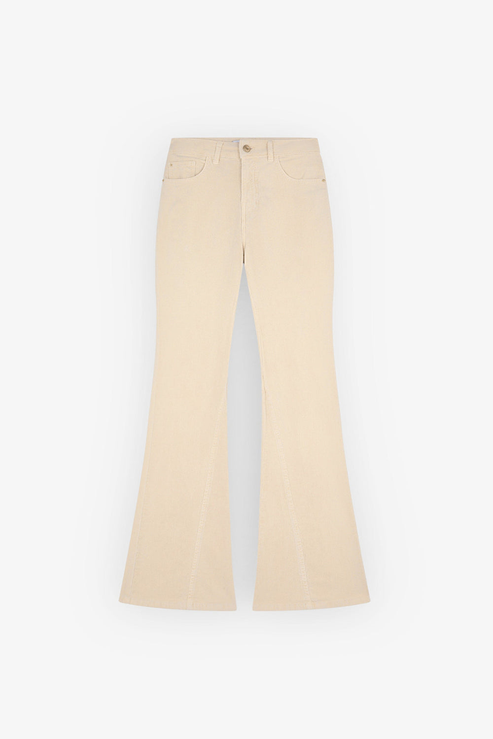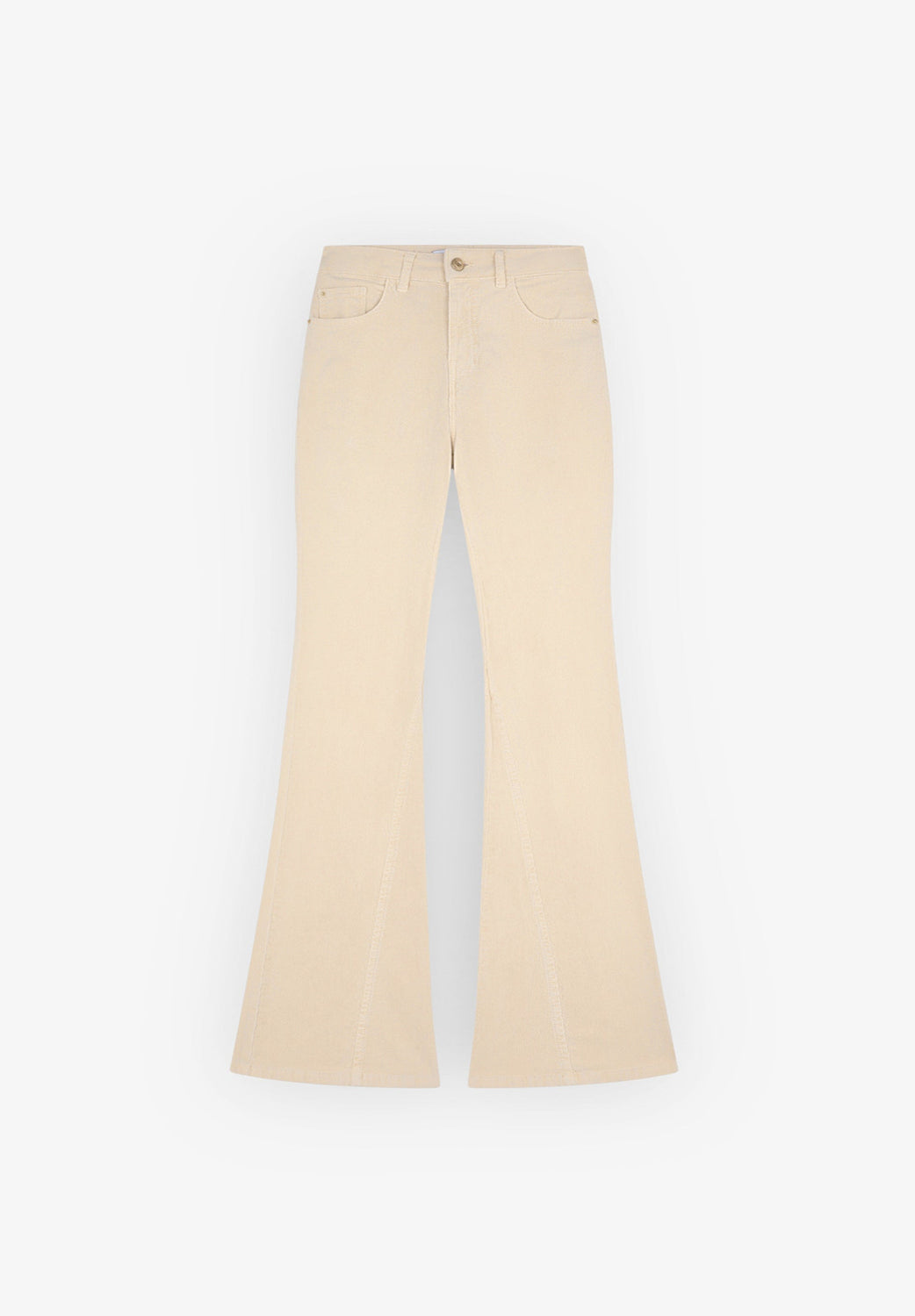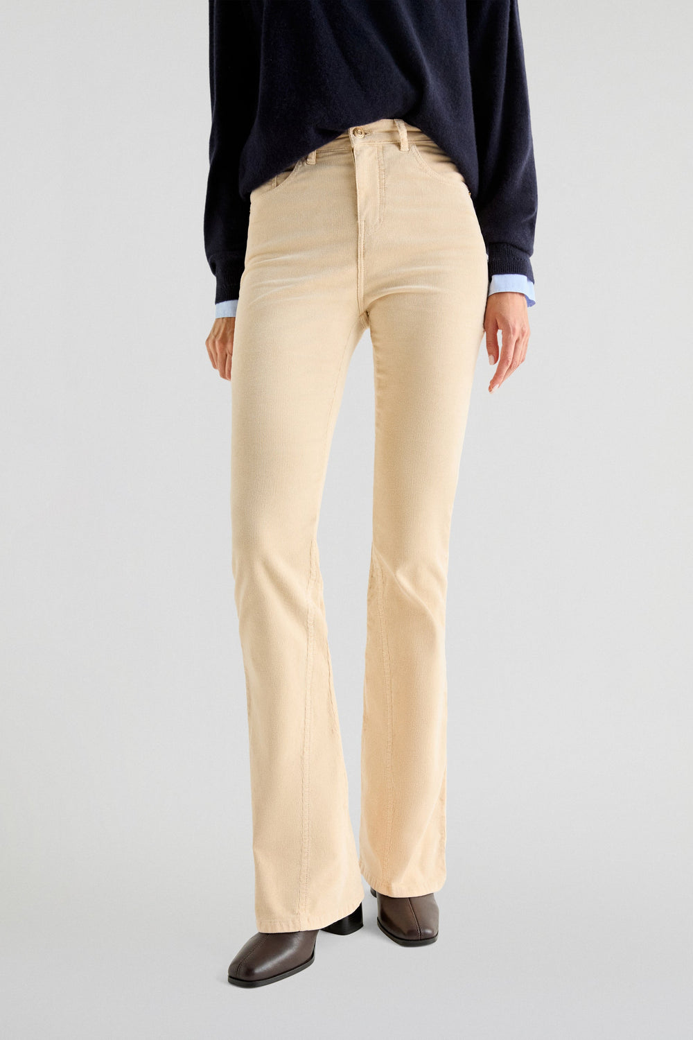 Corduroy trousers made from slightly stretch cotton fabric. Bootcut slim fit, top button and zip fly fastening and front and back pockets. Belt loops at the waist.