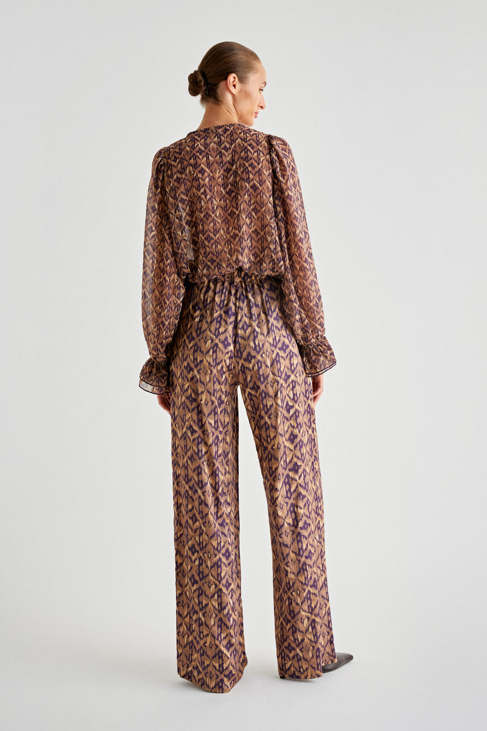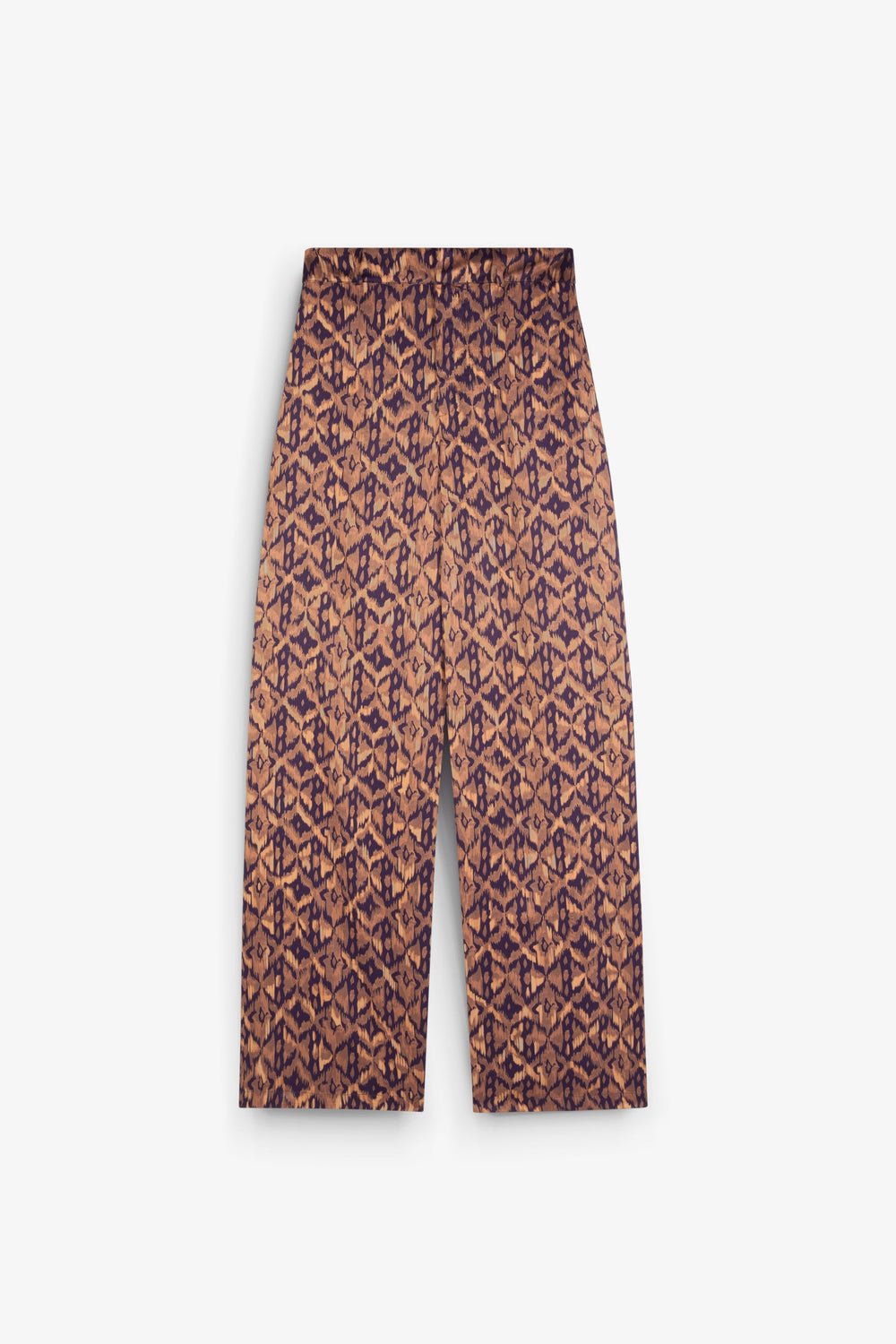 Palazzo ethnic trousers made in flowing fabric. Regular fit, high-rise cut, hook and zip fastening. Elastic at the back.