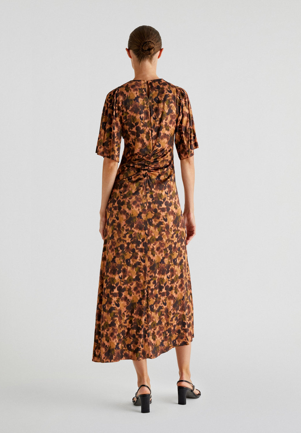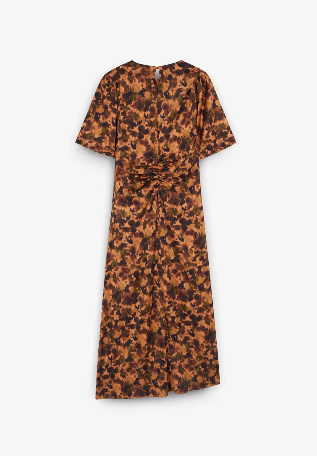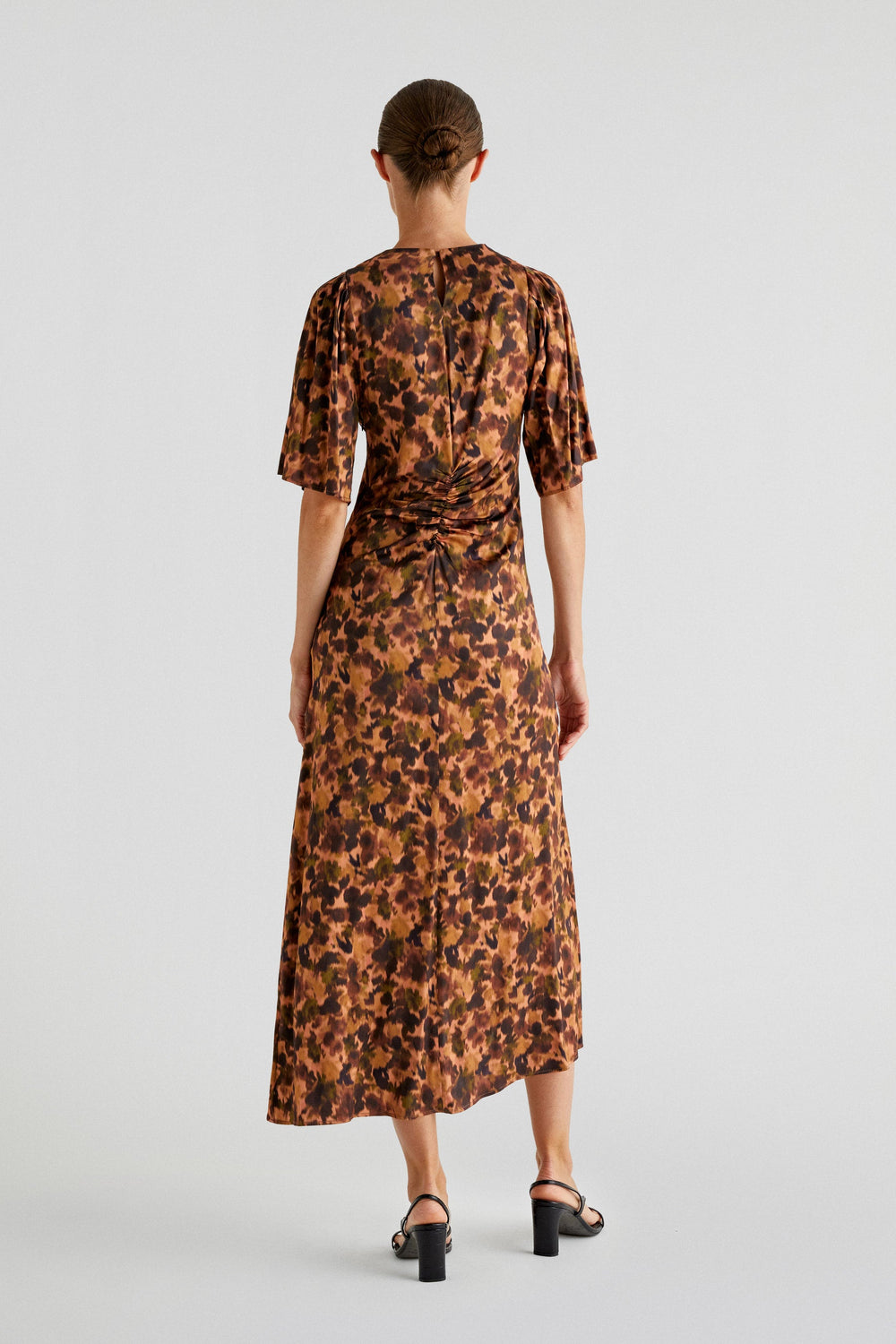 Draped midi dress with central seam. Short sleeves and back button eyelets.