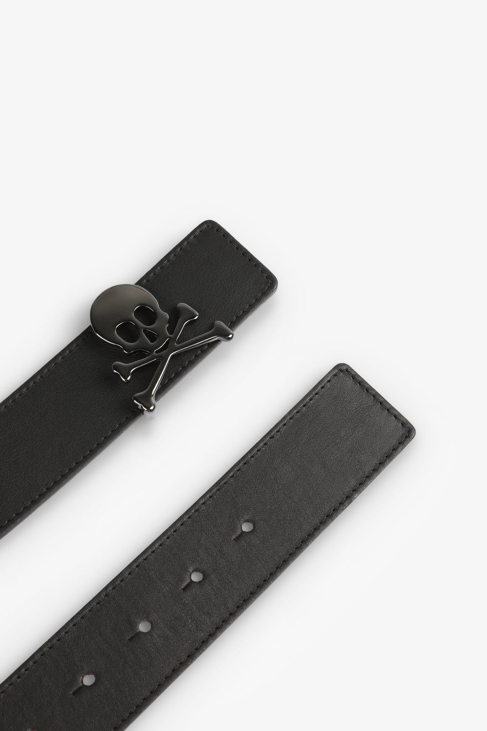 Metallic reversible belt. Made from 100% leather. Snap fastening. Metallic skull on the front.