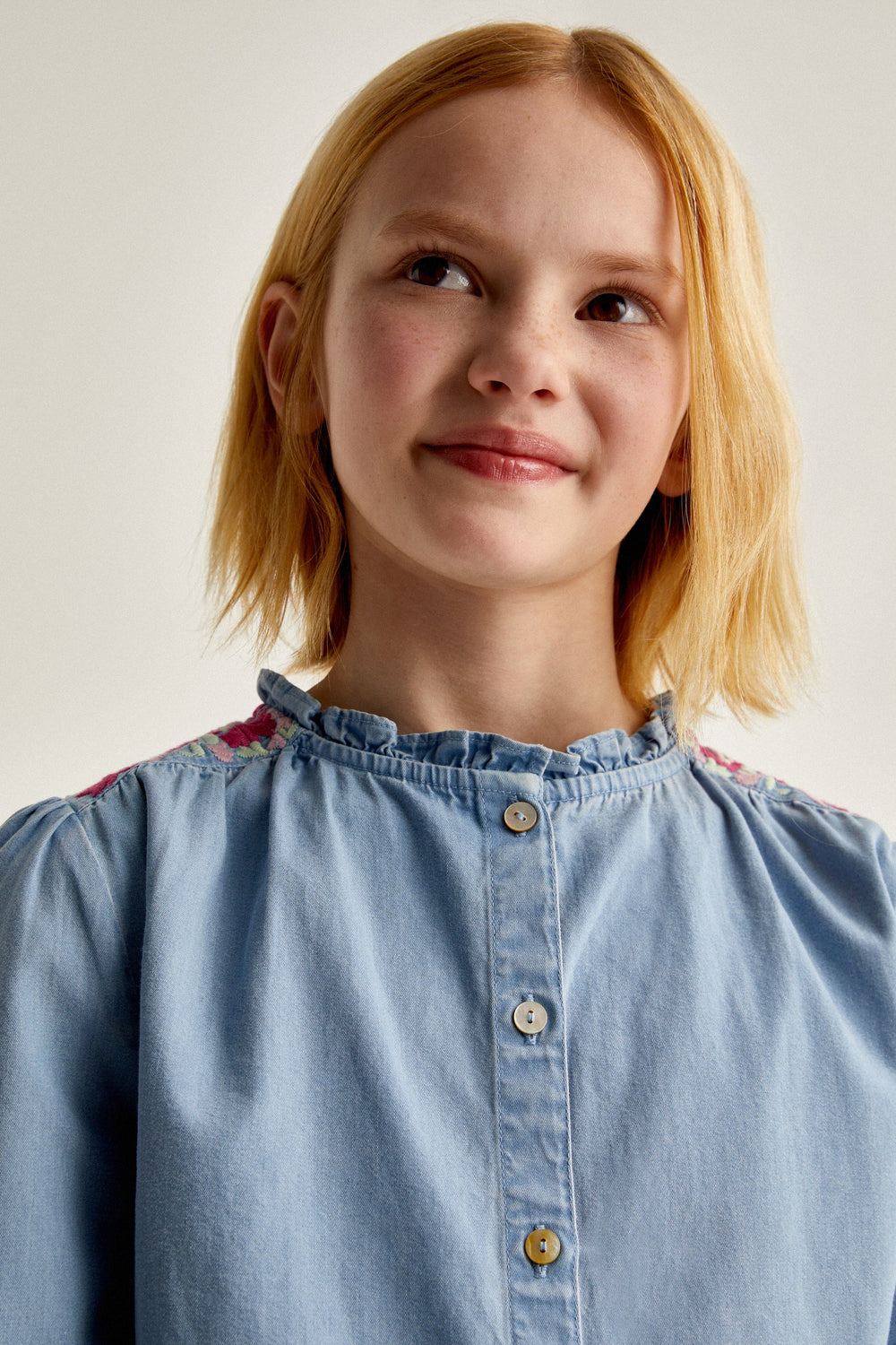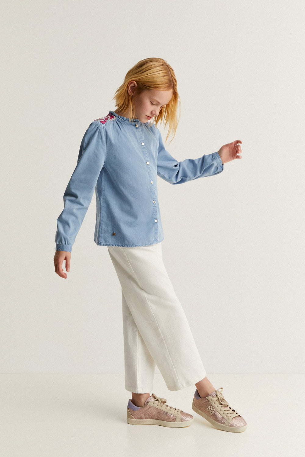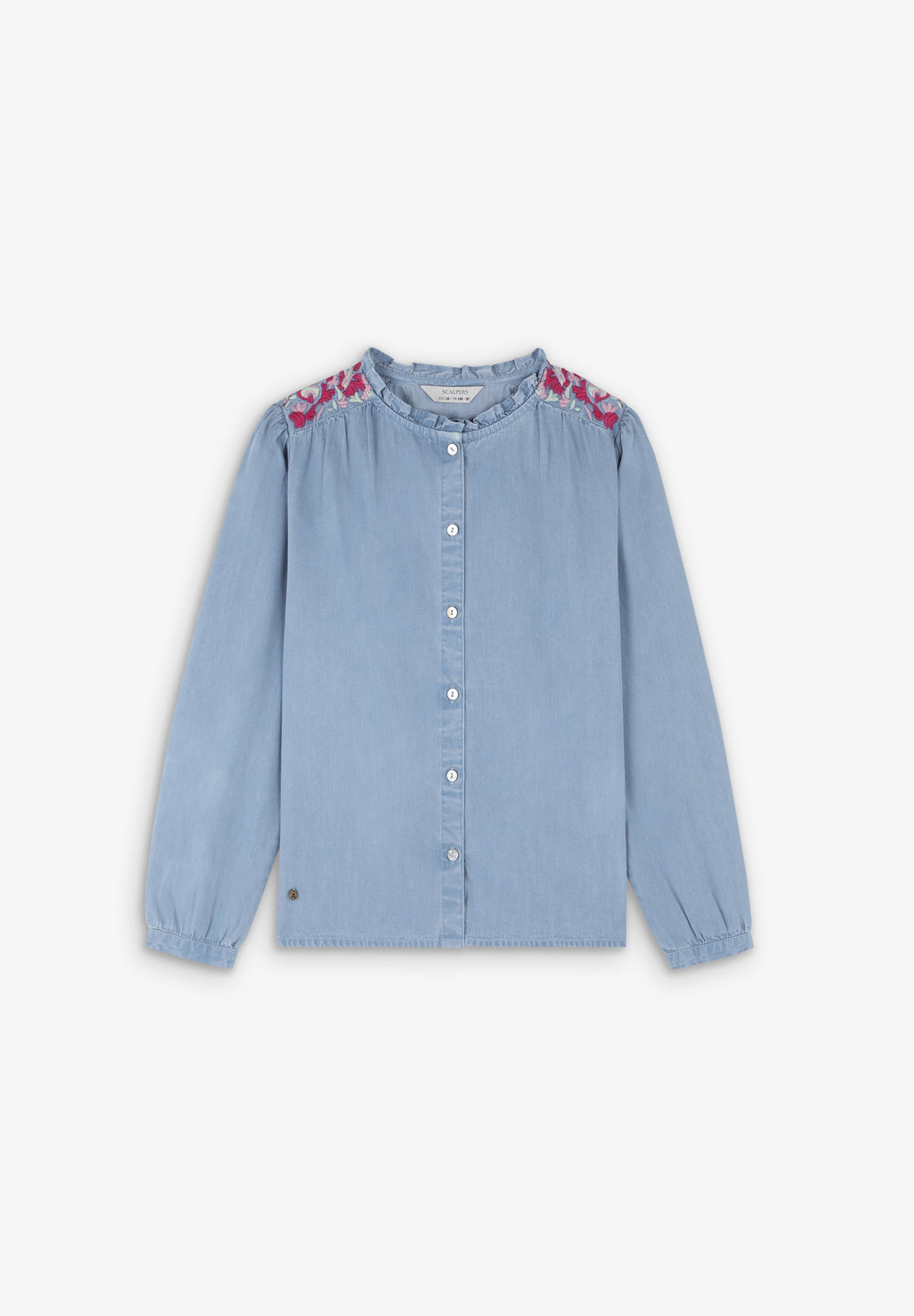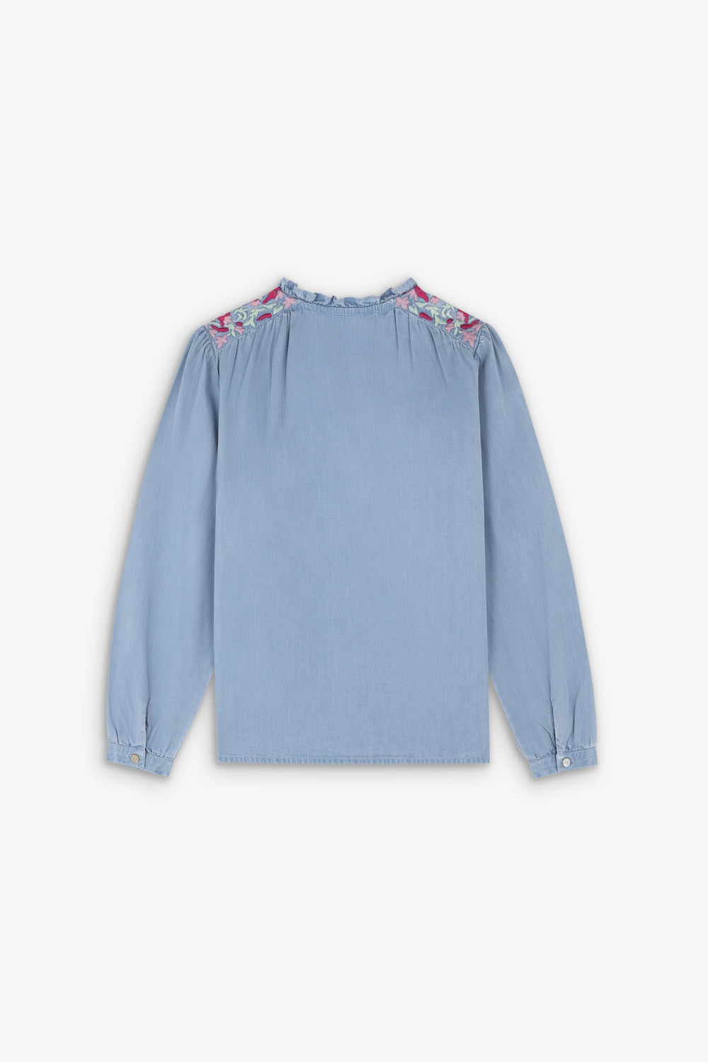 Contrast embroidery denim blouse.