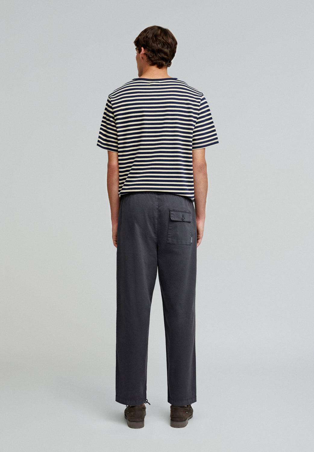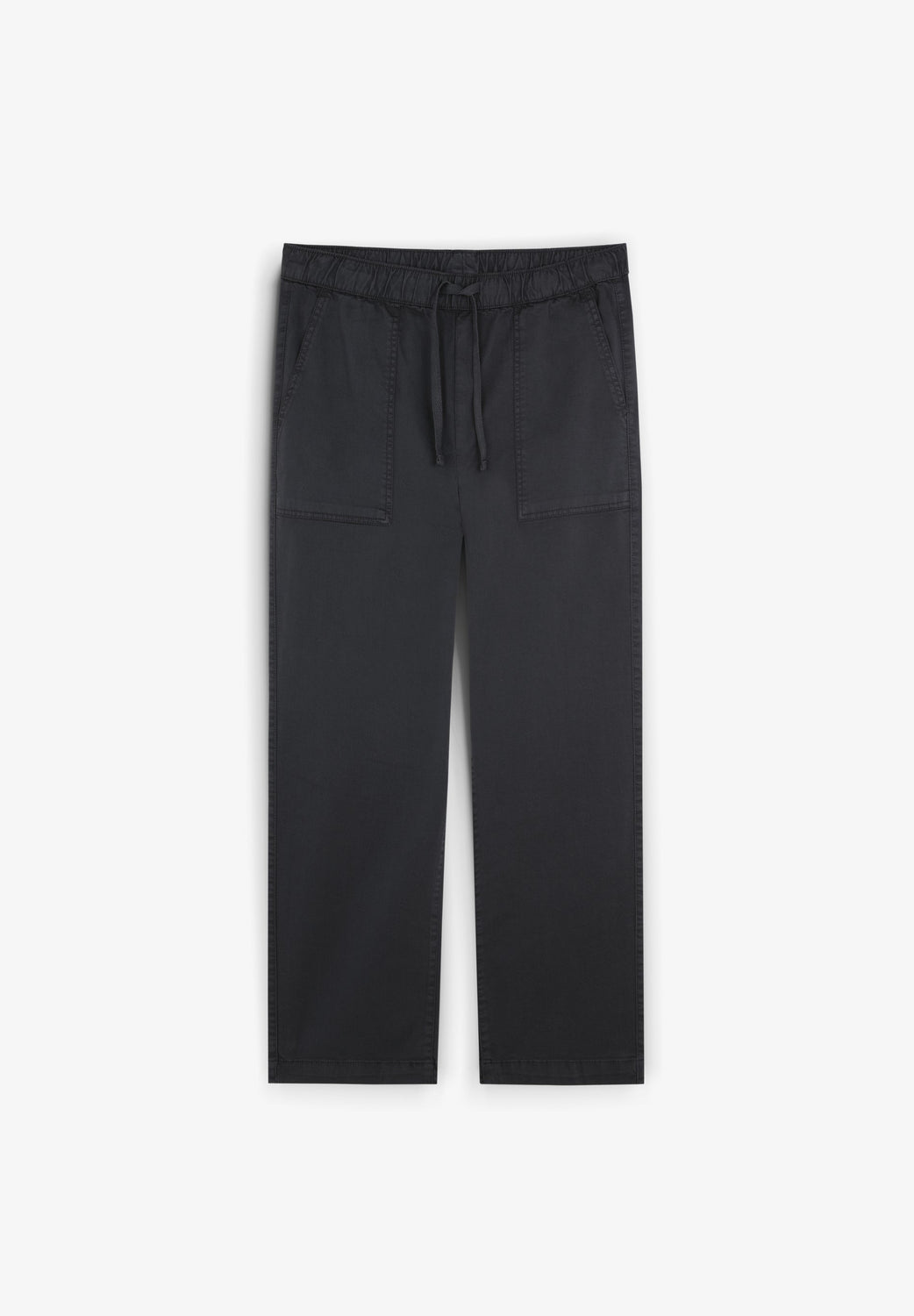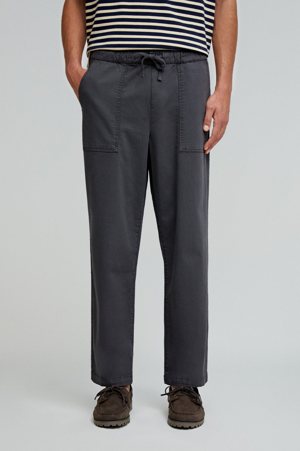 Trousers made of slightly stretchy cotton. Relaxed fit with elasticated waistband. Drawstring fastening. Side and back flap pockets.