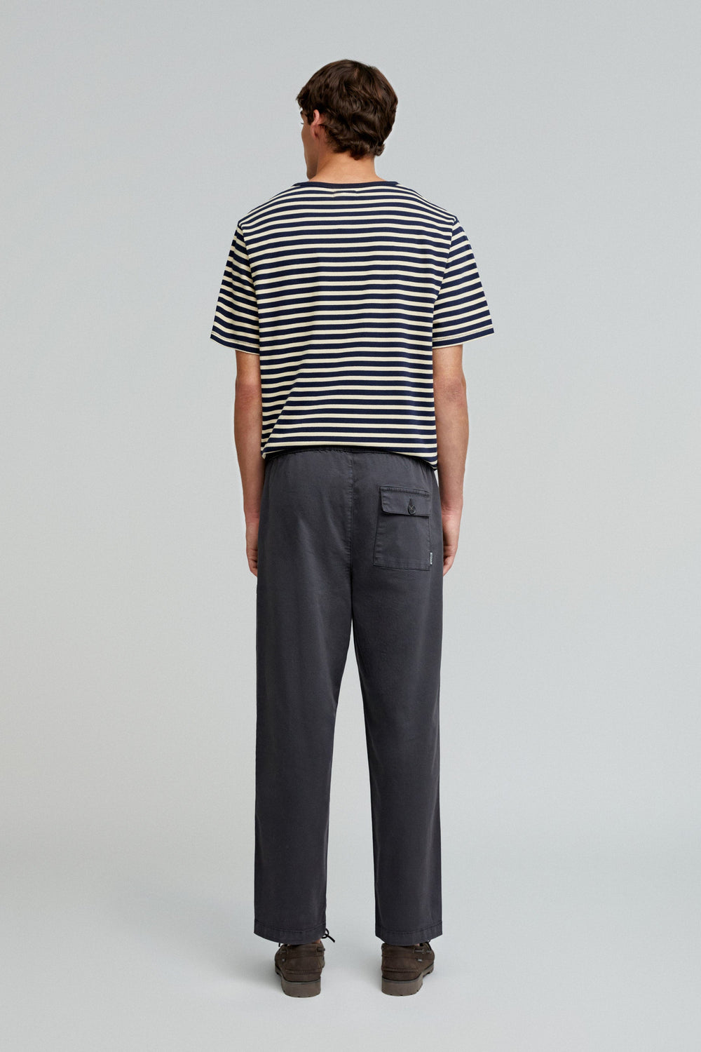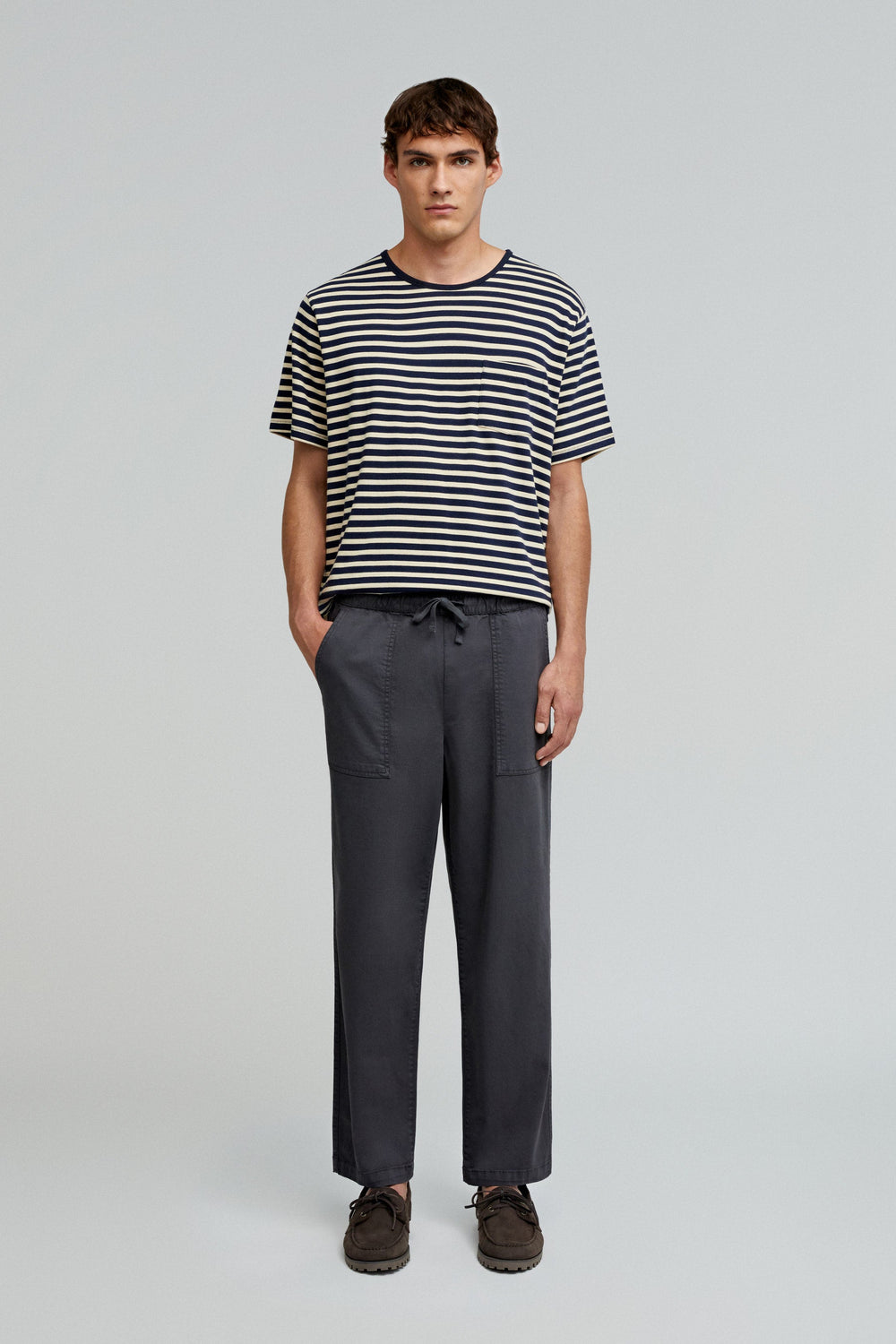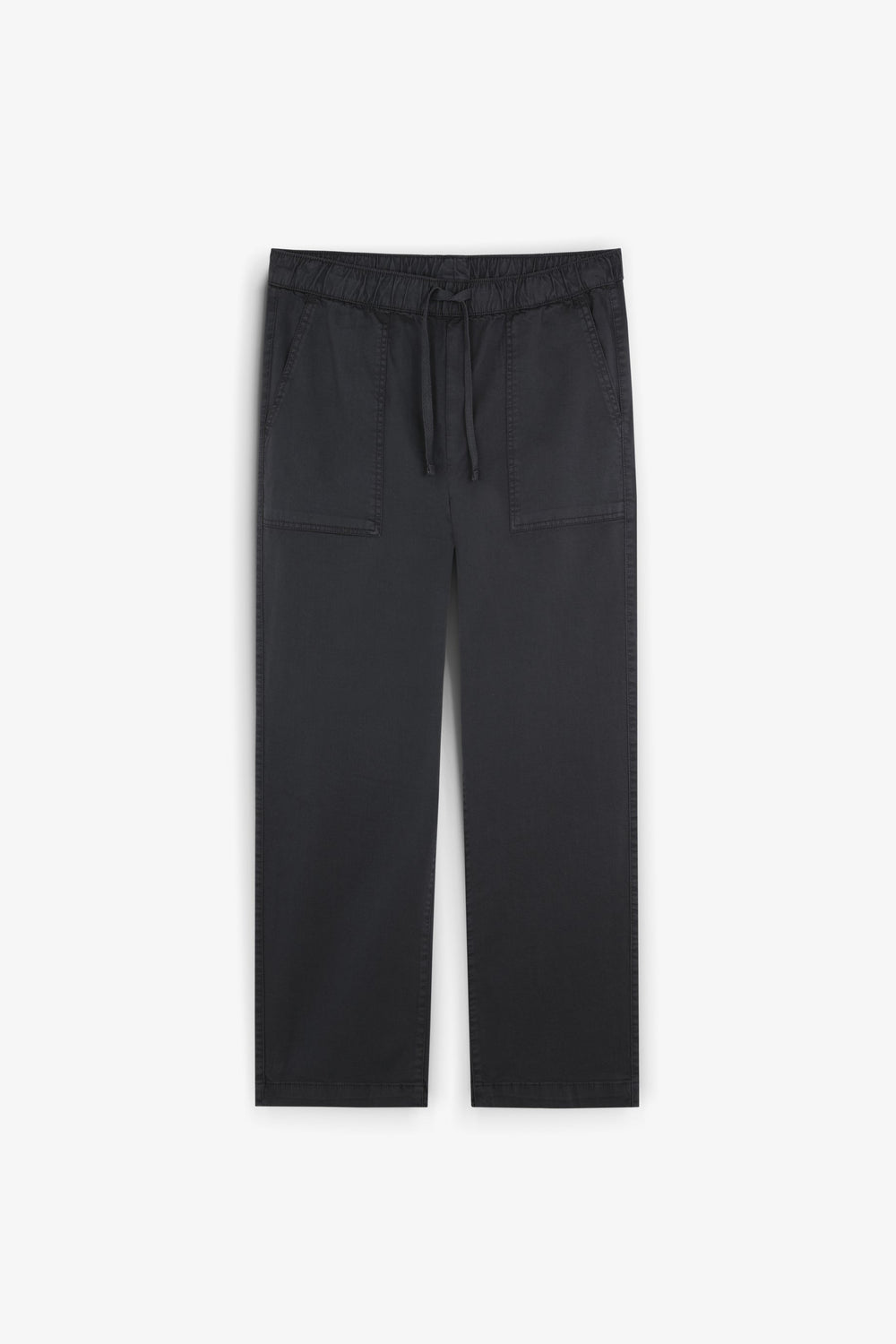 Trousers made of slightly stretchy cotton. Relaxed fit with elasticated waistband. Drawstring fastening. Side and back flap pockets.