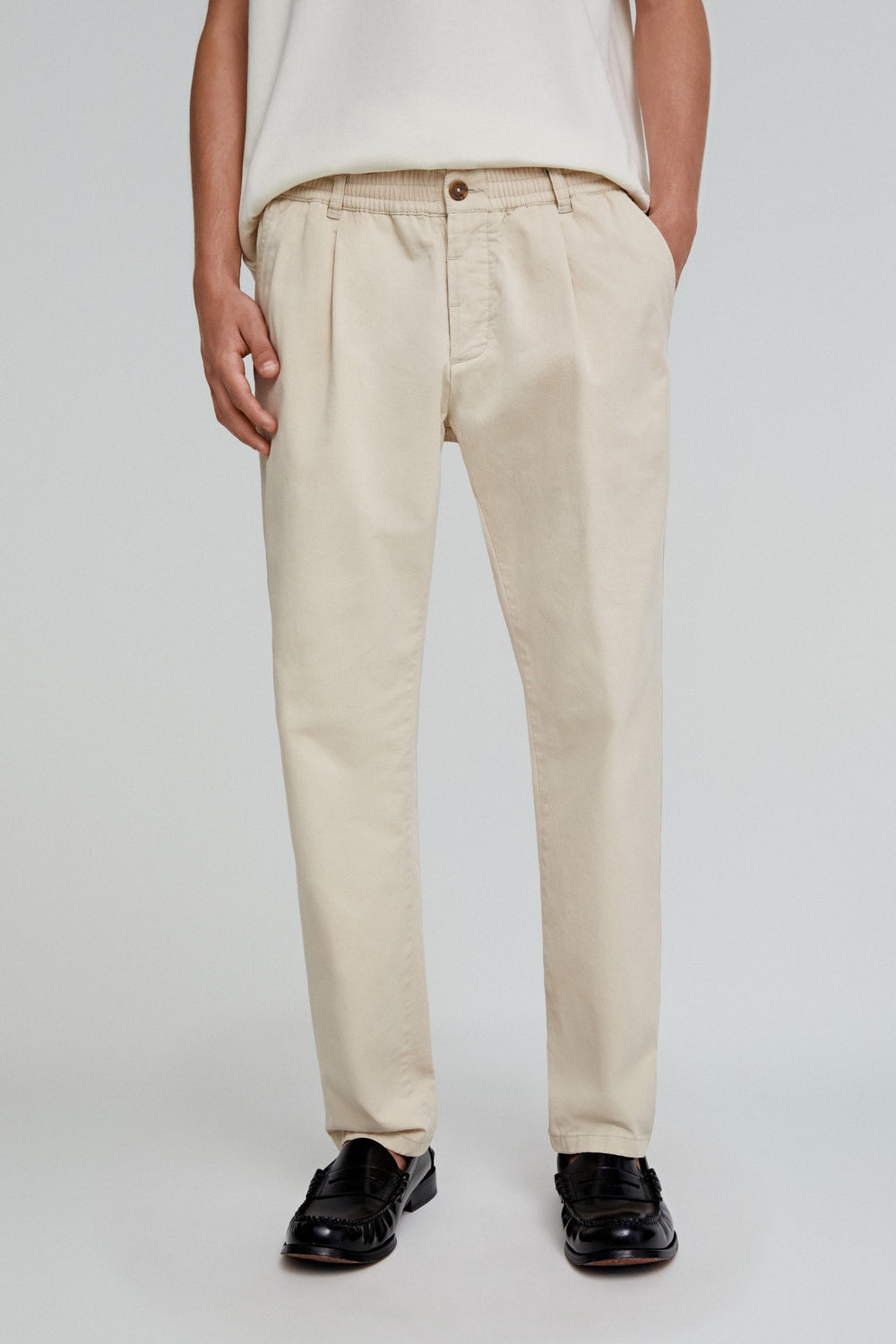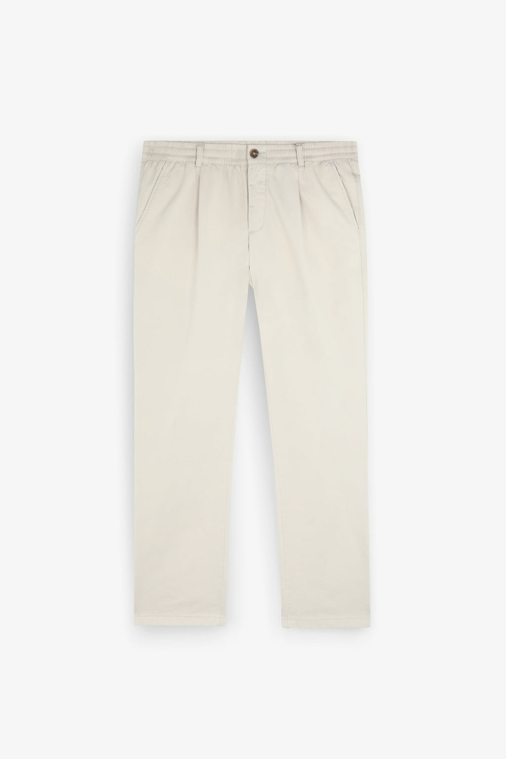 Trousers made of 100% cotton. Relaxed fit with darts, button fastening, side and back pockets.
