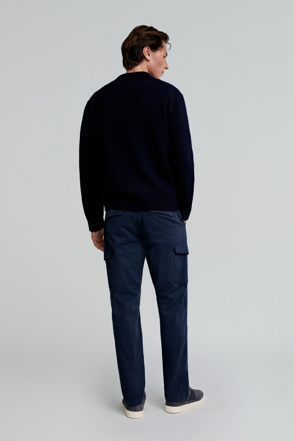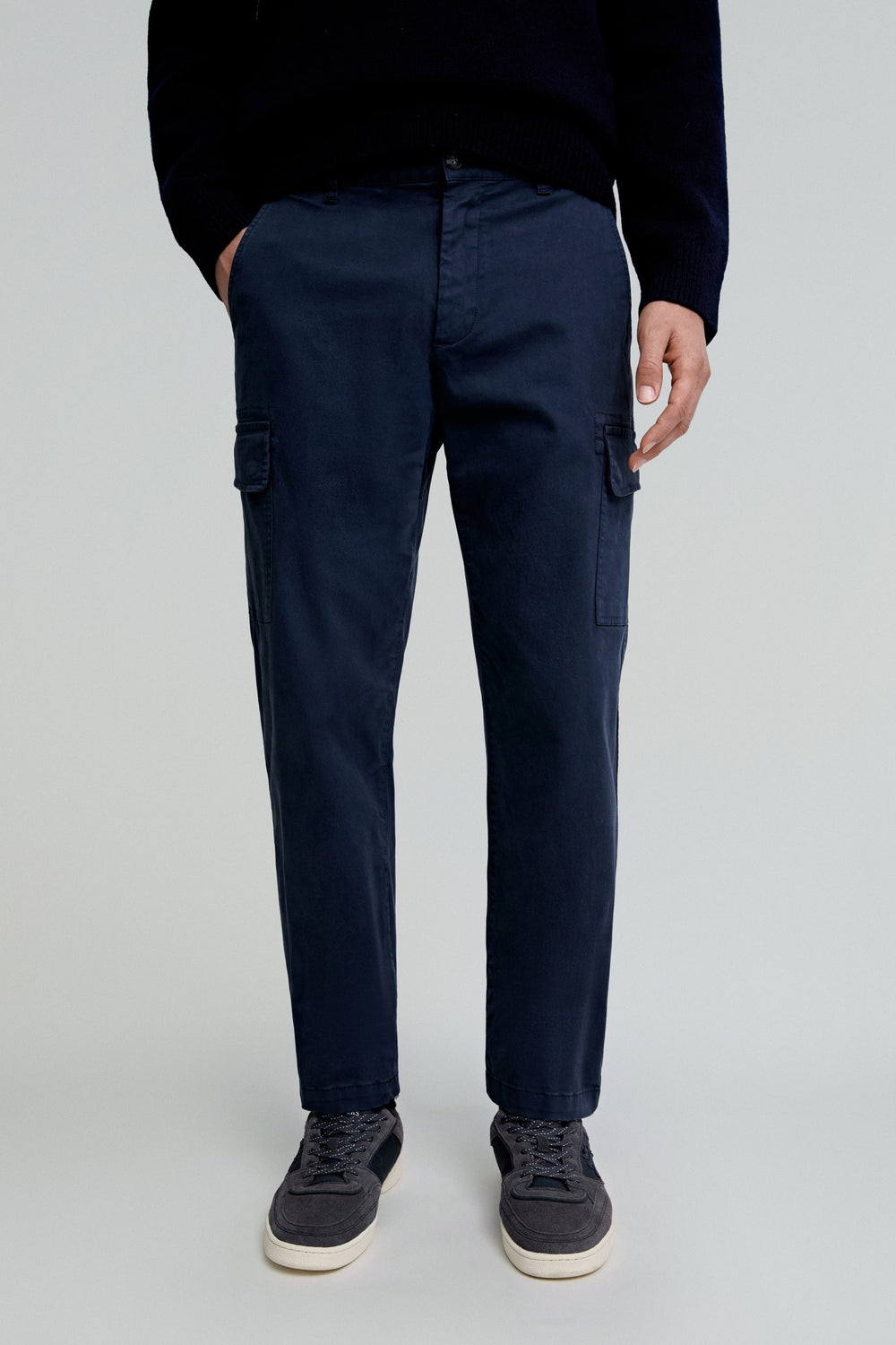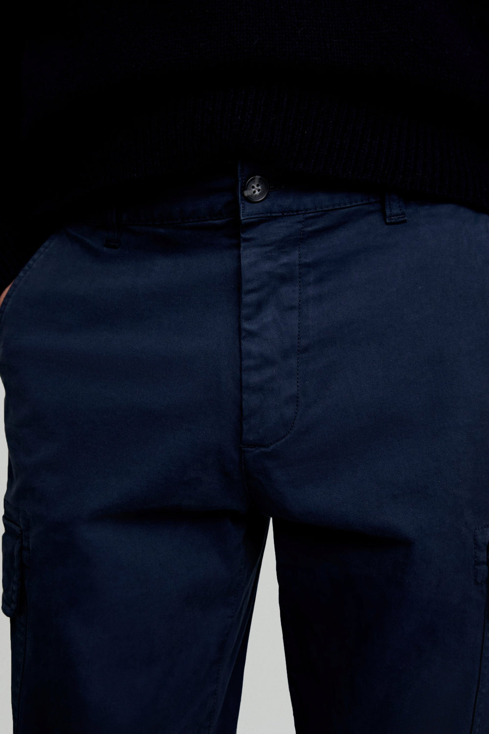 Cargo trousers made of slightly stretch fabric. Slim fit, zip and button fastening. Leg pockets with snap button flaps and back pockets. Belt loops at the waist.