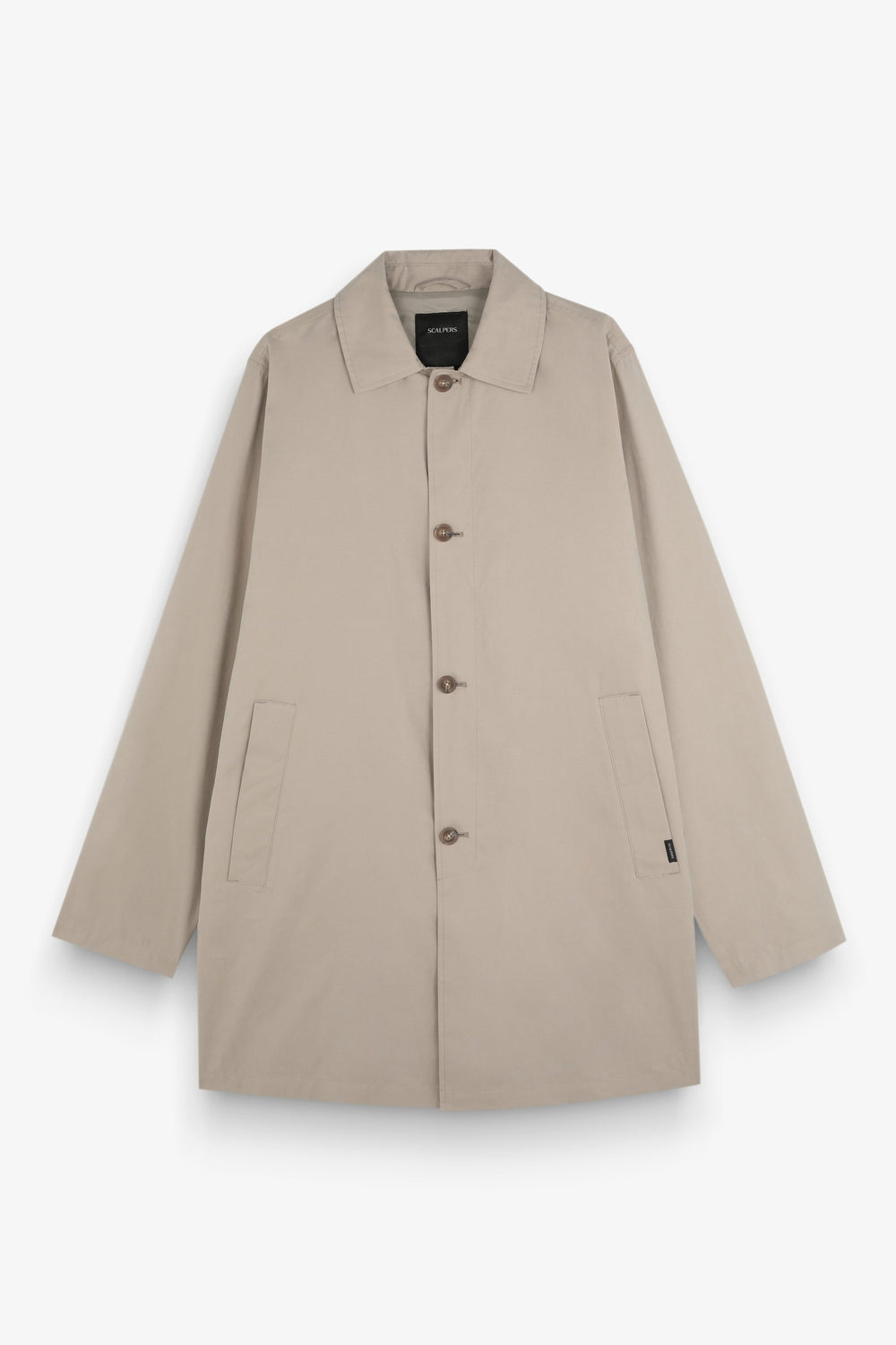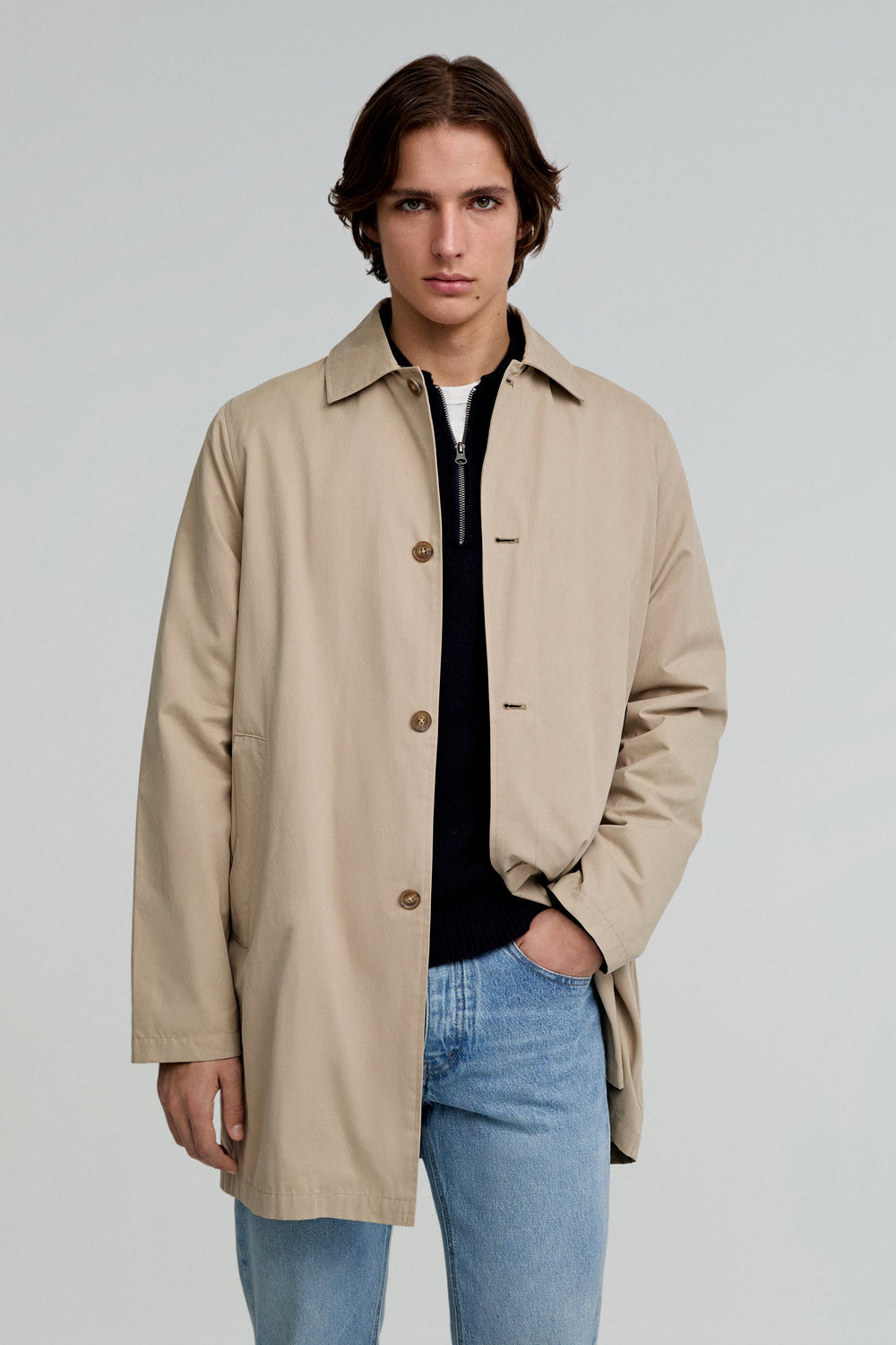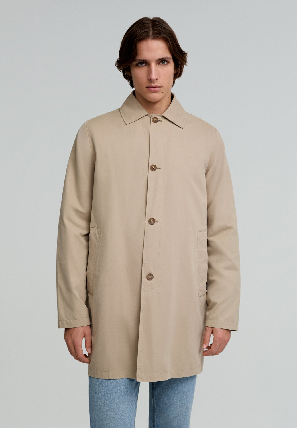 Trench coat made of technical fabric. Regular fit, classic collar and button fastening. Long sleeves and side pockets. Back vent and inner zipped pockets.