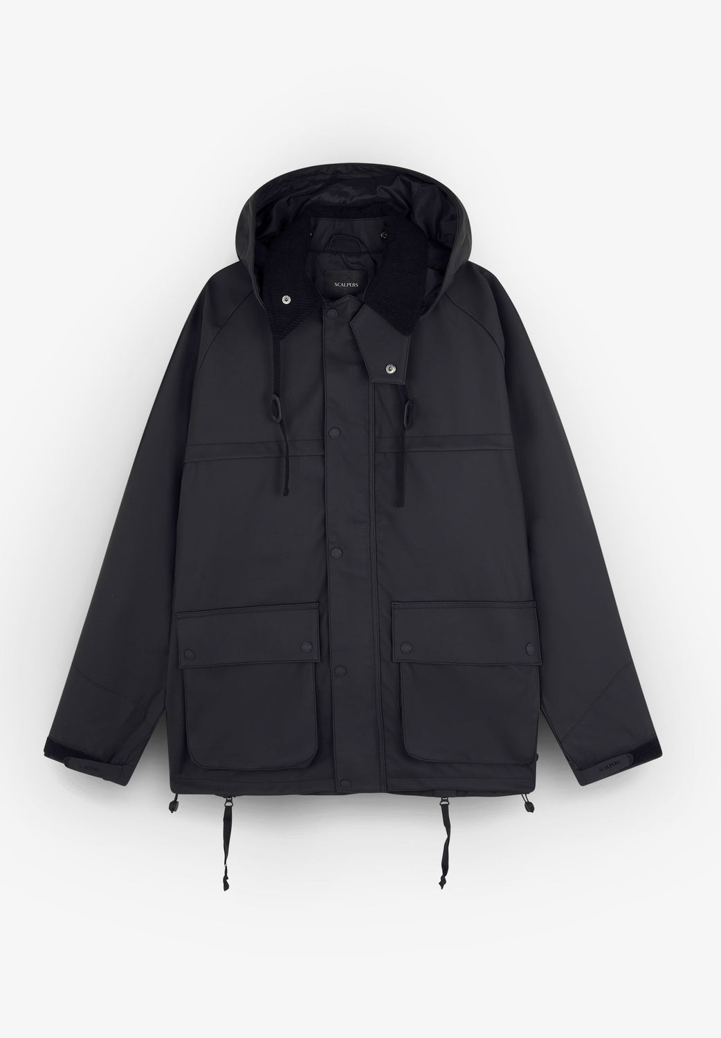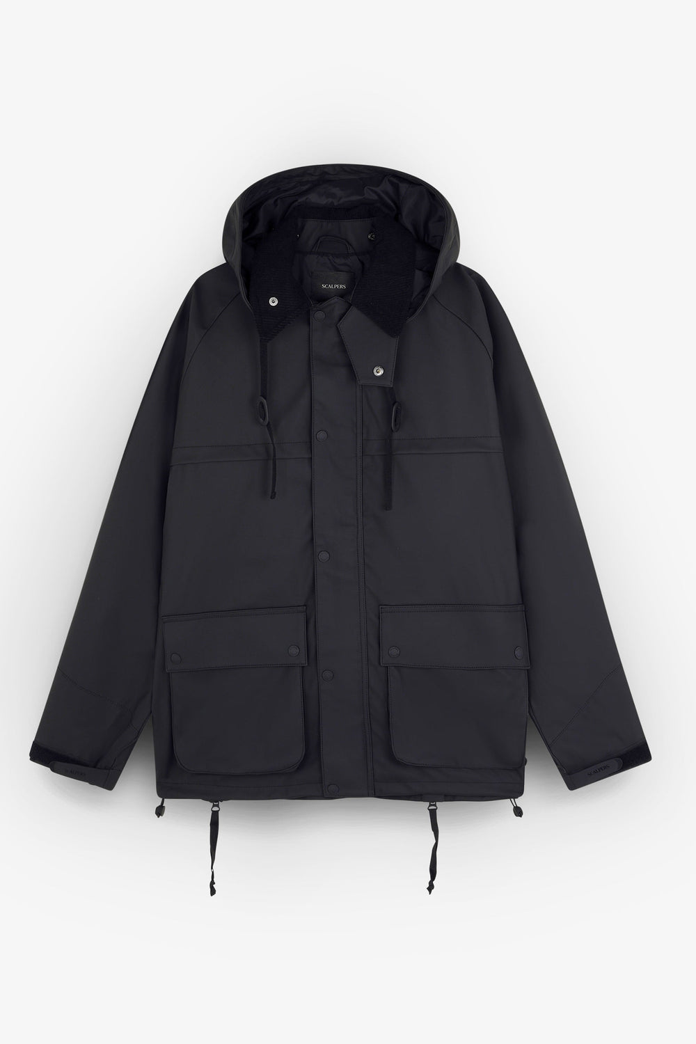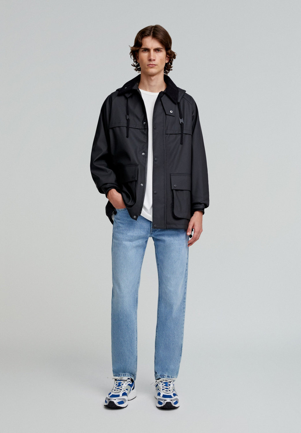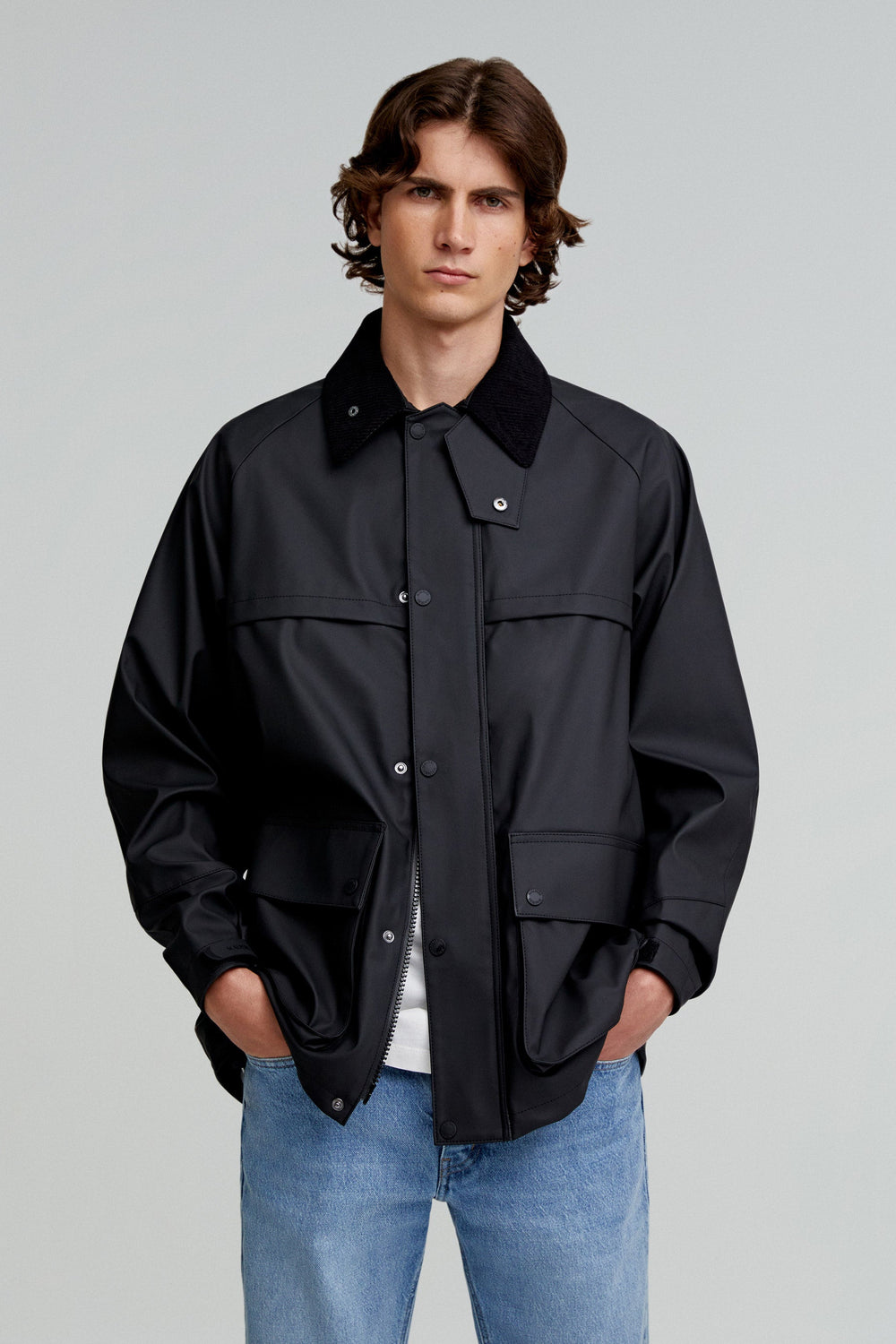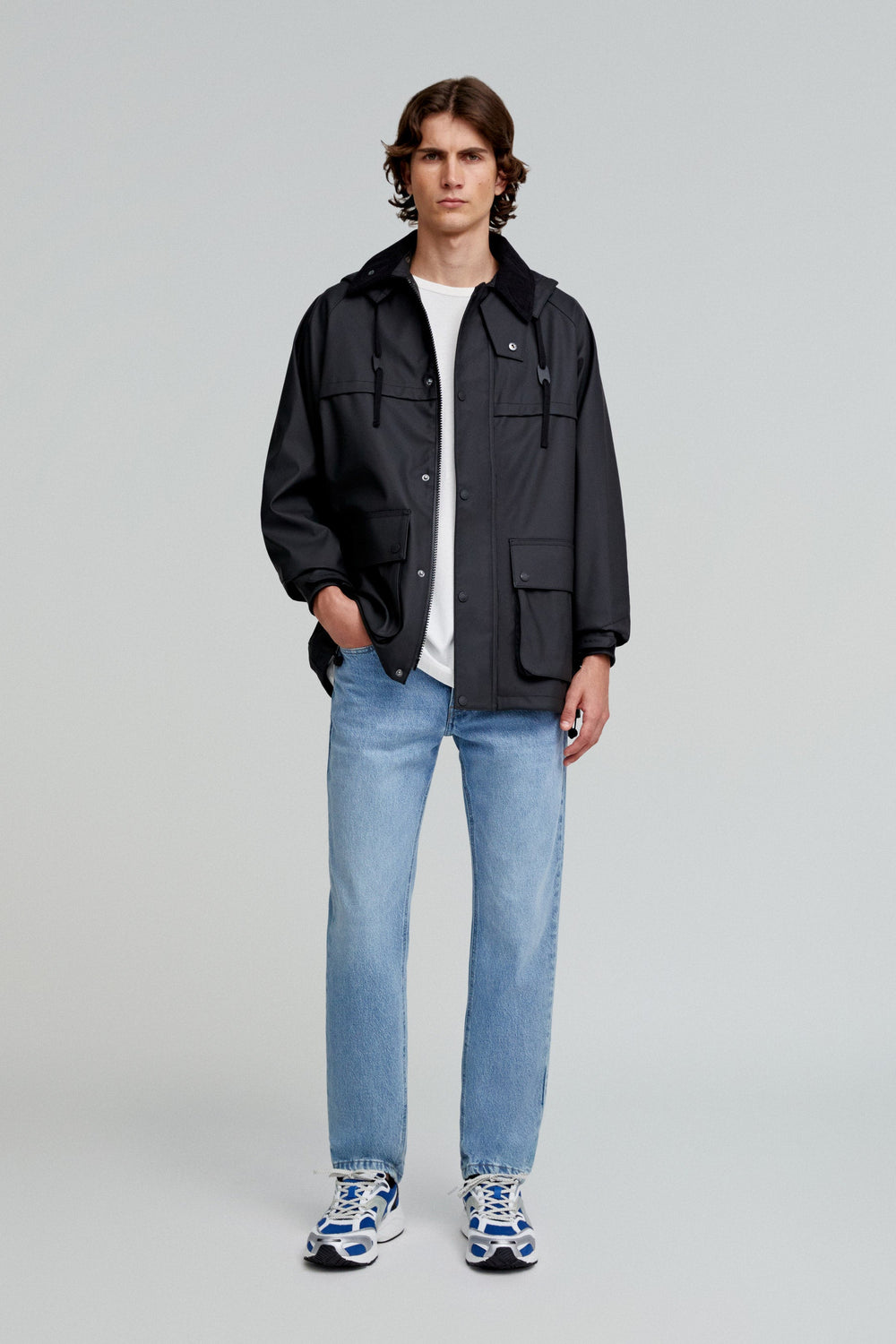 Jacket made of a technical fabric. Regular fit, classic collar in corduroy, with detachable hood and zip and snap button fastenings. Long sleeves with adjustable velcro cuffs. Front pockets with flaps and snap buttons. Back zips and adjustable hem.