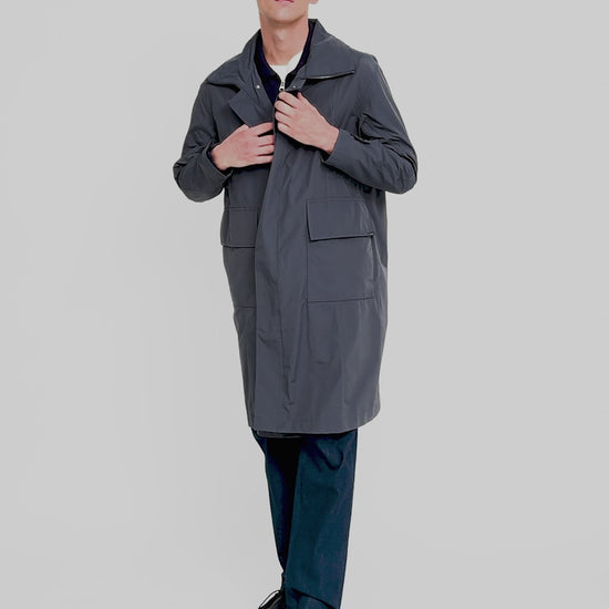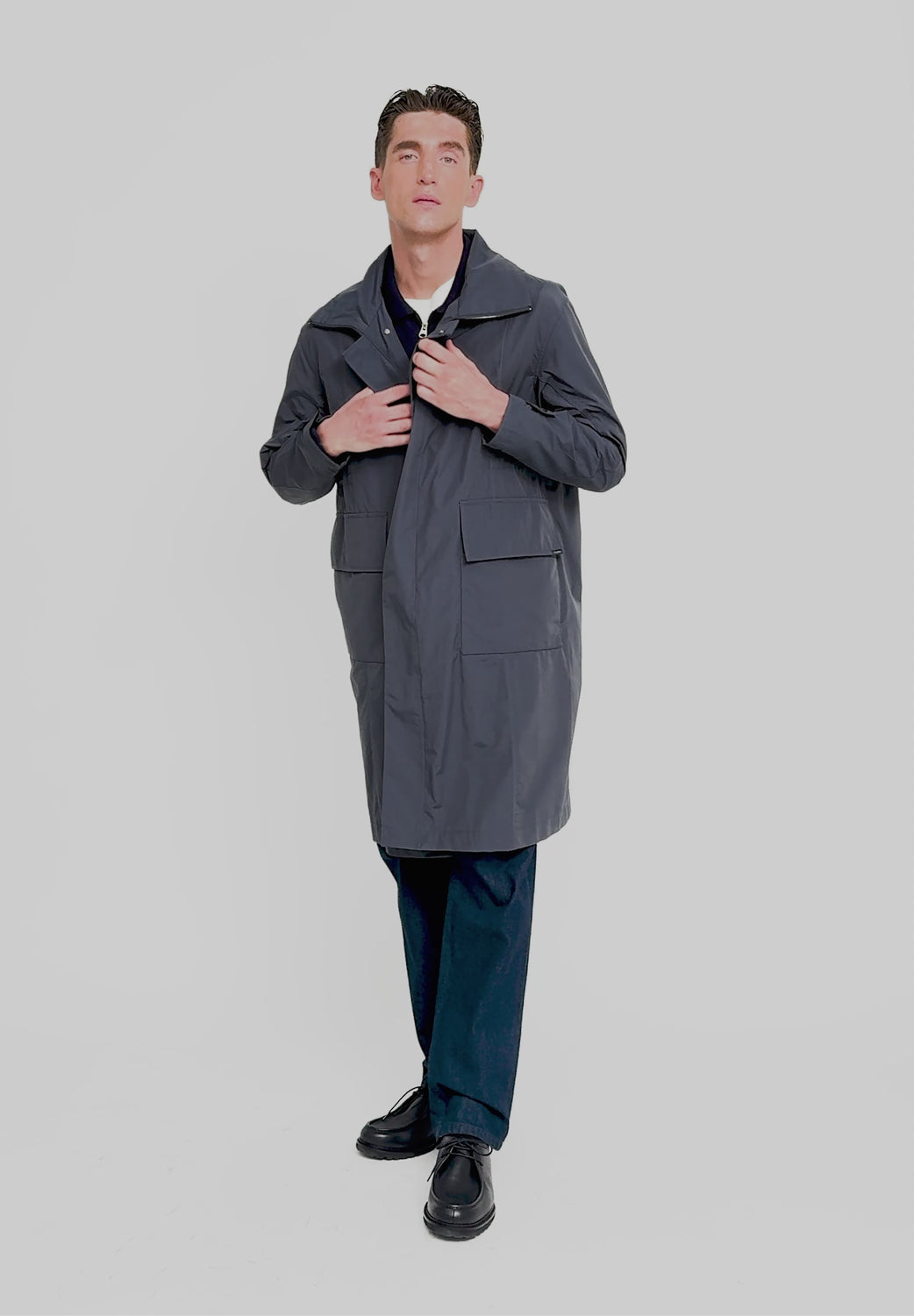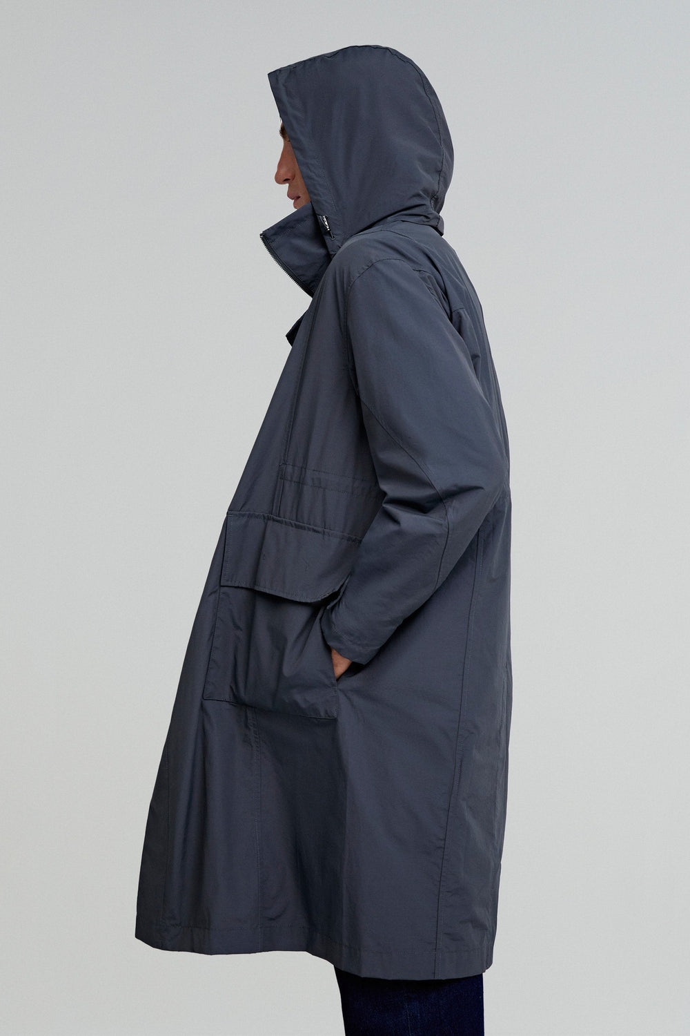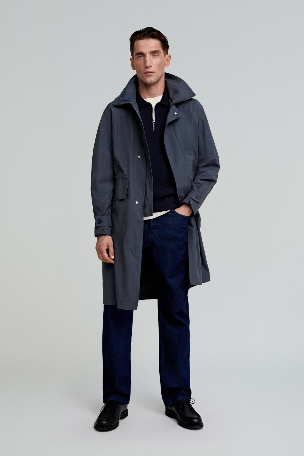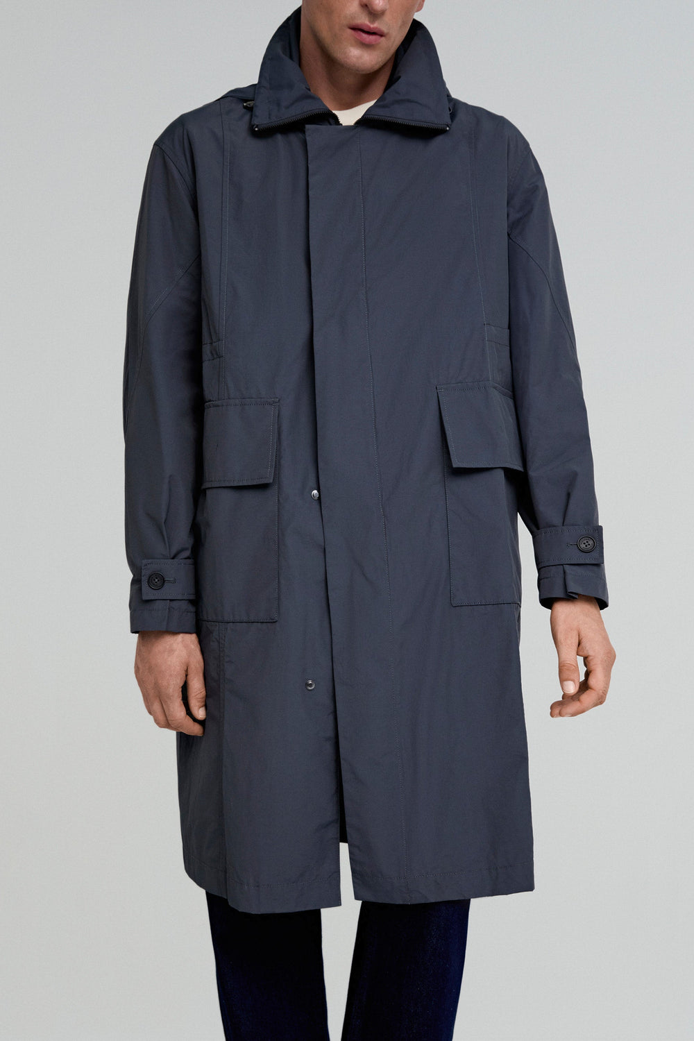 Long parka made of a cotton blend and technical fabric. Regular fit, classic collar, detachable hood and zip fastening. Long sleeves with buttoned cuffs. Back openings and flap pockets.