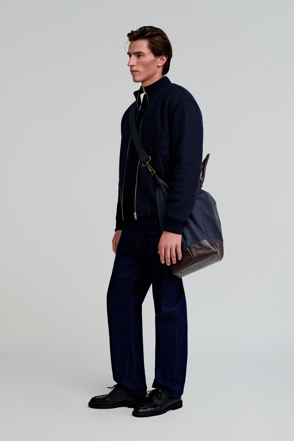 Travel bag made of a technical fabric. Zip fastening, short handles, long detachable strap and leather detail. Inner pocket.