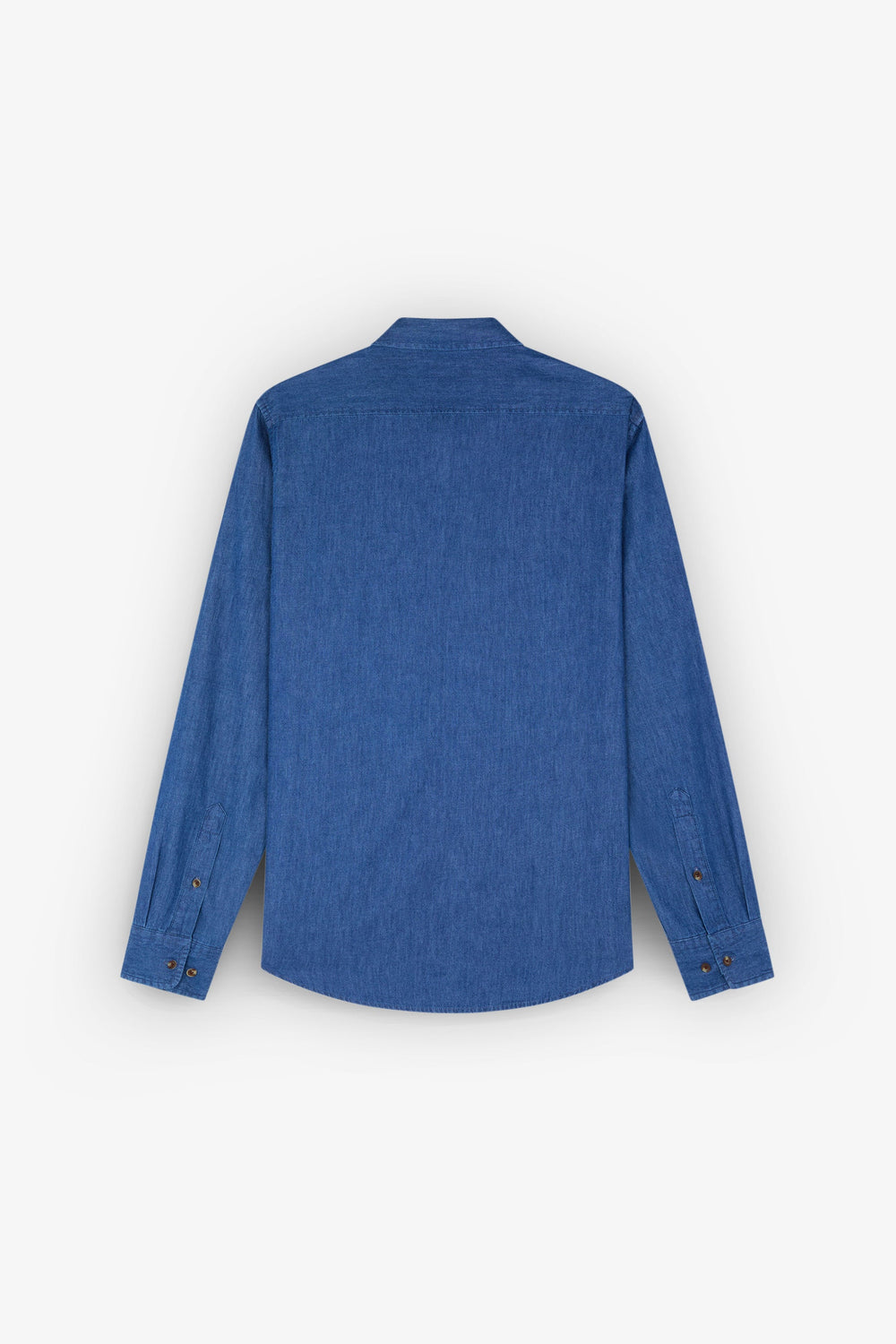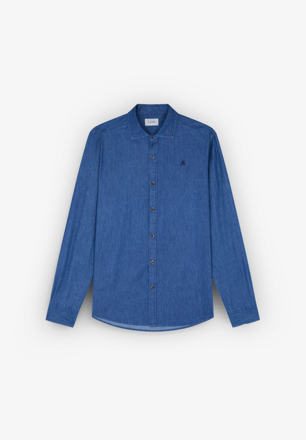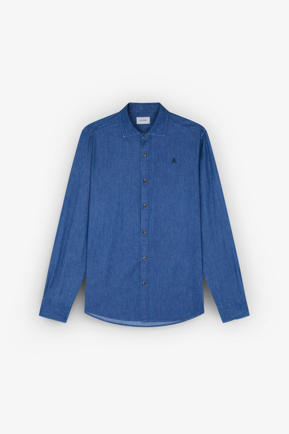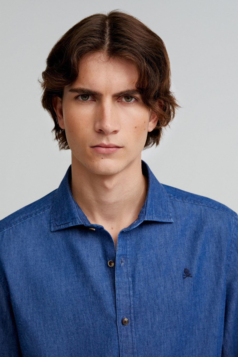 Denim shirt made of 100% BCI cotton. Regular fit, cutaway collar and button fastening. Long sleeves with buttoned cuffs and contrast skull.