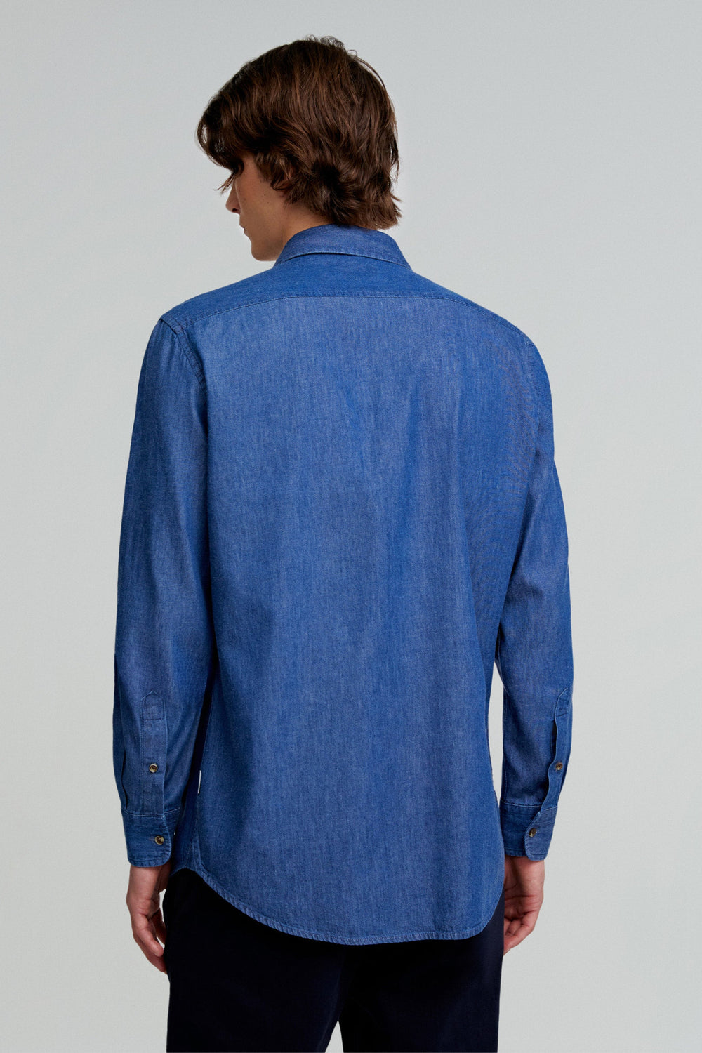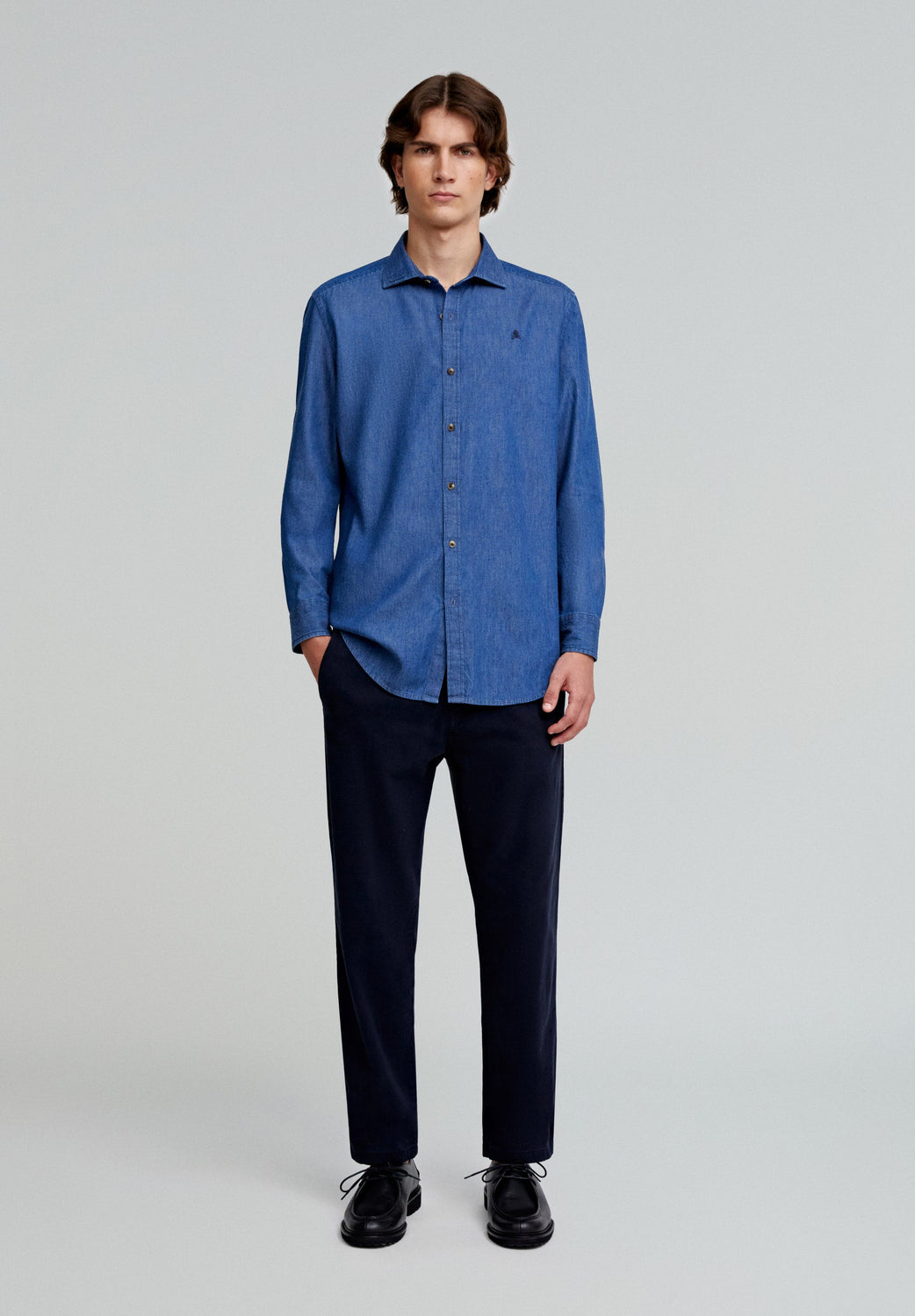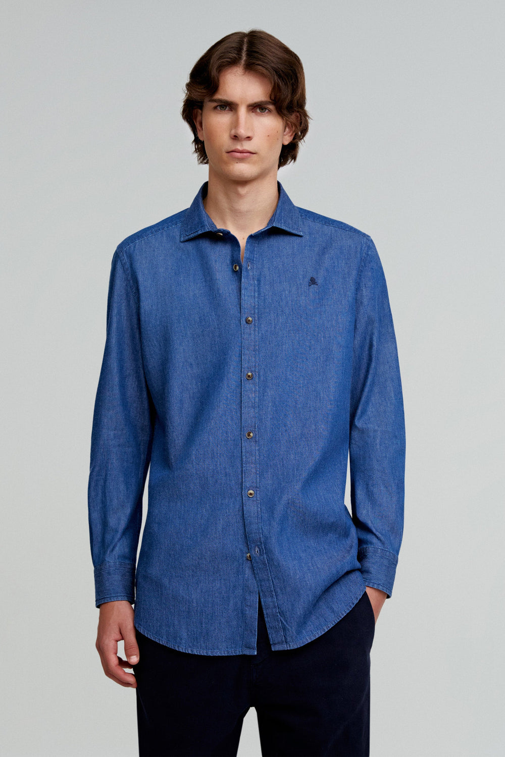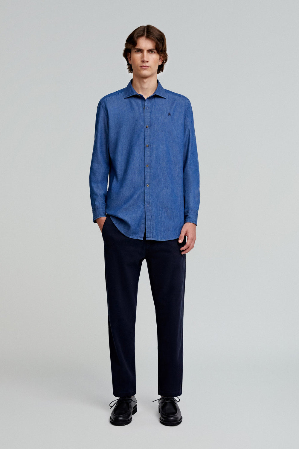 Denim shirt made of 100% BCI cotton. Regular fit, cutaway collar and button fastening. Long sleeves with buttoned cuffs and contrast skull.