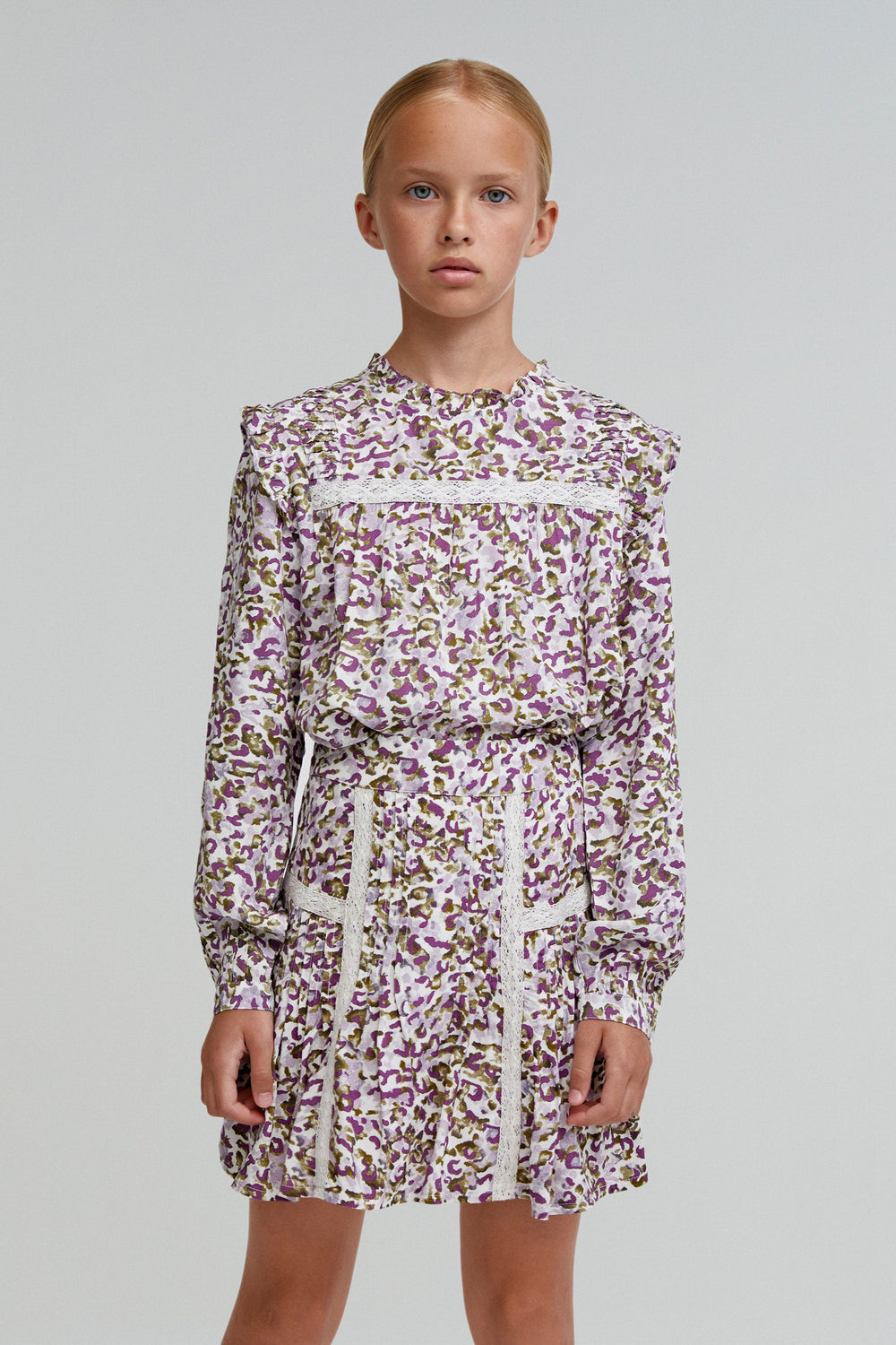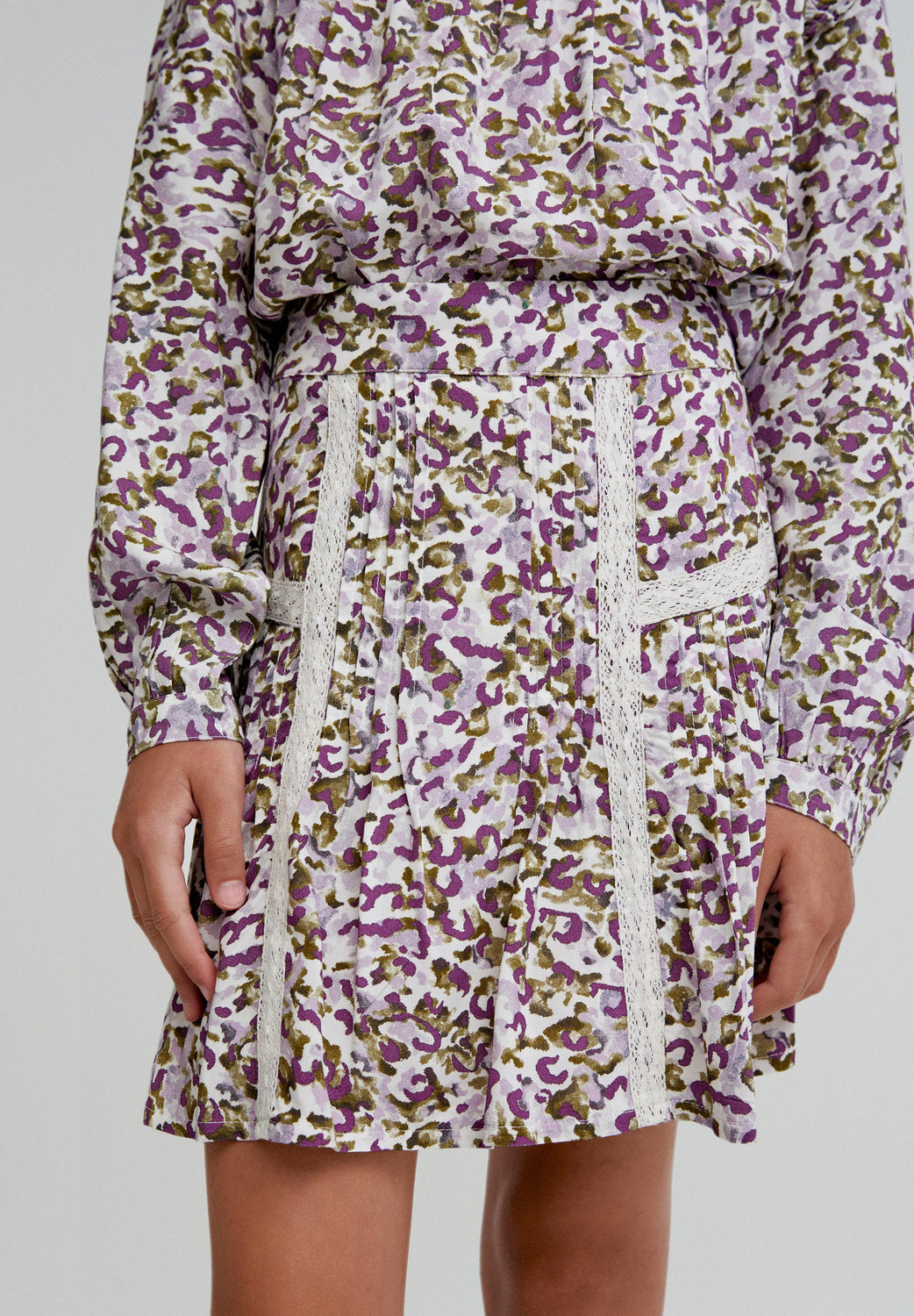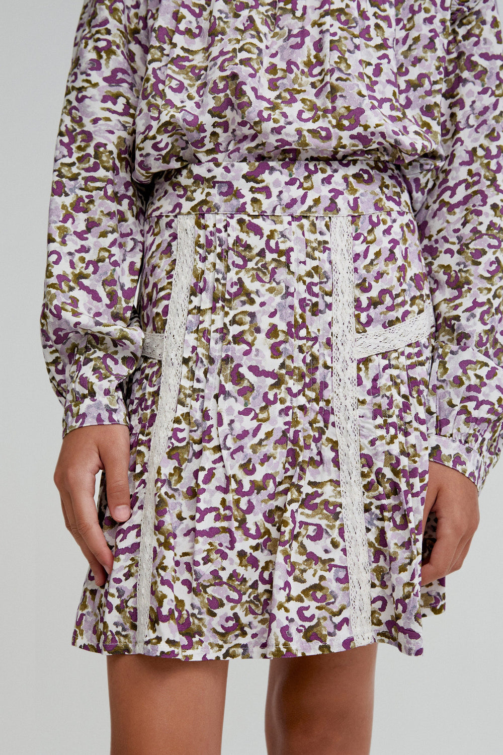 Printed mini skirt made of flowing fabric. Regular fit, zip fastening. Pintuck detail and lace.