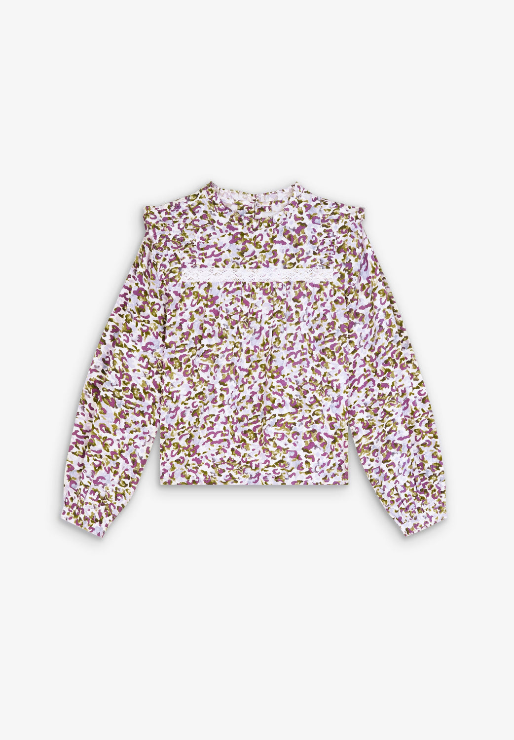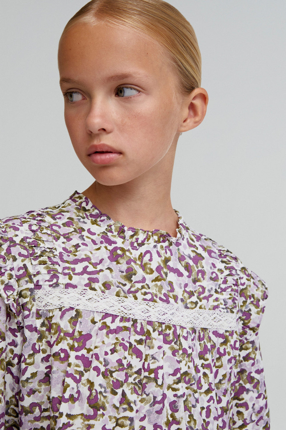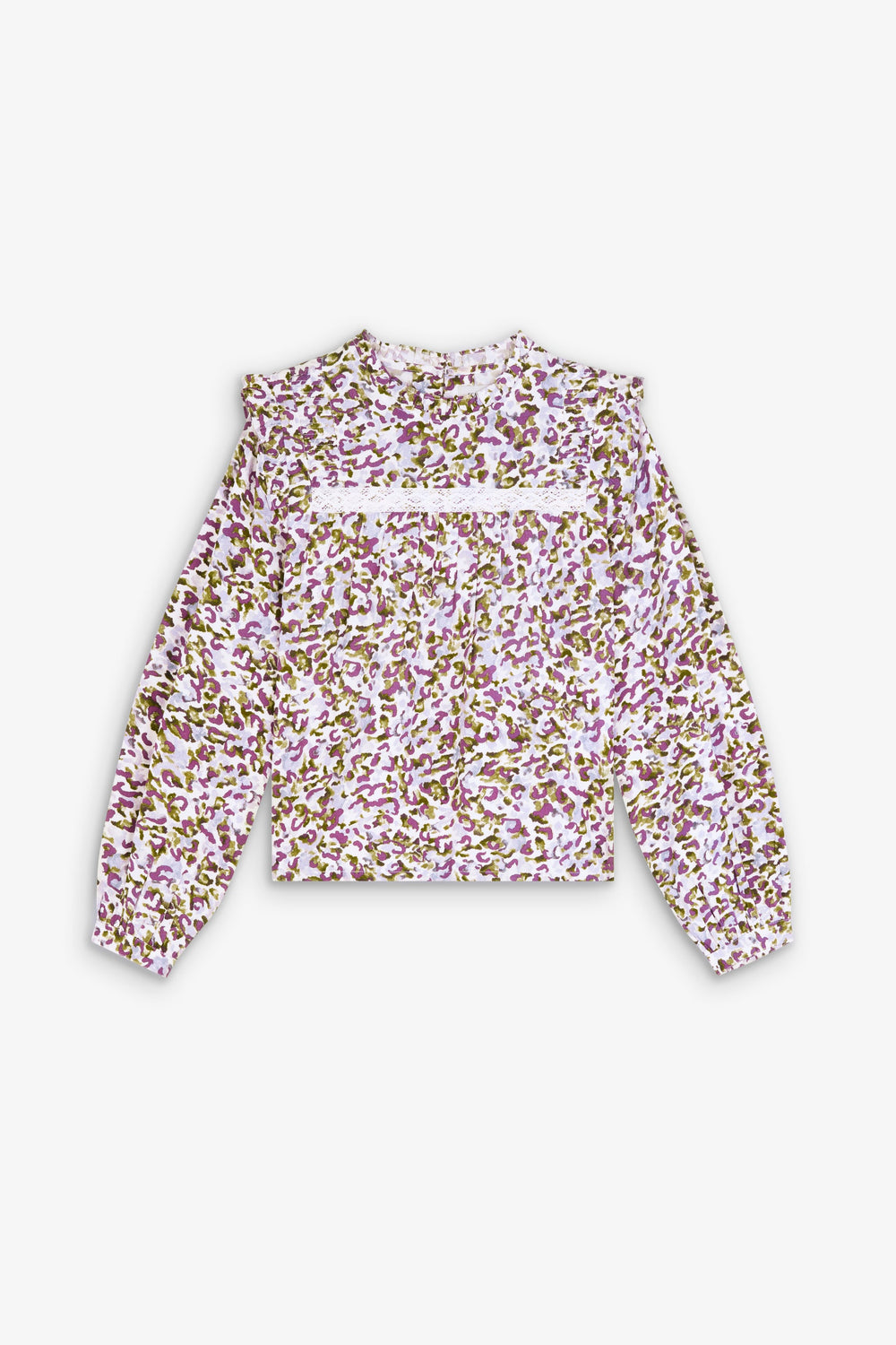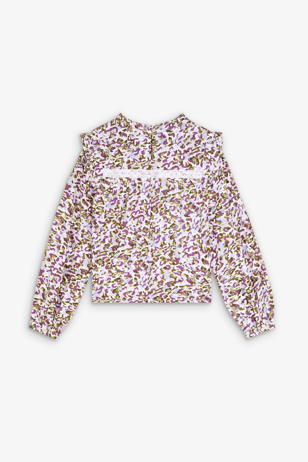 Printed blouse made of flowing fabric. Regular fit, round neck and back button fastening. Long sleeves with ruffle on the shoulder and lace and pintuck detail
