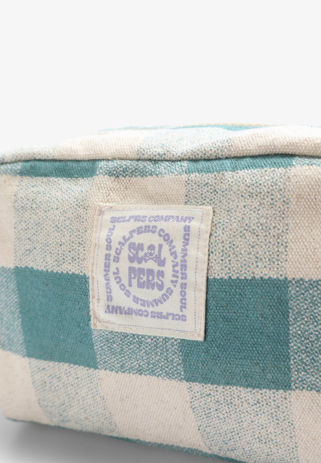 Check toiletry bag made of a cotton blend. Zip closure and side handle. Front label.